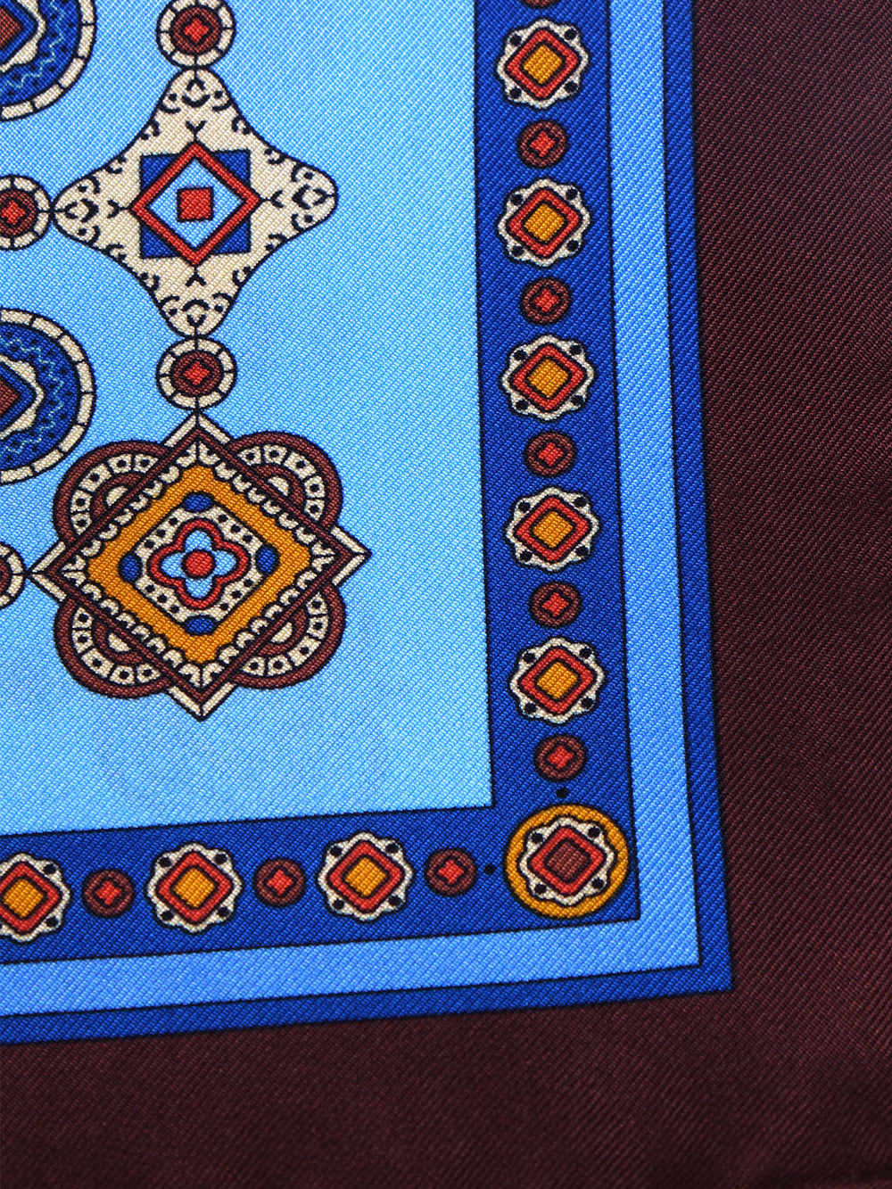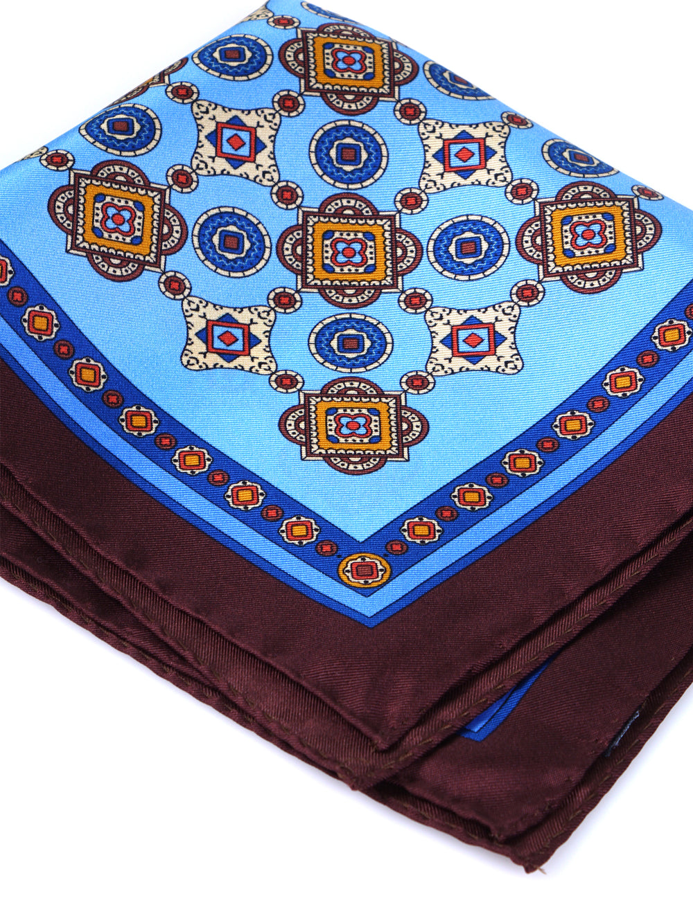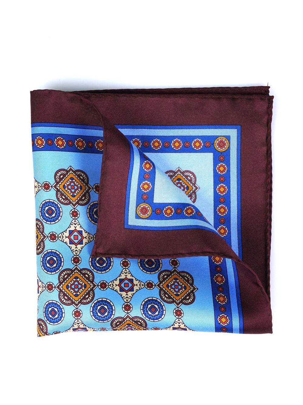 Un accessorio che è un'esplosione di colore e di stile, il pezzo forte per l'uomo che ama i dettagli che fanno la differenza. Questo fazzoletto da taschino è realizzato in purissima seta stampata italiana, un tessuto dalla lucentezza ricca e dalla mano morbida e scivolosa. Il suo design, ispirato alle antiche maioliche, presenta un motivo geometrico e floreale su un vibrante fondo azzurro. La ricca palette di colori, che unisce il rosso, l'ocra e il blu, è incorniciata da un elegante bordo marrone scuro. Questa doppia anima lo rende incredibilmente versatile, permettendo di creare effetti sempre nuovi a seconda di come viene piegato nel taschino.