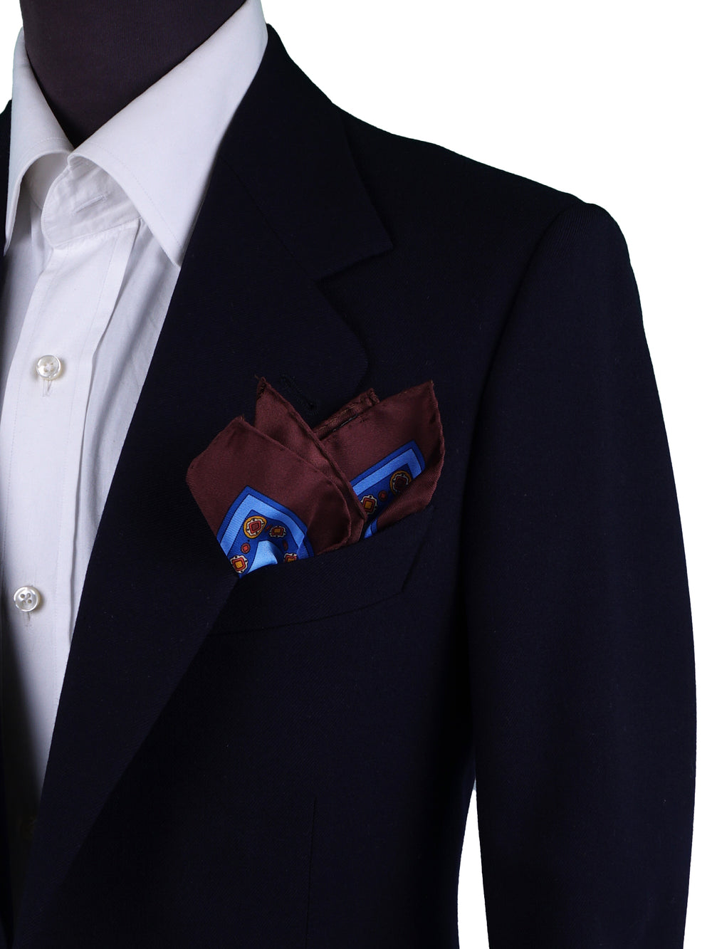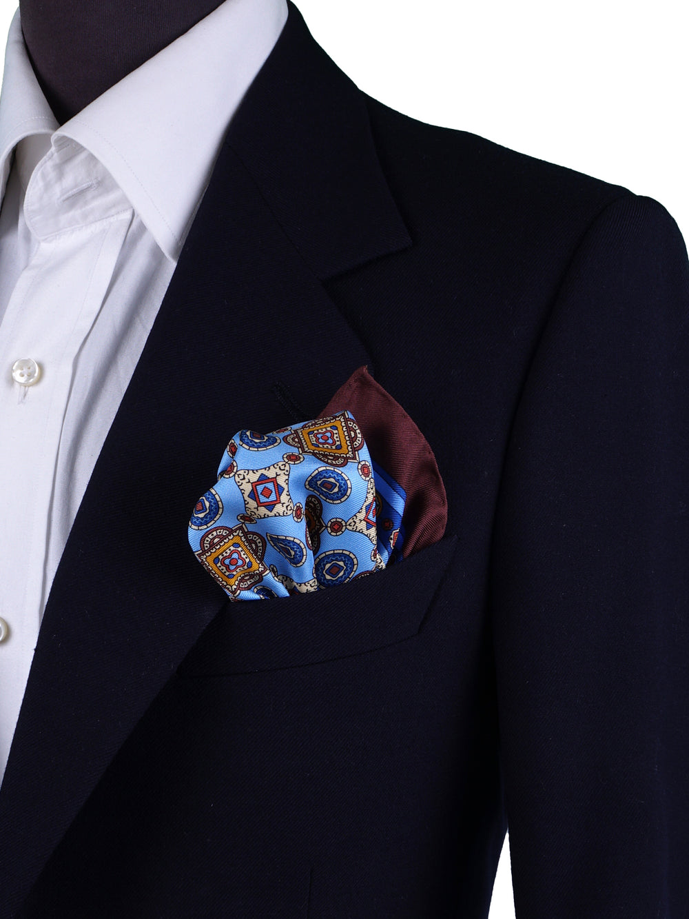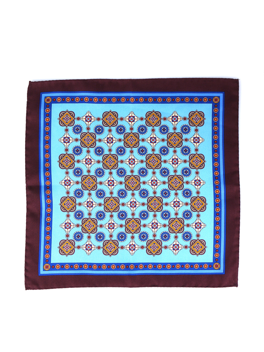 Un accessorio che è un'esplosione di colore e di stile, il pezzo forte per l'uomo che ama i dettagli che fanno la differenza. Questo fazzoletto da taschino è realizzato in purissima seta stampata italiana, un tessuto dalla lucentezza ricca e dalla mano morbida e scivolosa. Il suo design, ispirato alle antiche maioliche, presenta un motivo geometrico e floreale su un vibrante fondo azzurro. La ricca palette di colori, che unisce il rosso, l'ocra e il blu, è incorniciata da un elegante bordo marrone scuro. Questa doppia anima lo rende incredibilmente versatile, permettendo di creare effetti sempre nuovi a seconda di come viene piegato nel taschino.