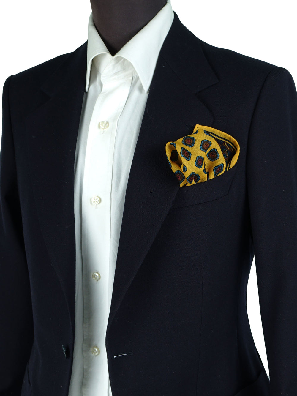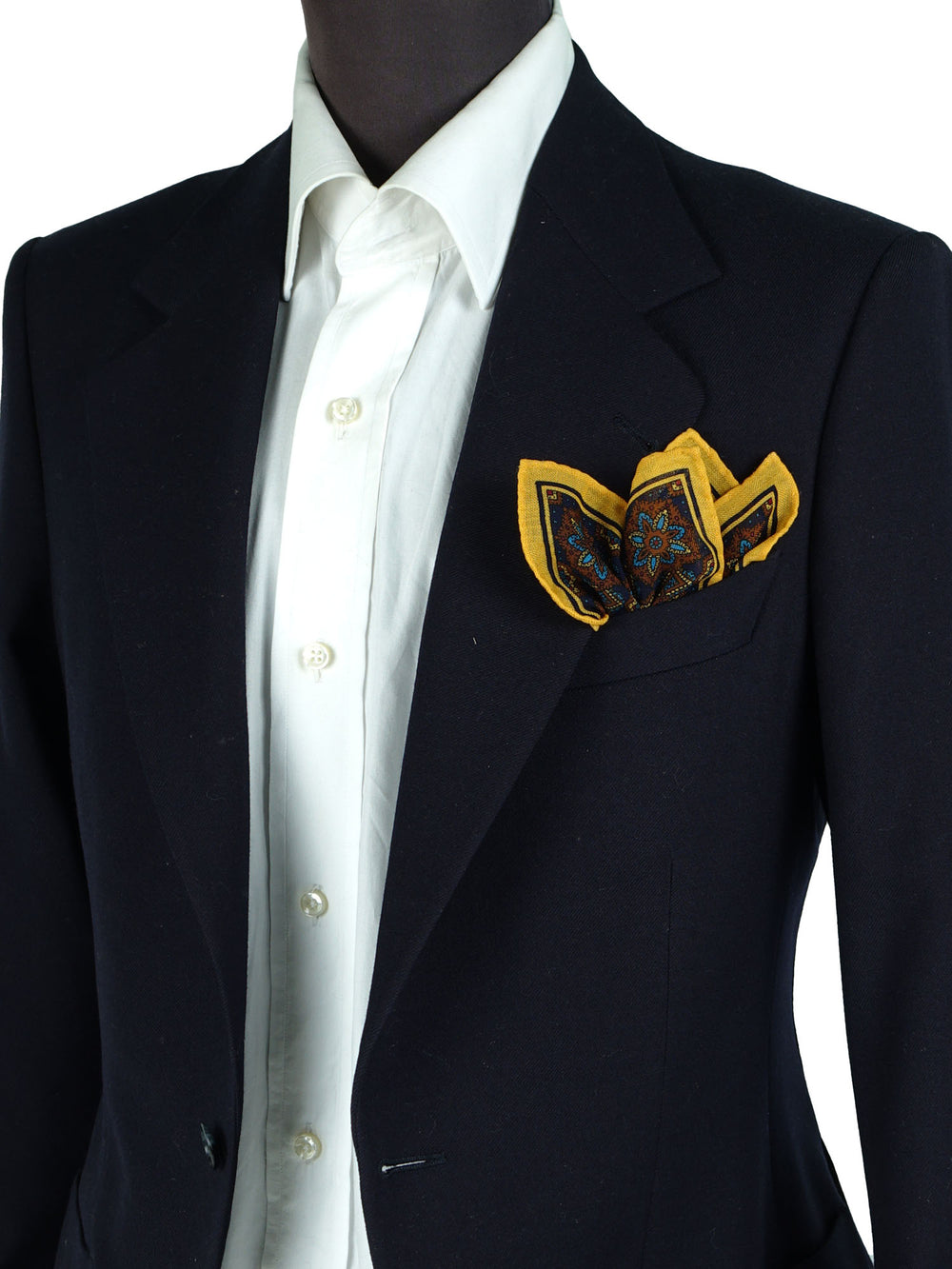Un accessorio da vero intenditore, pensato per l'uomo che apprezza la consistenza e il calore dei tessuti nobili. Questo fazzoletto da taschino Don Mimì è realizzato in un pregiato blend di lana e cashmere, che gli conferisce una mano morbida, calda e un aspetto meravigliosamente opaco. Il design è un capolavoro di equilibrio: un sorprendente fondo giallo ocra con un micro-motivo geometrico è incorniciato da una ricca bordatura a contrasto, dove i toni del blu scuro e del marrone lo ancorano perfettamente alla stagione fredda. A seconda di come viene piegato, permette di creare effetti cromatici sempre diversi.