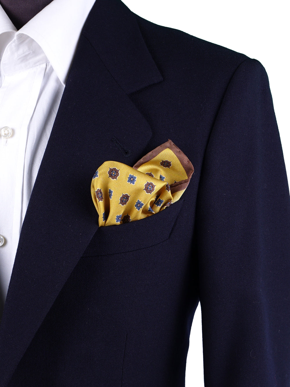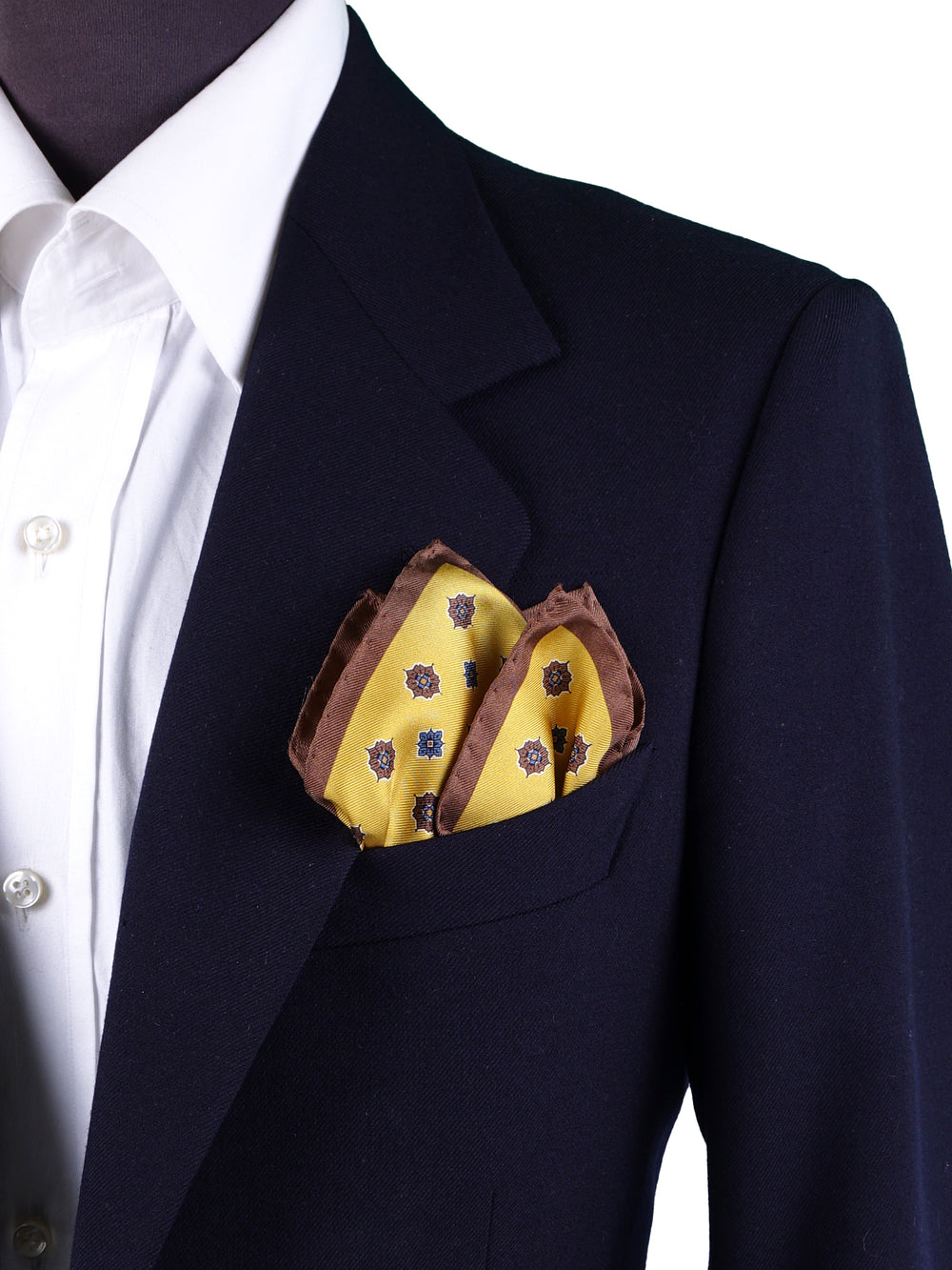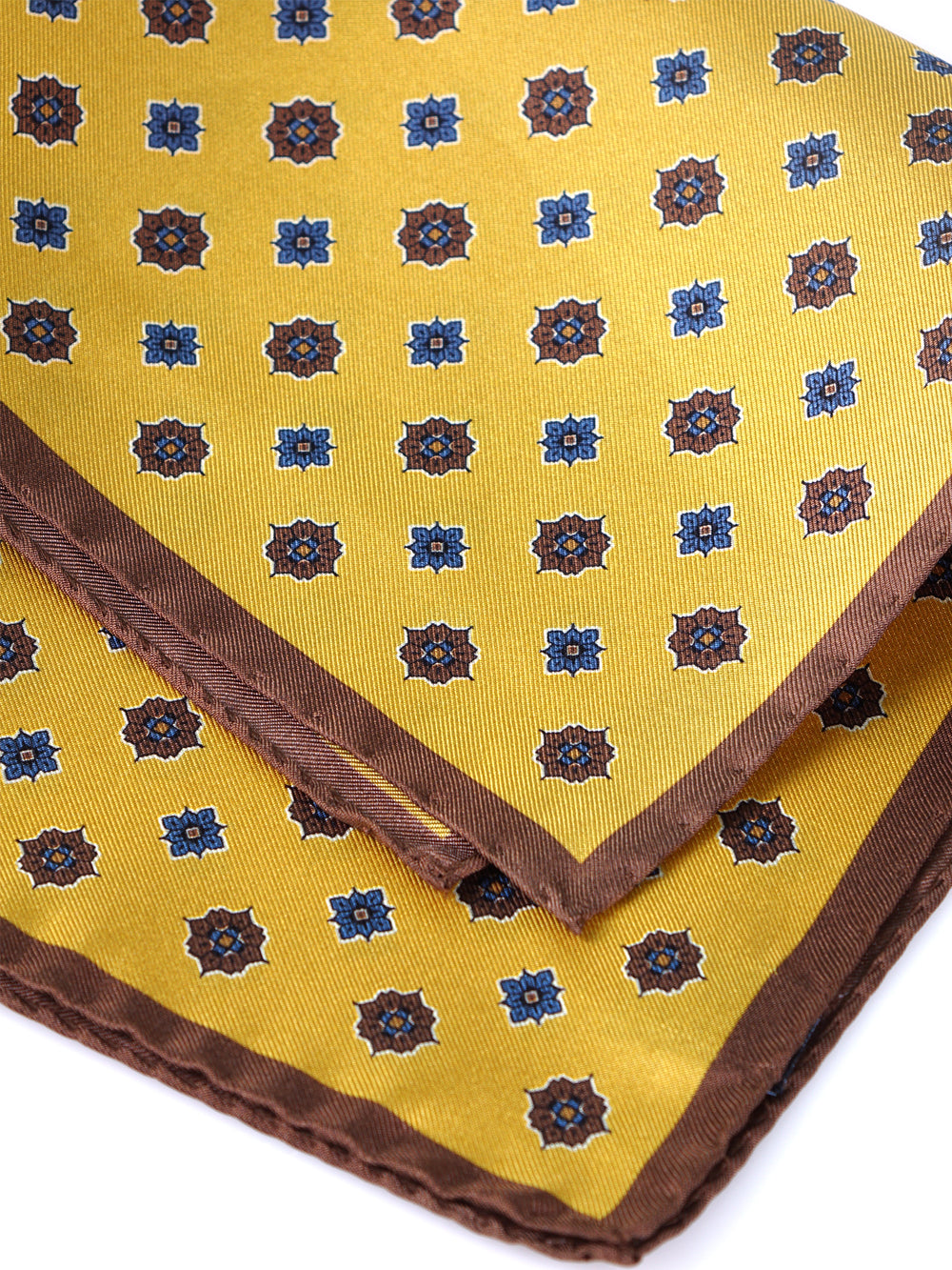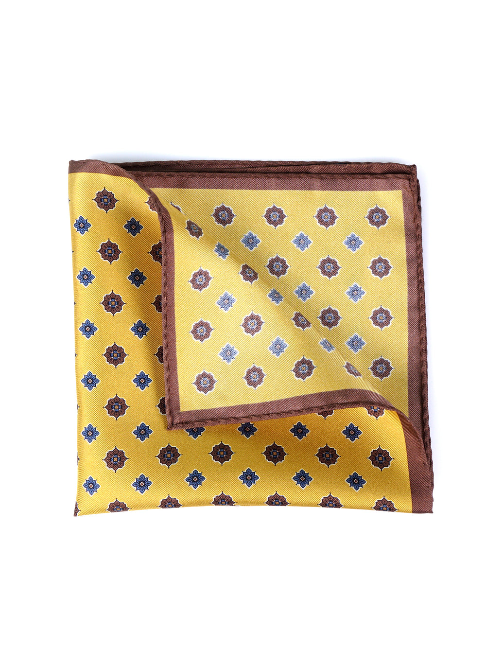 Un accessorio che è una pura dichiarazione di stile, per l'uomo che apprezza i classici intramontabili. Questo fazzoletto da taschino è realizzato in purissima seta stampata italiana, un tessuto dalla lucentezza ricca e dalla mano morbida e scivolosa. Il suo design è un capolavoro di equilibrio: un campo giallo ocra vibrante è impreziosito da un micro-motivo floreale con dettagli blu e marroni, il tutto incorniciato da un ricco bordo marrone a contrasto. Questa doppia anima lo rende incredibilmente versatile, permettendo di creare effetti sempre nuovi a seconda di come viene piegato nel taschino.