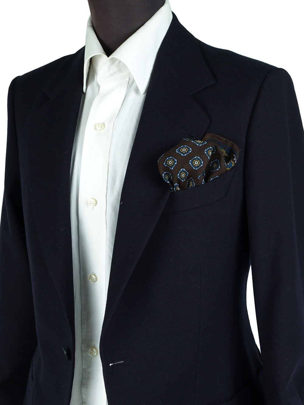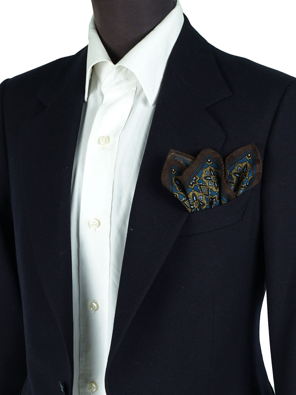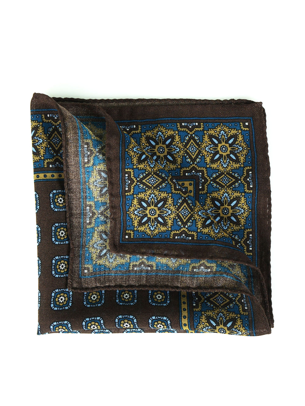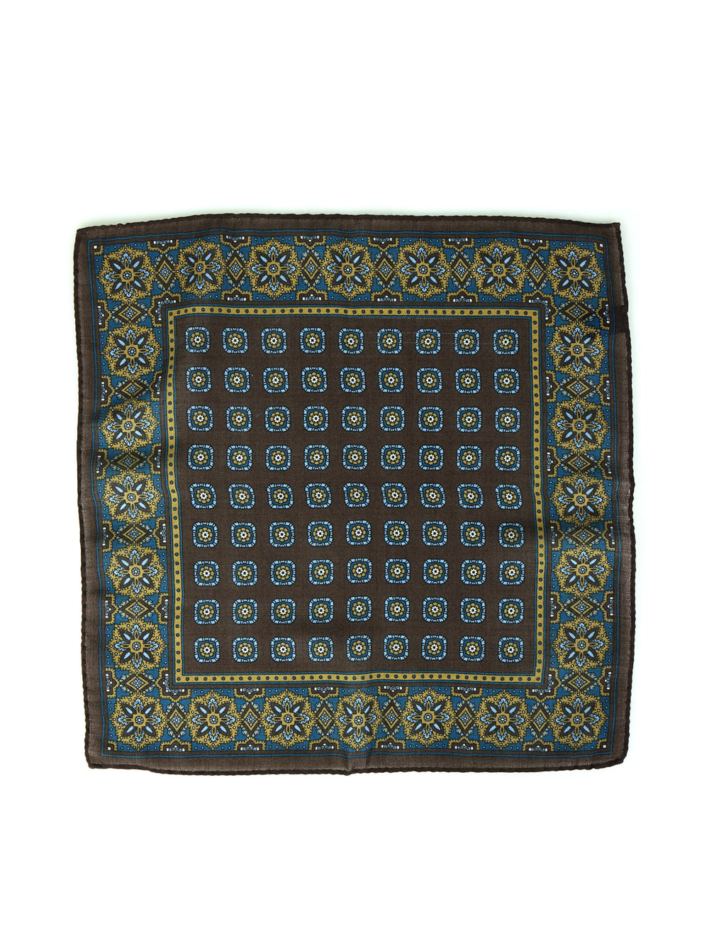 Un accessorio da vero intenditore, pensato per l'uomo che apprezza la consistenza e il calore dei tessuti nobili. Questo fazzoletto da taschino è realizzato in un pregiato blend di lana e cashmere, che gli conferisce una mano morbida, calda e un aspetto meravigliosamente opaco. Il design è un capolavoro di equilibrio: un fondo marrone scuro con un micro-motivo geometrico è incorniciato da una ricca bordatura a contrasto, dove i toni del turchese e dell'ocra lo ancorano perfettamente alla stagione fredda. A seconda di come viene piegato, permette di creare effetti cromatici sempre diversi.