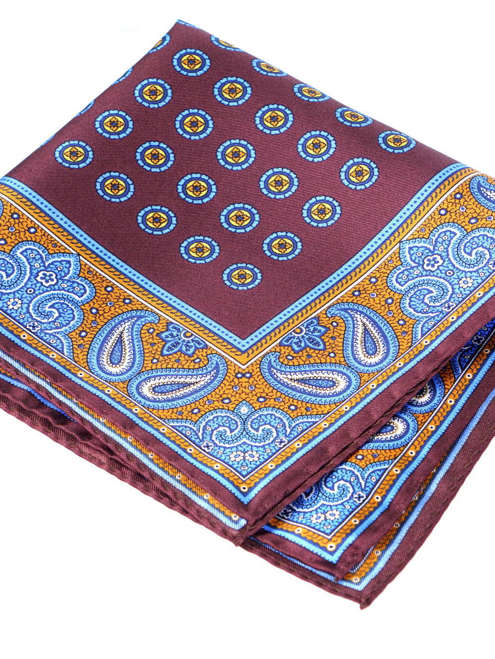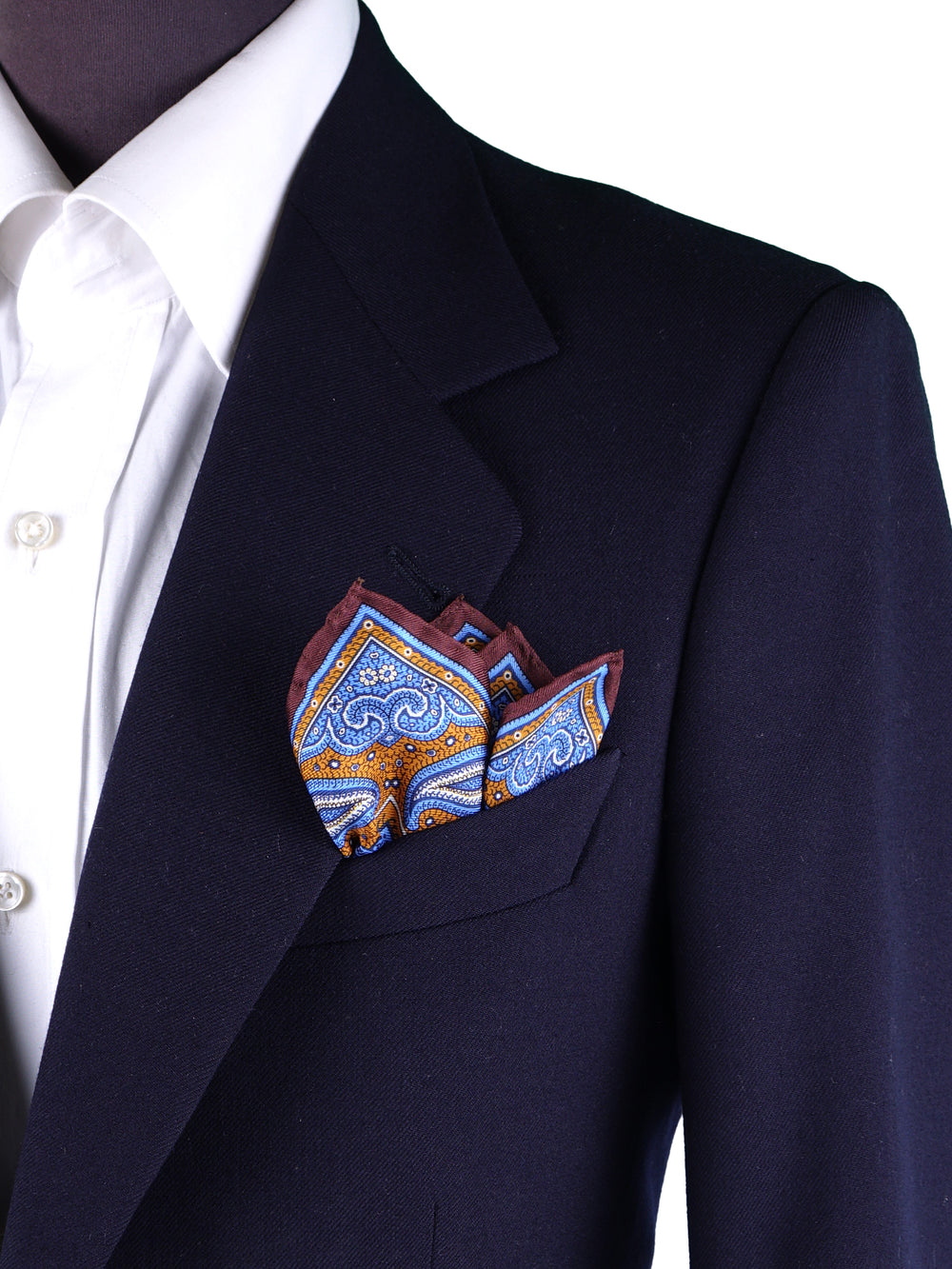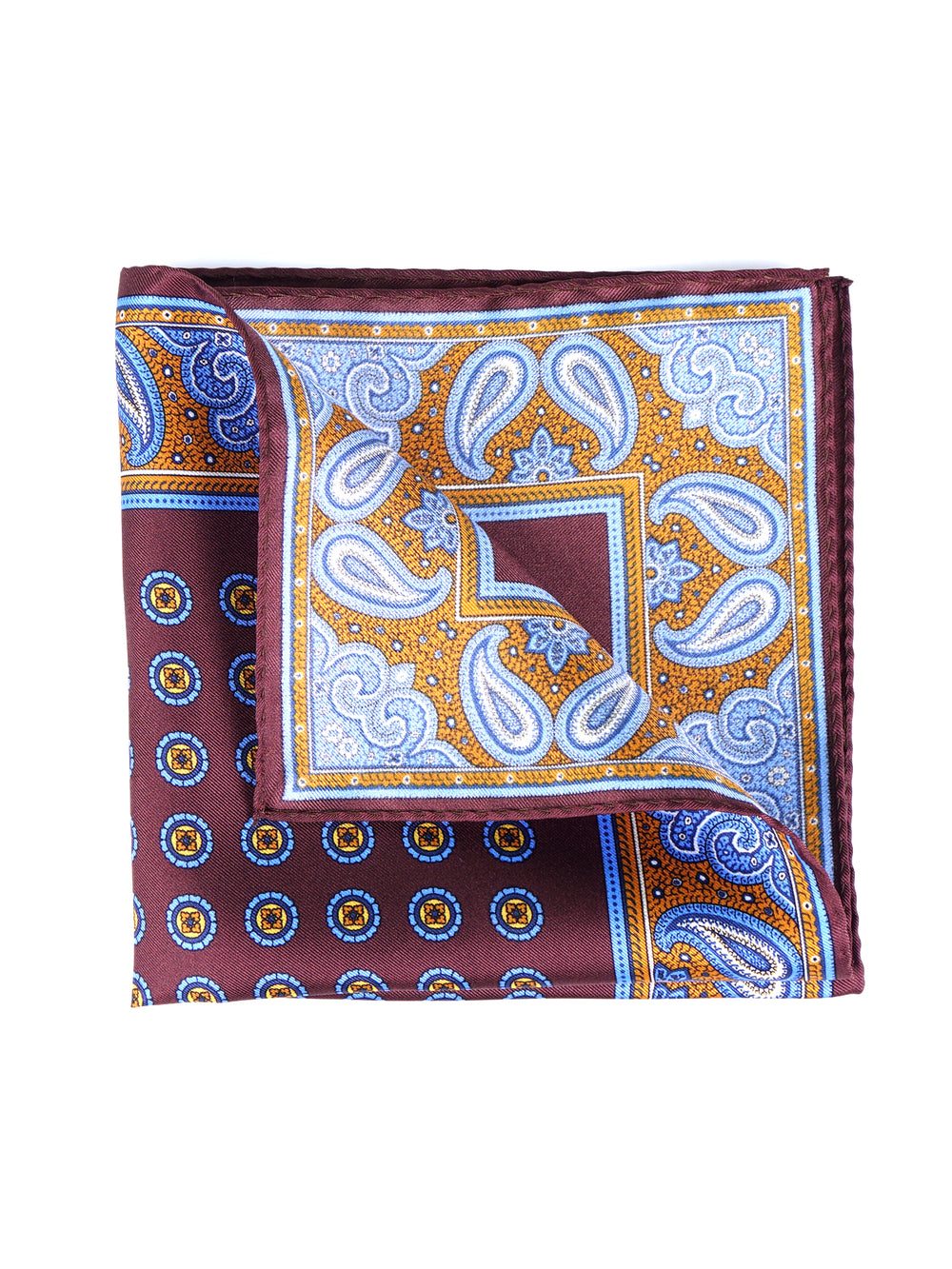 Un accessorio che è un vero e proprio "quattro fazzoletti in uno", pensato per l'uomo che ama la versatilità e l'eleganza. Questo fazzoletto da taschino è realizzato in purissima seta stampata italiana, dalla lucentezza vibrante e dalla mano morbida. Il suo design unico combina due anime: un centro esuberante con un classico motivo cachemire (paisley) nei toni dell'azzurro e dell'ocra, e un marrone più formale e discreto con un micro-motivo geometrico su fondo marrone Questa costruzione permette, a seconda della piega, di creare look completamente diversi con un solo accessorio.