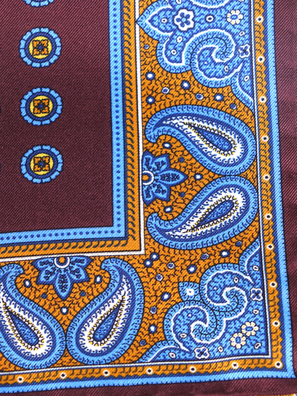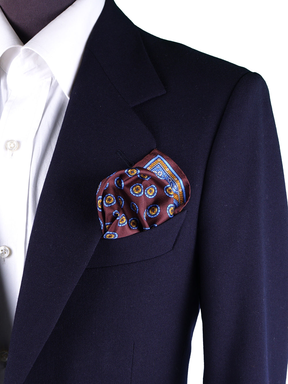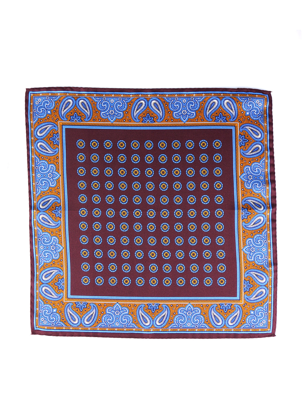 Un accessorio che è un vero e proprio "quattro fazzoletti in uno", pensato per l'uomo che ama la versatilità e l'eleganza. Questo fazzoletto da taschino è realizzato in purissima seta stampata italiana, dalla lucentezza vibrante e dalla mano morbida. Il suo design unico combina due anime: un centro esuberante con un classico motivo cachemire (paisley) nei toni dell'azzurro e dell'ocra, e un marrone più formale e discreto con un micro-motivo geometrico su fondo marrone Questa costruzione permette, a seconda della piega, di creare look completamente diversi con un solo accessorio.