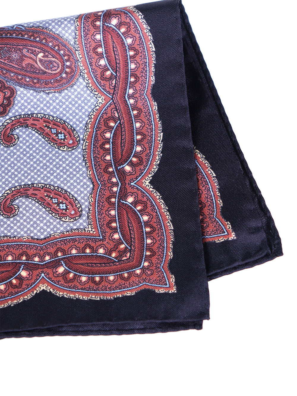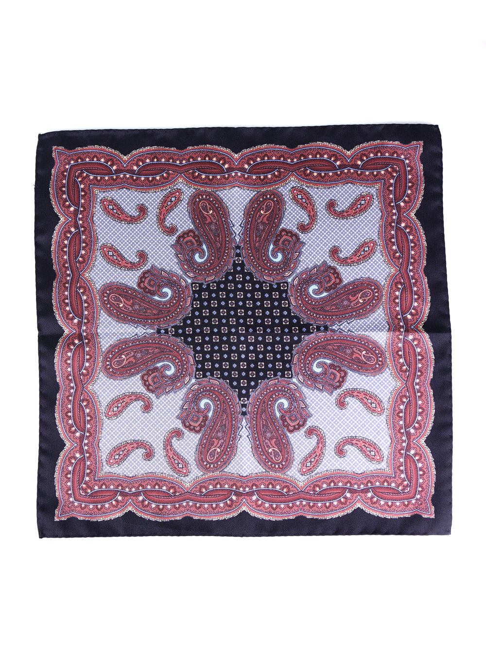 Un accessorio da vero intenditore, pensato per l'uomo che apprezza i dettagli ricercati e i colori che raccontano una storia. Questo fazzoletto da taschino è realizzato in purissima seta stampata italiana, dalla lucentezza vibrante e dalla mano morbida e scivolosa. Il suo design complesso è un capolavoro di equilibrio cromatico: un sontuoso motivo cachemire (paisley) centrale, ricco di dettagli rossi e azzurri, si staglia su un fondo che alterna un micro-disegno a un bianco ottico. Il tutto è incorniciato da un ricco bordo nero. È il pezzo perfetto per l'uomo che usa gli accessori per definire il proprio stile con cultura e personalità.