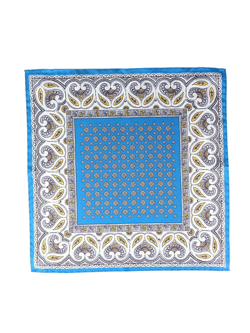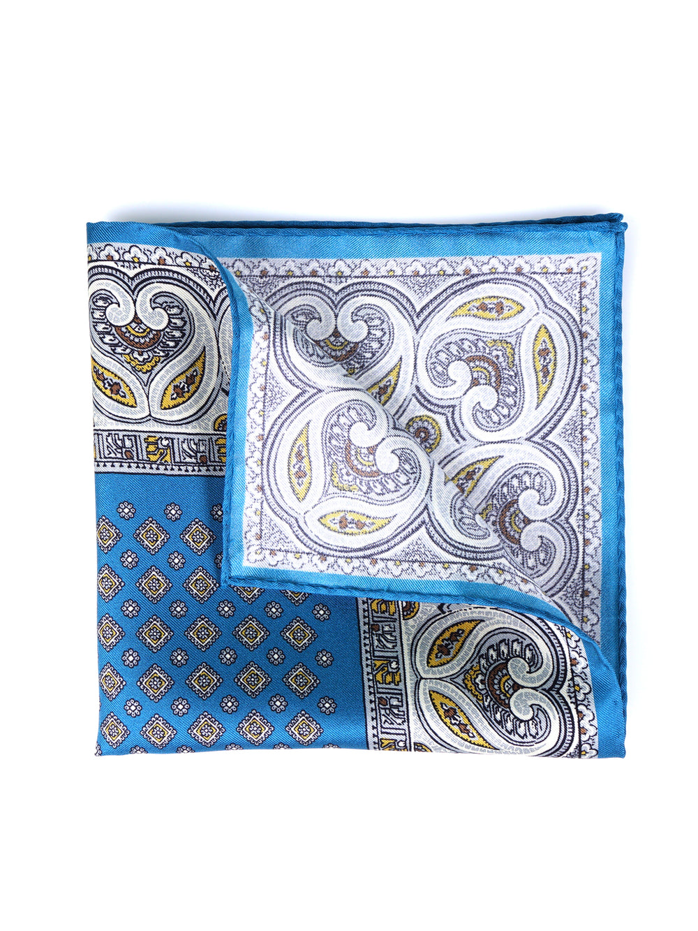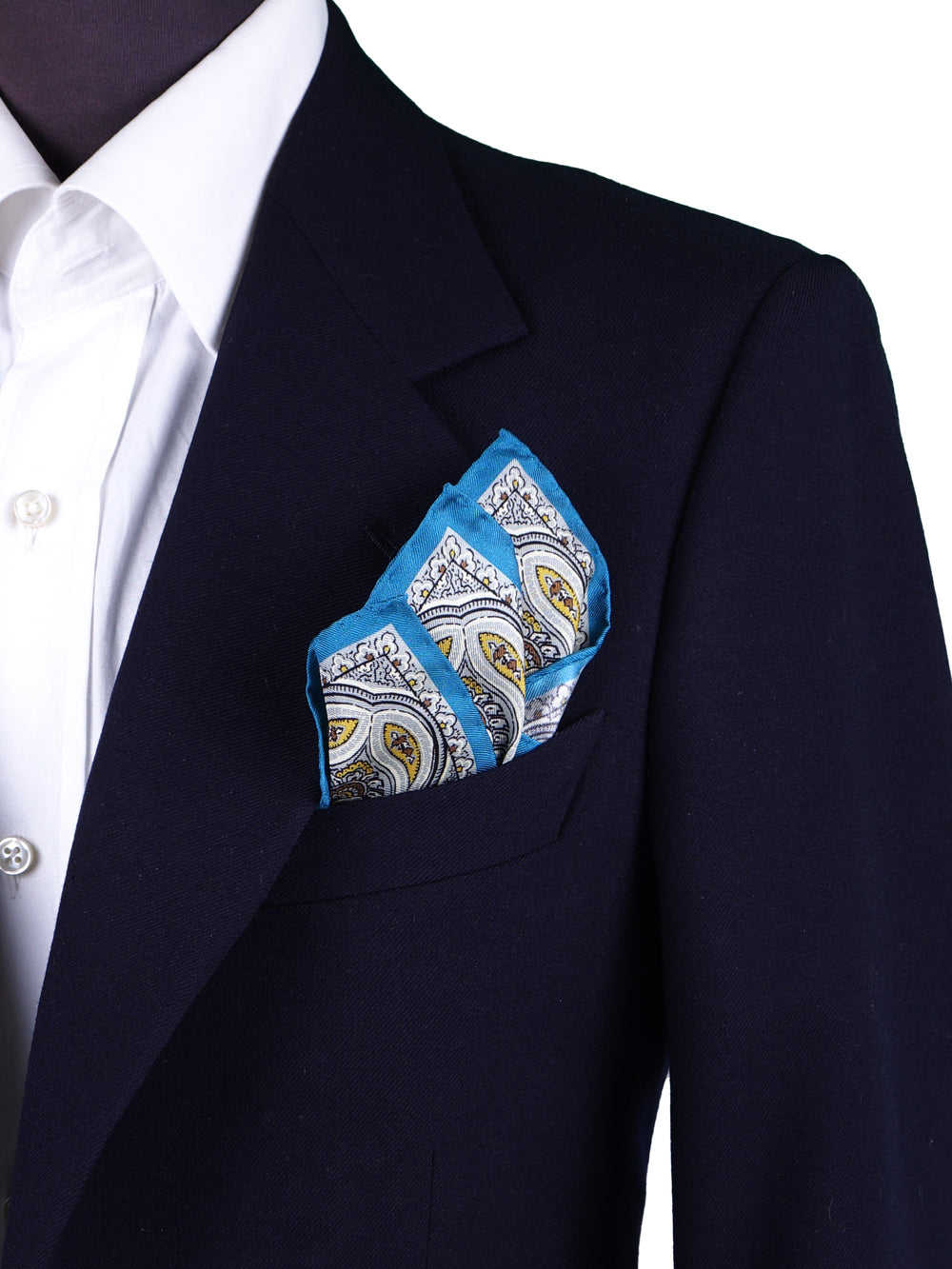Un accessorio che è un vero e proprio "quattro fazzoletti in uno", pensato per l'uomo che ama la versatilità e l'eleganza. Questo fazzoletto da taschino è realizzato in purissima seta stampata italiana, dalla lucentezza vibrante e dalla mano morbida. Il suo design unico combina due anime: un centro esuberante con un classico motivo cachemire (paisley) nei toni del giallo e del marrone su fondo bianco, e un bordo più formale e discreto con un micro-motivo geometrico su fondo turchese. Questa costruzione permette, a seconda della piega, di creare look completamente diversi con un solo accessorio.