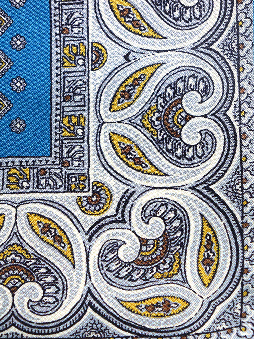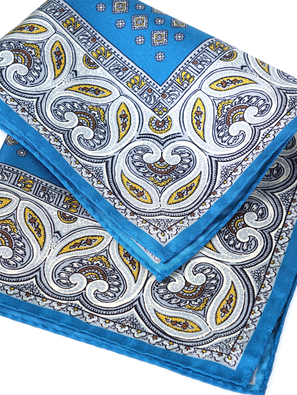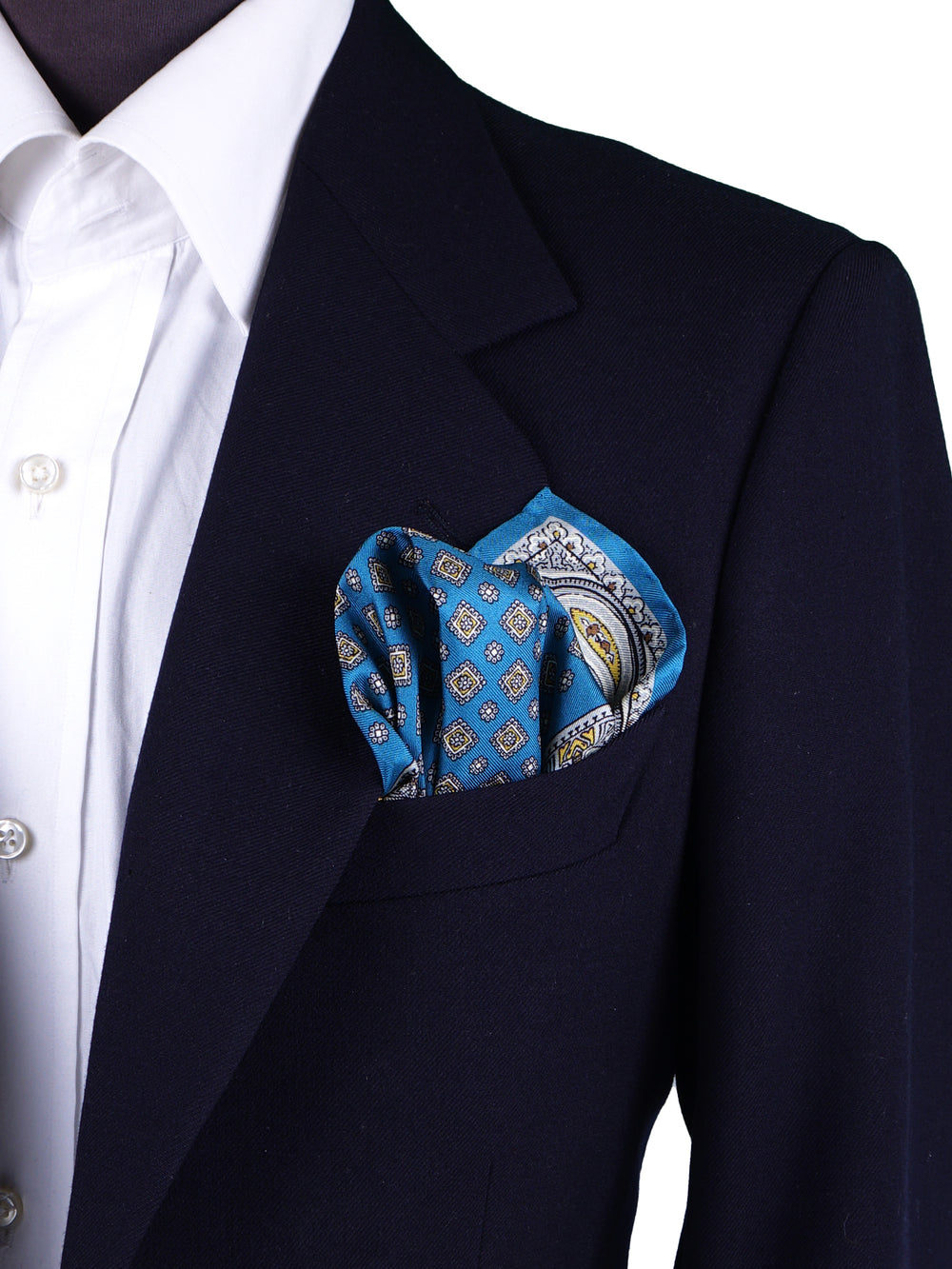 Un accessorio che è un vero e proprio "quattro fazzoletti in uno", pensato per l'uomo che ama la versatilità e l'eleganza. Questo fazzoletto da taschino è realizzato in purissima seta stampata italiana, dalla lucentezza vibrante e dalla mano morbida. Il suo design unico combina due anime: un centro esuberante con un classico motivo cachemire (paisley) nei toni del giallo e del marrone su fondo bianco, e un bordo più formale e discreto con un micro-motivo geometrico su fondo turchese. Questa costruzione permette, a seconda della piega, di creare look completamente diversi con un solo accessorio.