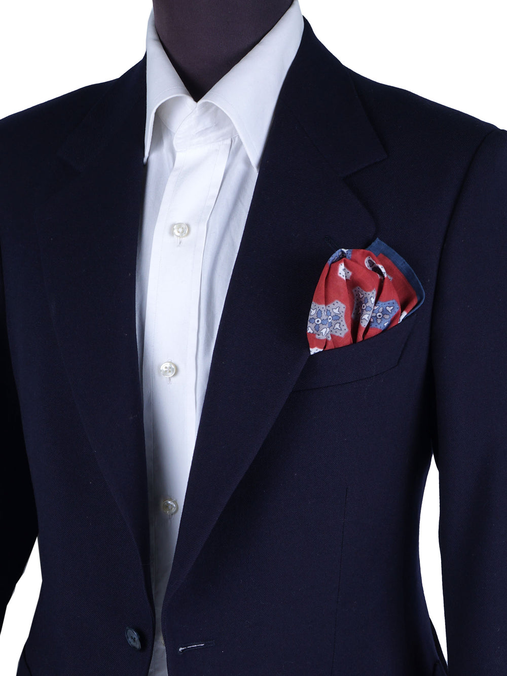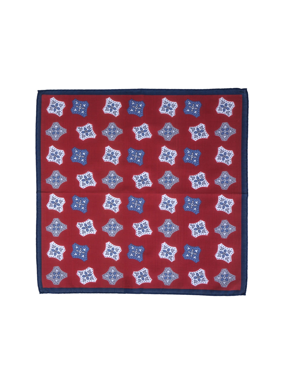 Colore: Rosso con motivi geometrici blu, bianchi e beige, bordo blu scuro