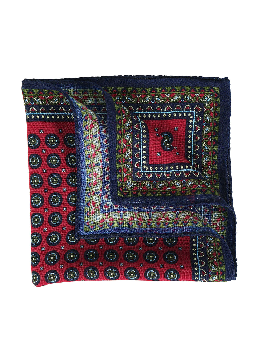 Questo fazzoletto da taschino è un concentrato di cultura stilistica. La sua palette di colori – un dialogo tra un rosso rubino profondo, un blu navy e tocchi di verde bosco – è un classico intramontabile dell'eleganza maschile. Realizzato in una pregiata miscela di lana e cashmere, possiede una mano morbida e una texture opaca che lo rendono l'alleato perfetto dei tessuti invernali. Il suo disegno complesso, unito all'orlo arrotolato a mano, ne fa un pezzo da collezione per l'uomo che ama distinguersi con classe.