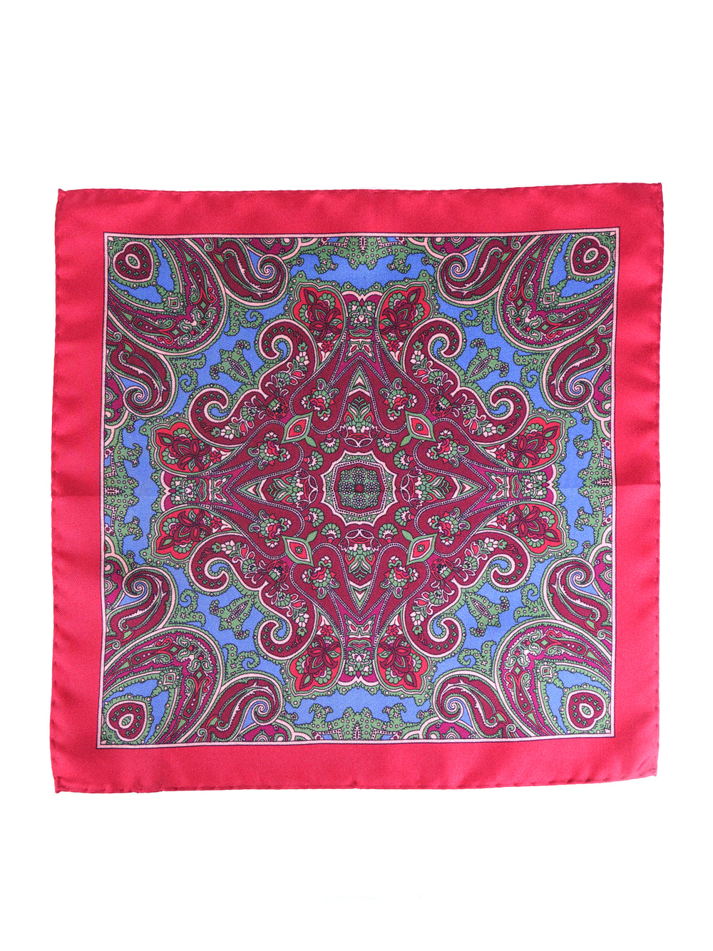 Un accessorio che è un'esplosione di colore e di arte, pensato per l'uomo che non teme di osare con stile e raffinatezza. Questo fazzoletto da taschino è realizzato in purissima seta stampata italiana, dalla lucentezza vibrante e dalla mano morbida e scivolosa. Il suo design è un'interpretazione sontuosa dell'iconico motivo Cachemire (Paisley), in una palette cromatica audace che unisce il blu, il verde e il rosa all'interno, incorniciati da un vibrante bordo rosso. È il pezzo perfetto per l'uomo che usa gli accessori per definire il proprio stile e comunicare la propria personalità.
