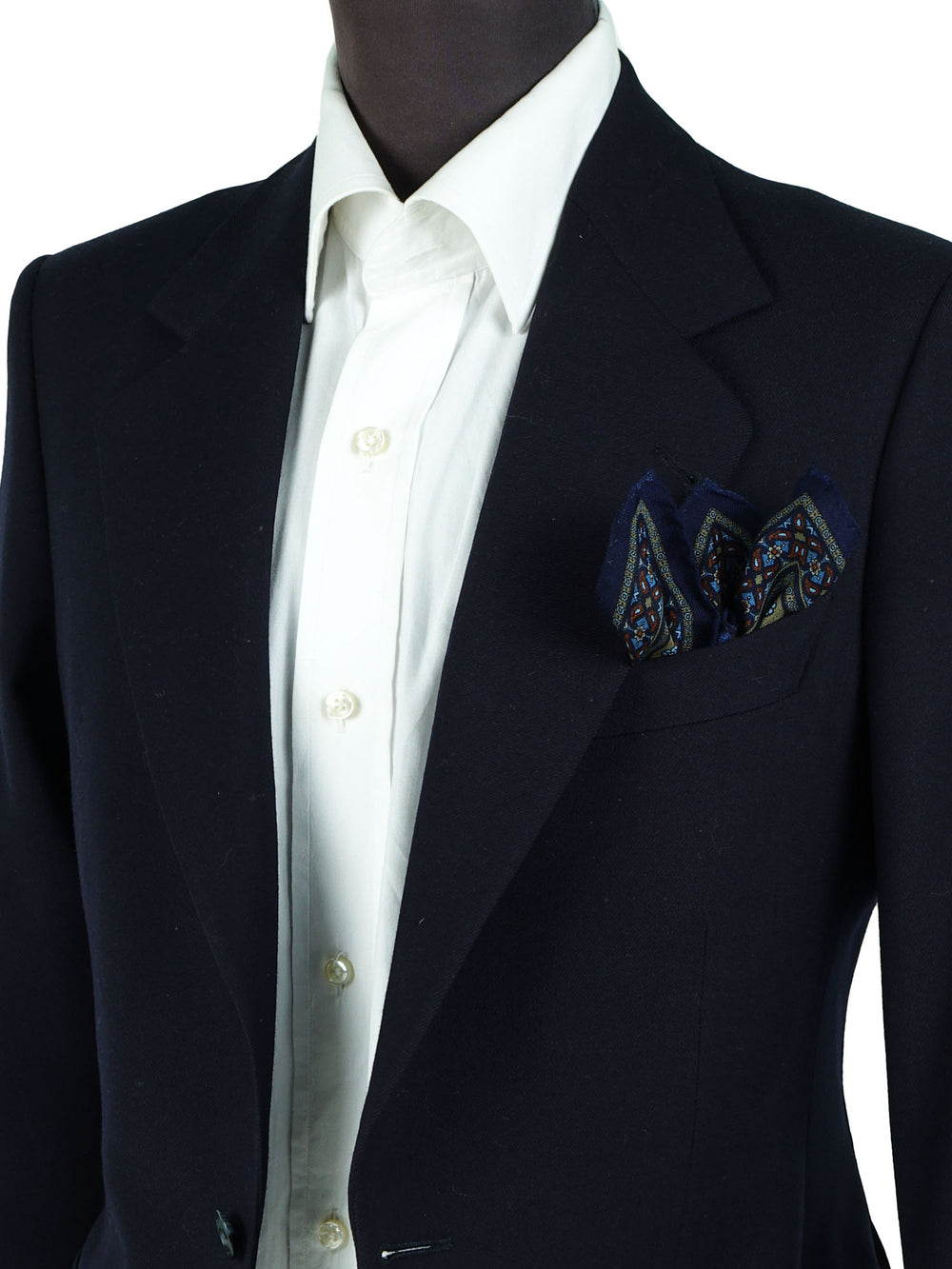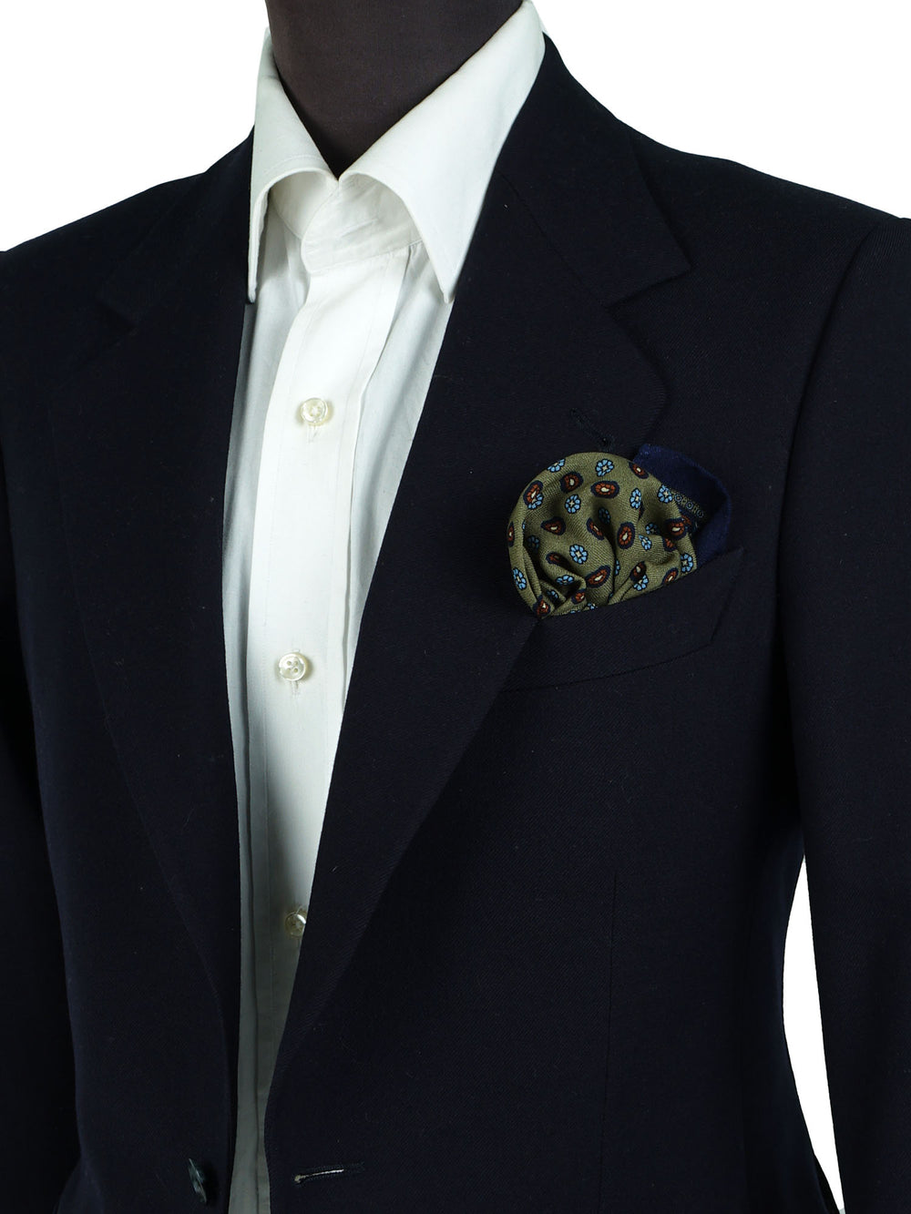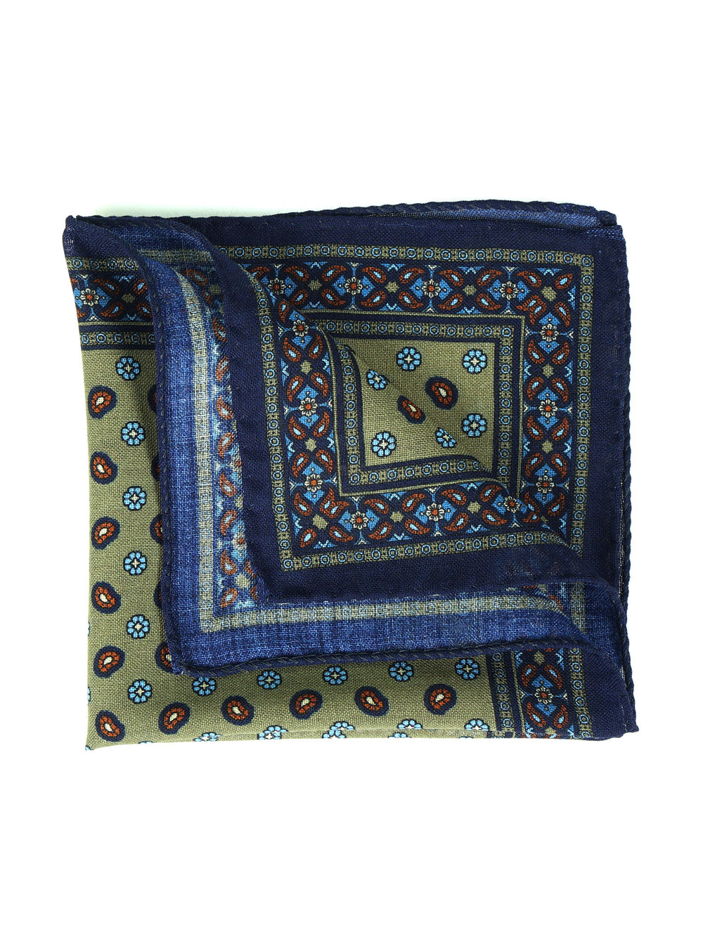 Un accessorio da vero intenditore, pensato per l'uomo che apprezza la consistenza e il calore dei tessuti nobili. Questo fazzoletto da taschino è realizzato in un pregiato blend di lana e cashmere, che gli conferisce una mano morbida, calda e un aspetto meravigliosamente opaco. Il suo design "quattro facce" è un capolavoro di versatilità: unisce un centro con un motivo cachemire e floreale su fondo verde oliva a un sontuoso bordo con un motivo geometrico su fondo blu navy. La palette cromatica, arricchita da tocchi di arancio e rosso, è audace ma di grande equilibrio. A seconda della piega, permette di creare look completamente diversi con un solo accessorio.