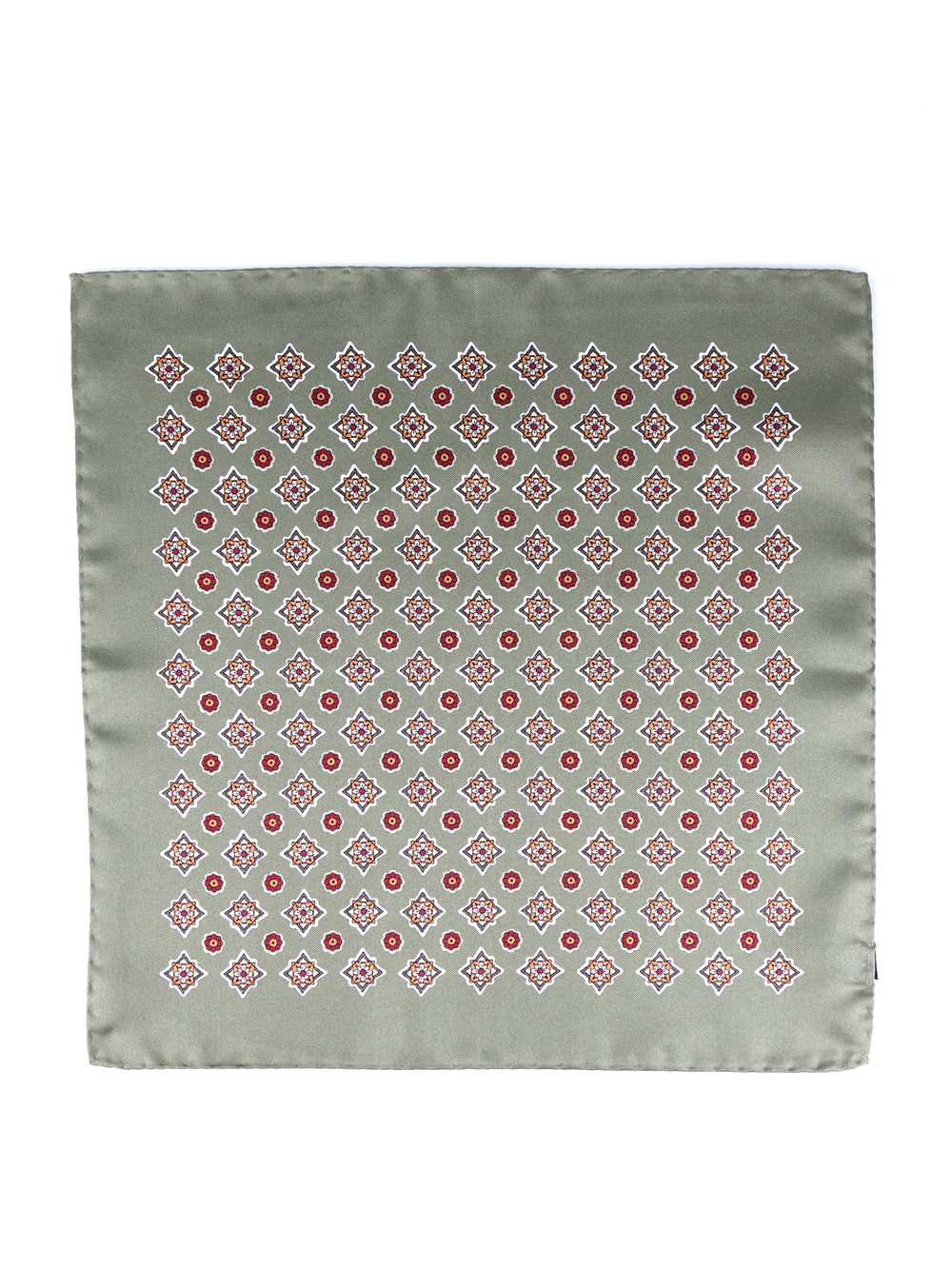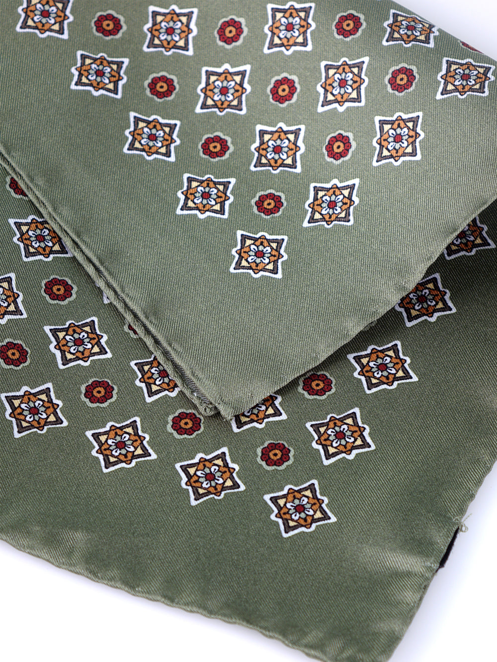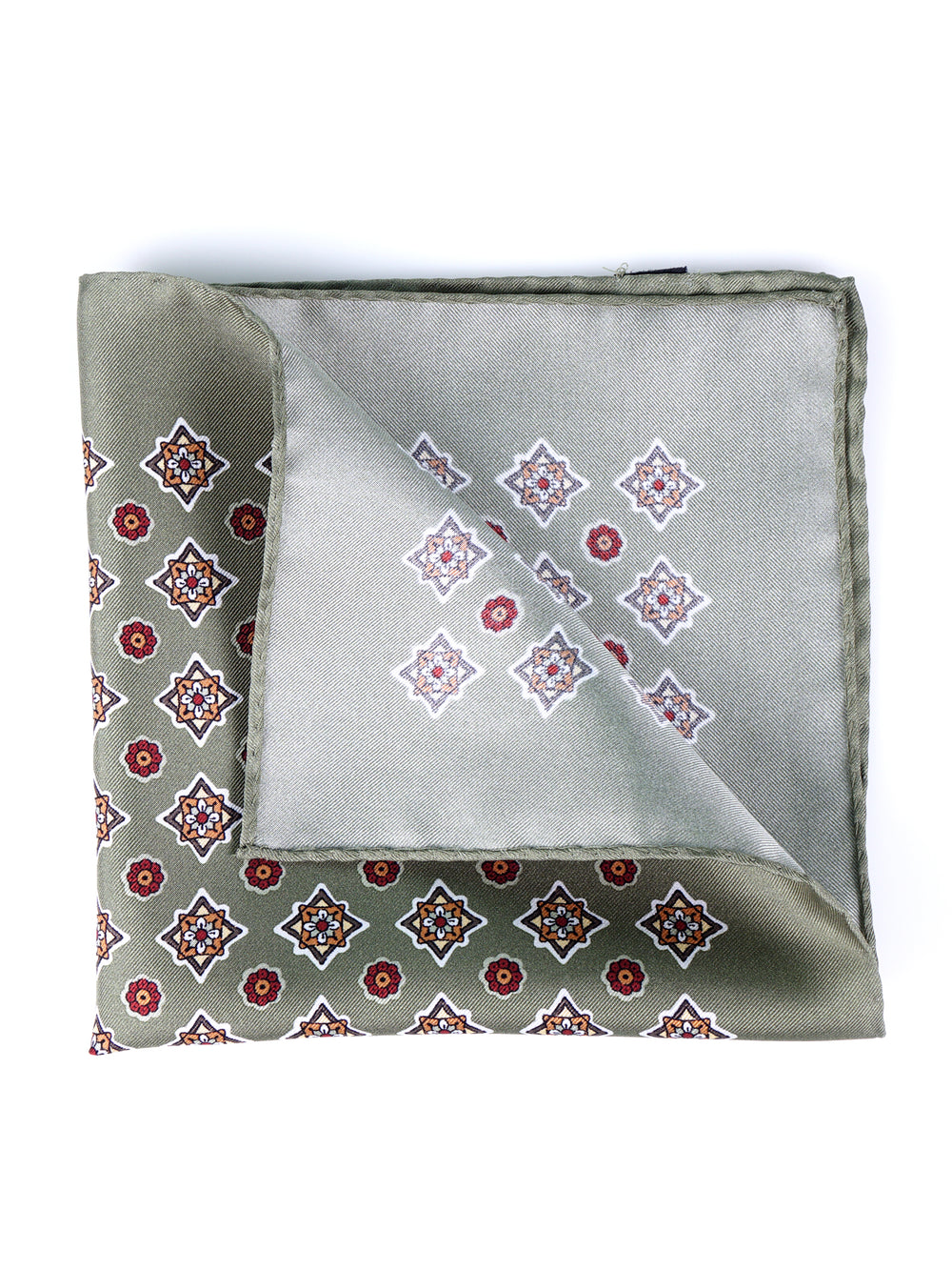 Un accessorio che è un'esplosione di colore e di stile, il pezzo forte per l'uomo che ama i dettagli che fanno la differenza. Questo fazzoletto da taschino è realizzato in purissima seta stampata italiana, un tessuto dalla lucentezza ricca e dalla mano morbida e scivolosa. Il suo design, ispirato alle antiche maioliche, presenta un motivo geometrico e floreale su un sofisticato fondo verde salvia. La ricca palette di colori, che unisce il rosso, l'ocra e il panna, lo rende un pezzo unico e di grande personalità, perfetto per ravvivare i toni caldi del guardaroba autunnale.