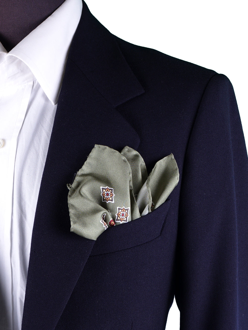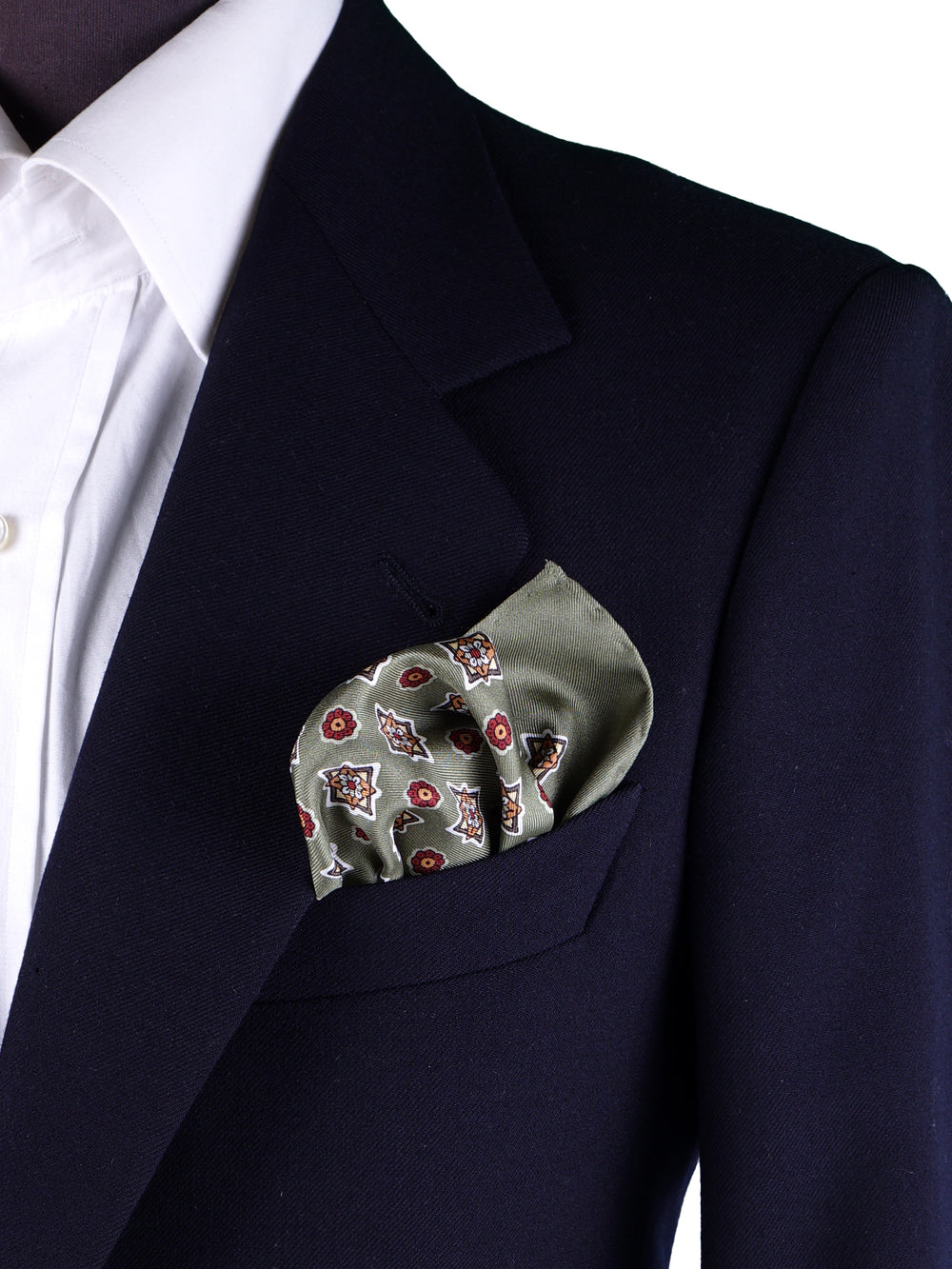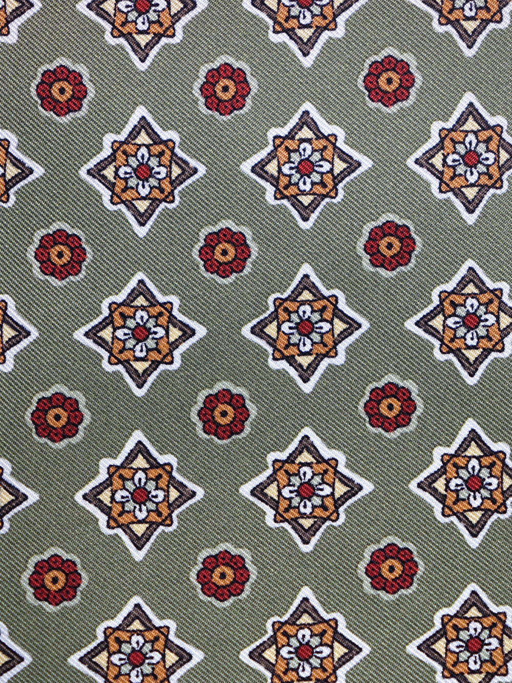 Un accessorio che è un'esplosione di colore e di stile, il pezzo forte per l'uomo che ama i dettagli che fanno la differenza. Questo fazzoletto da taschino è realizzato in purissima seta stampata italiana, un tessuto dalla lucentezza ricca e dalla mano morbida e scivolosa. Il suo design, ispirato alle antiche maioliche, presenta un motivo geometrico e floreale su un sofisticato fondo verde salvia. La ricca palette di colori, che unisce il rosso, l'ocra e il panna, lo rende un pezzo unico e di grande personalità, perfetto per ravvivare i toni caldi del guardaroba autunnale.