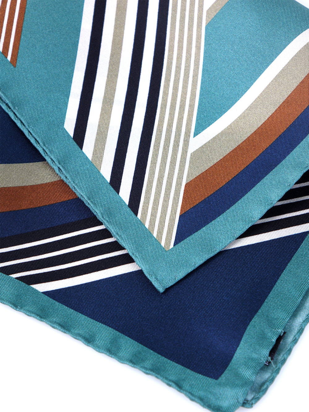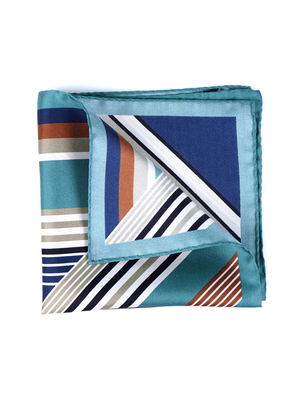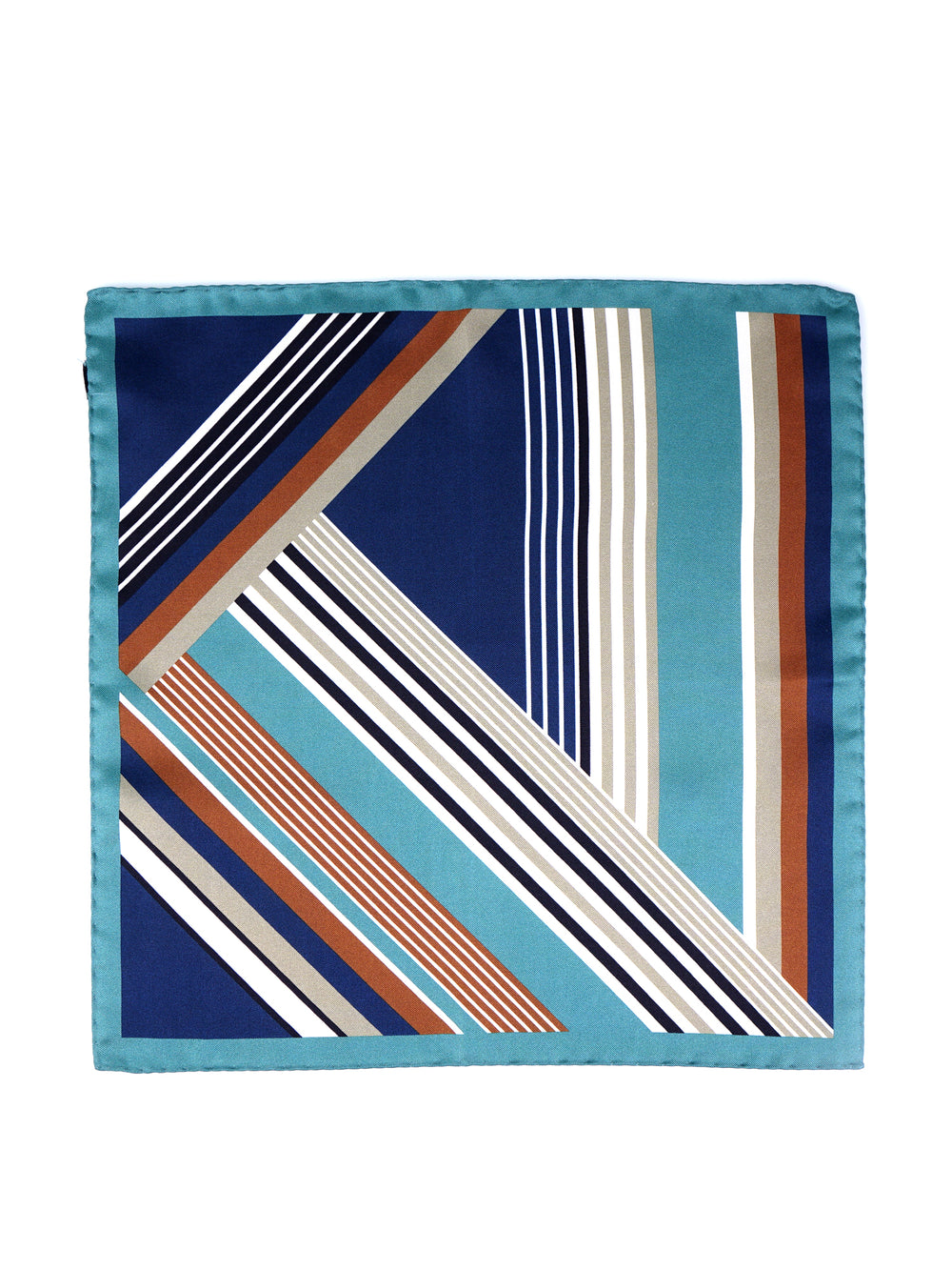 Un accessorio che è una pura dichiarazione di stile, per l'uomo che ama il design moderno e le geometrie audaci. Questo fazzoletto da taschino è realizzato in purissima seta stampata italiana, un tessuto dalla lucentezza ricca e dalla mano morbida e scivolosa. Il suo design è un capolavoro di equilibrio grafico: un gioco di righe verticali e diagonali crea un effetto visivo dinamico e contemporaneo. La palette di colori unisce i toni freddi del blu e dell'azzurro a quelli caldi del cuoio e del beige, rendendolo incredibilmente versatile.