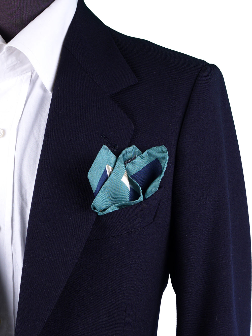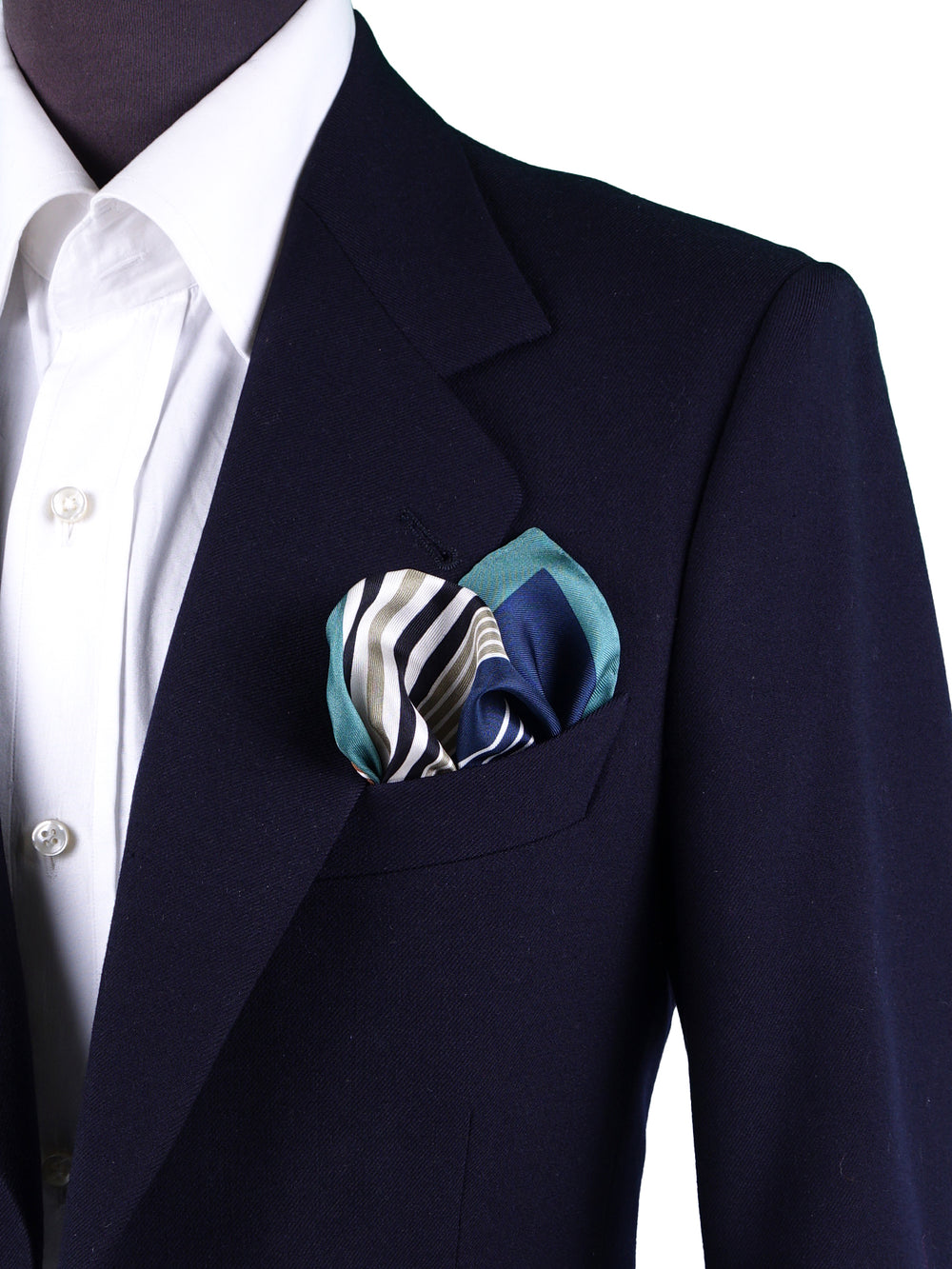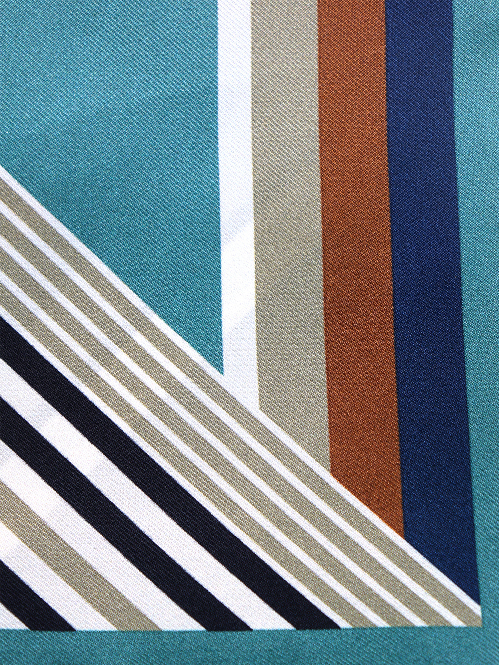 Un accessorio che è una pura dichiarazione di stile, per l'uomo che ama il design moderno e le geometrie audaci. Questo fazzoletto da taschino è realizzato in purissima seta stampata italiana, un tessuto dalla lucentezza ricca e dalla mano morbida e scivolosa. Il suo design è un capolavoro di equilibrio grafico: un gioco di righe verticali e diagonali crea un effetto visivo dinamico e contemporaneo. La palette di colori unisce i toni freddi del blu e dell'azzurro a quelli caldi del cuoio e del beige, rendendolo incredibilmente versatile.