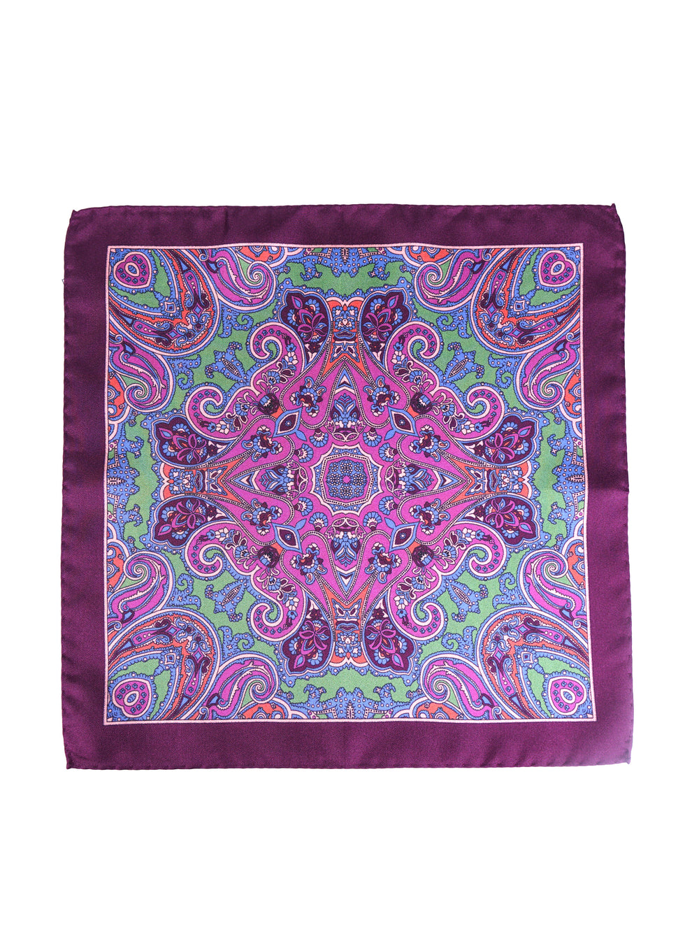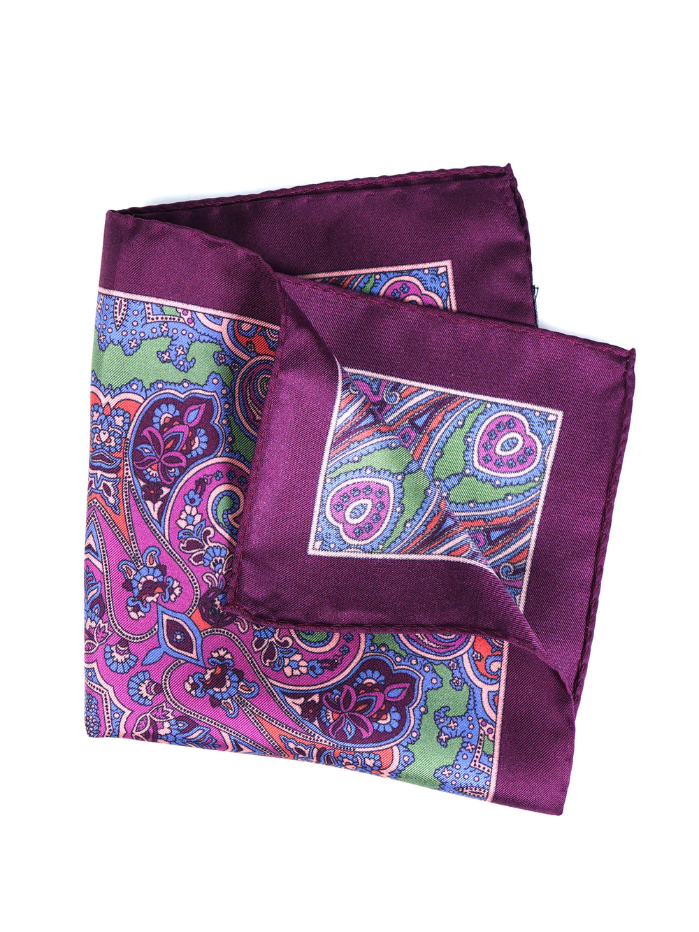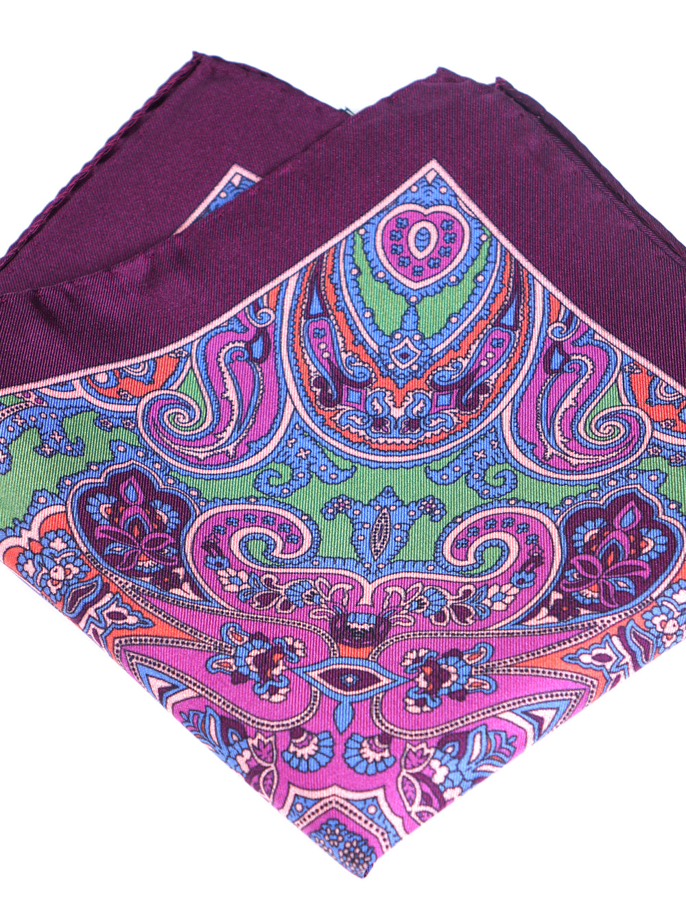 Un accessorio che è un'esplosione di colore e di arte, pensato per l'uomo che non teme di osare con stile e raffinatezza. Questo fazzoletto da taschino è realizzato in purissima seta stampata italiana, dalla lucentezza vibrante e dalla mano morbida e scivolosa. Il suo design è un'interpretazione sontuosa dell'iconico motivo Cachemire (Paisley), in una palette cromatica audace che unisce toni gioiello come il verde smeraldo, il fucsia, il blu e il viola. Il tutto è incorniciato da un ricco bordo color vinaccia. È il pezzo perfetto per l'uomo che usa gli accessori per definire il proprio stile e comunicare la propria personalità.