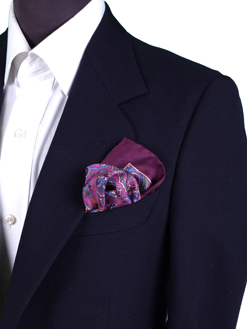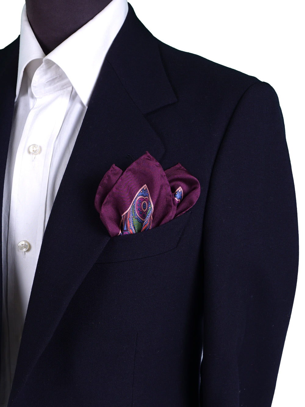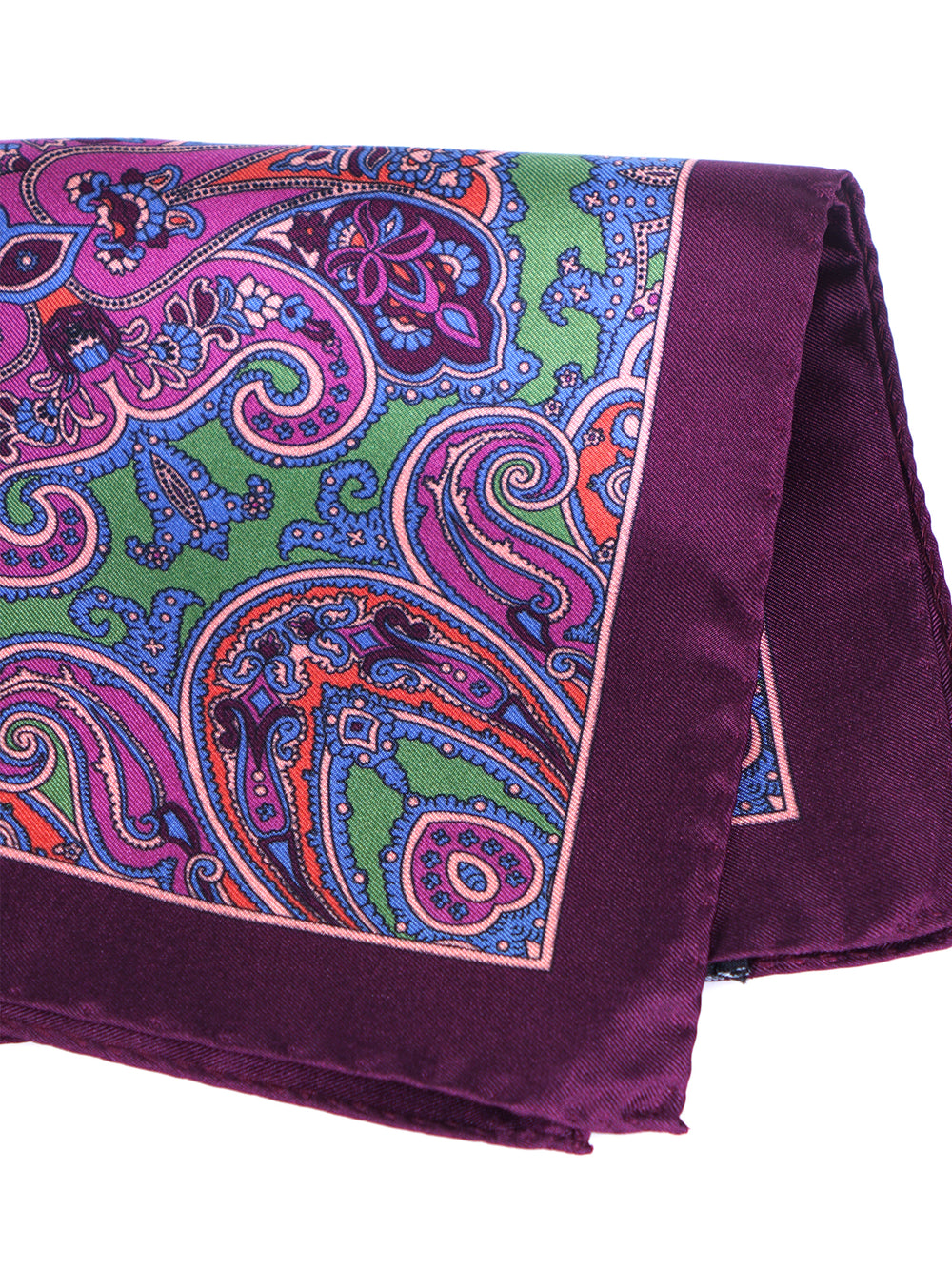 Un accessorio che è un'esplosione di colore e di arte, pensato per l'uomo che non teme di osare con stile e raffinatezza. Questo fazzoletto da taschino è realizzato in purissima seta stampata italiana, dalla lucentezza vibrante e dalla mano morbida e scivolosa. Il suo design è un'interpretazione sontuosa dell'iconico motivo Cachemire (Paisley), in una palette cromatica audace che unisce toni gioiello come il verde smeraldo, il fucsia, il blu e il viola. Il tutto è incorniciato da un ricco bordo color vinaccia. È il pezzo perfetto per l'uomo che usa gli accessori per definire il proprio stile e comunicare la propria personalità.