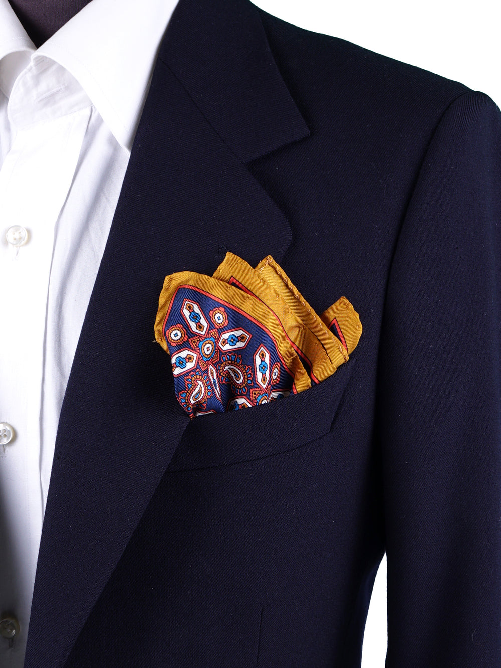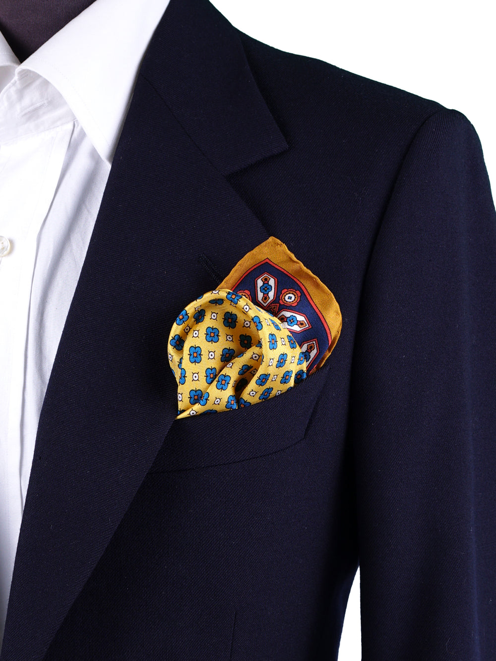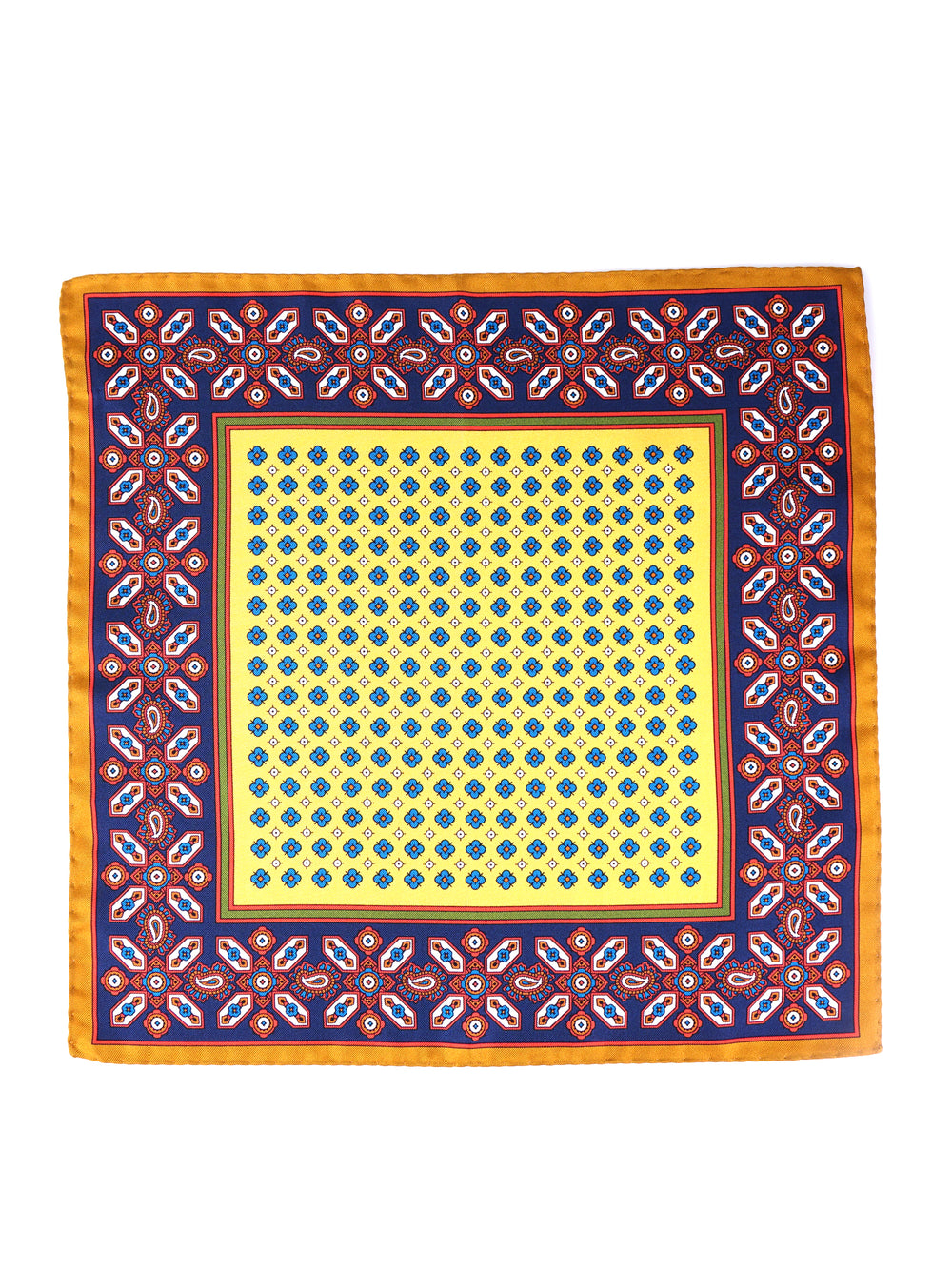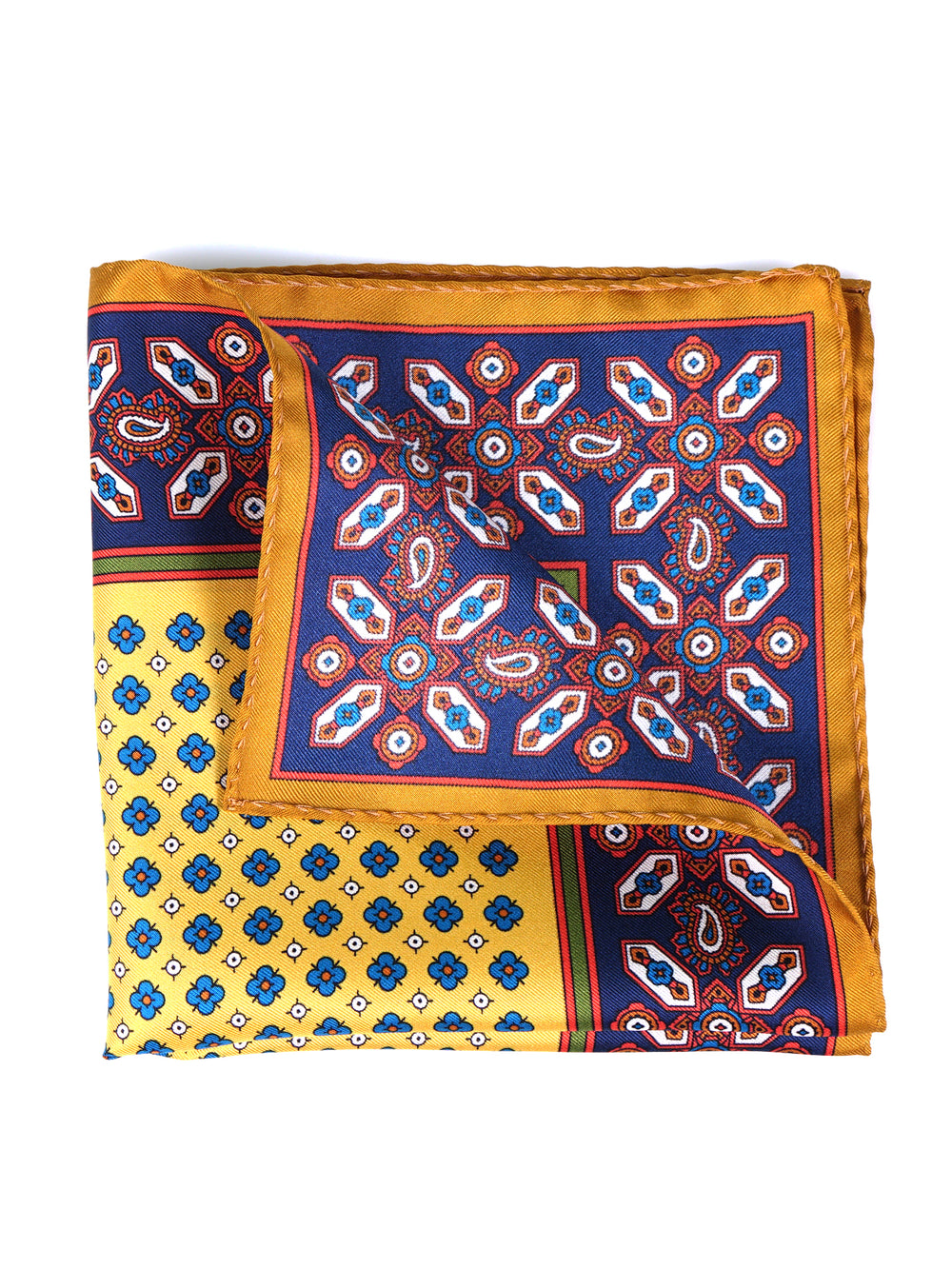 Un accessorio che è un'esplosione di colore e di stile, il pezzo forte per l'uomo che ama i dettagli che fanno la differenza. Questo fazzoletto da taschino è realizzato in purissima seta stampata italiana, un tessuto dalla lucentezza ricca e dalla mano morbida e scivolosa. Il suo design è un capolavoro di equilibrio: un campo giallo vibrante con un micro-motivo floreale azzurro è incorniciato da una sontuosa bordatura blu con dettagli cachemire e geometrici, il tutto racchiuso da un bordo finale color ocra. Questa complessità lo rende incredibilmente versatile, permettendo di creare effetti sempre nuovi a seconda di come viene piegato nel taschino.