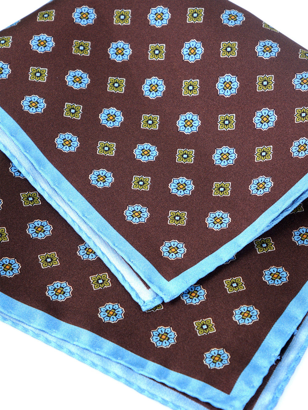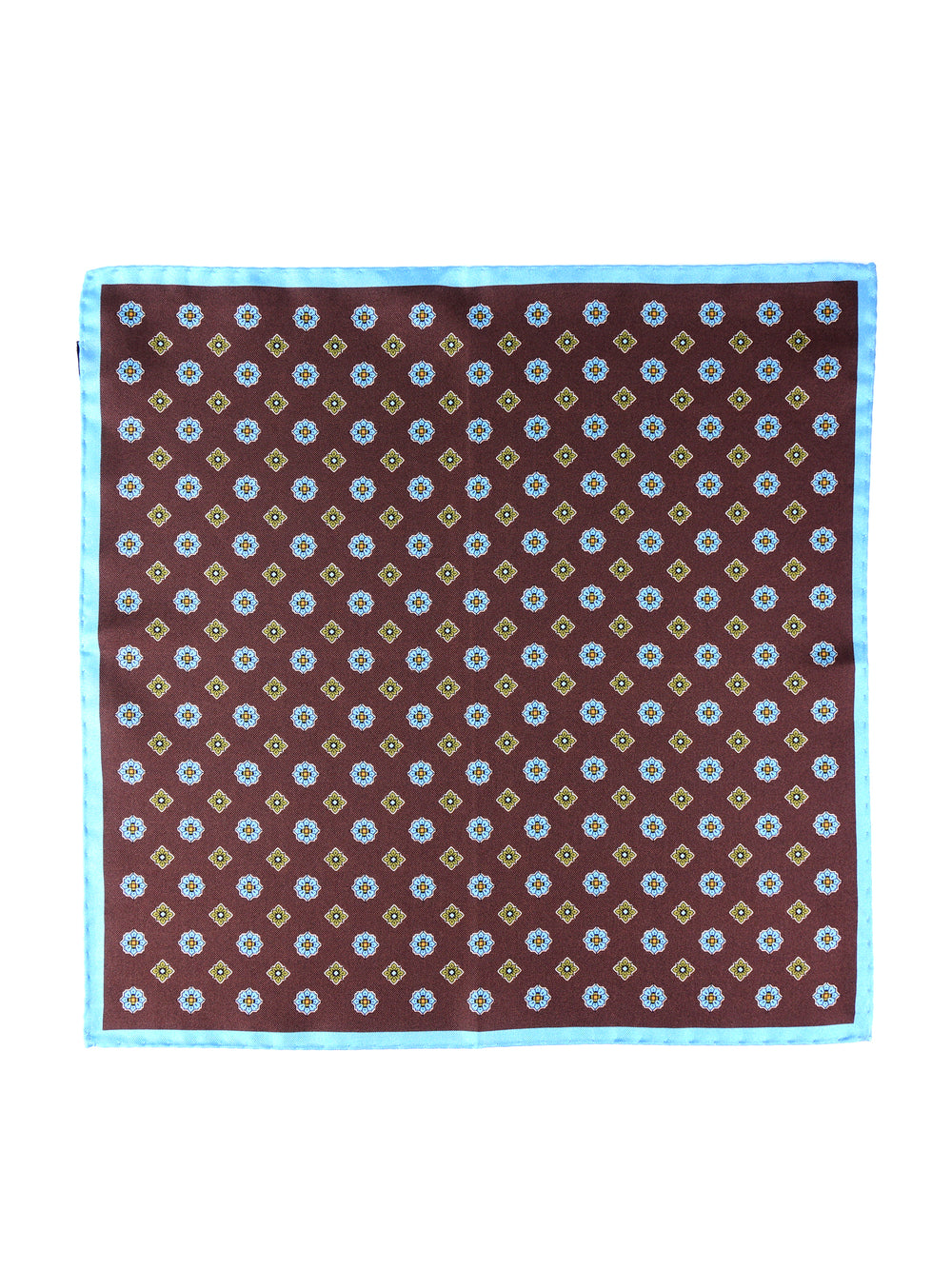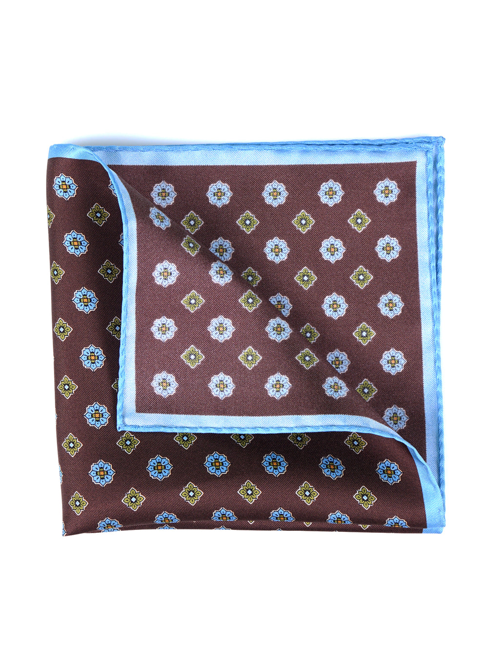 Un accessorio che è una pura dichiarazione di stile, per l'uomo che apprezza i classici intramontabili. Questo fazzoletto da taschino è realizzato in purissima seta stampata italiana, un tessuto dalla lucentezza ricca e dalla mano morbida e scivolosa. Il suo design è un capolavoro di equilibrio: un campo marrone caldo è impreziosito da un micro-motivo floreale con dettagli azzurri, il tutto incorniciato da un vibrante bordo azzurro a contrasto. Questa doppia anima lo rende incredibilmente versatile, permettendo di creare effetti sempre nuovi a seconda di come viene piegato nel taschino.