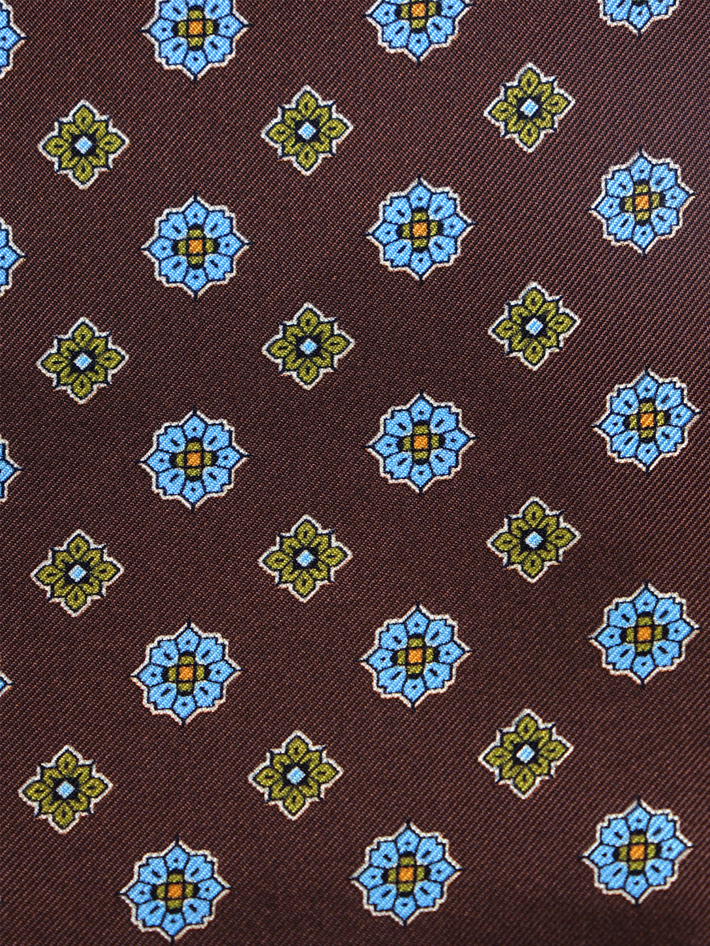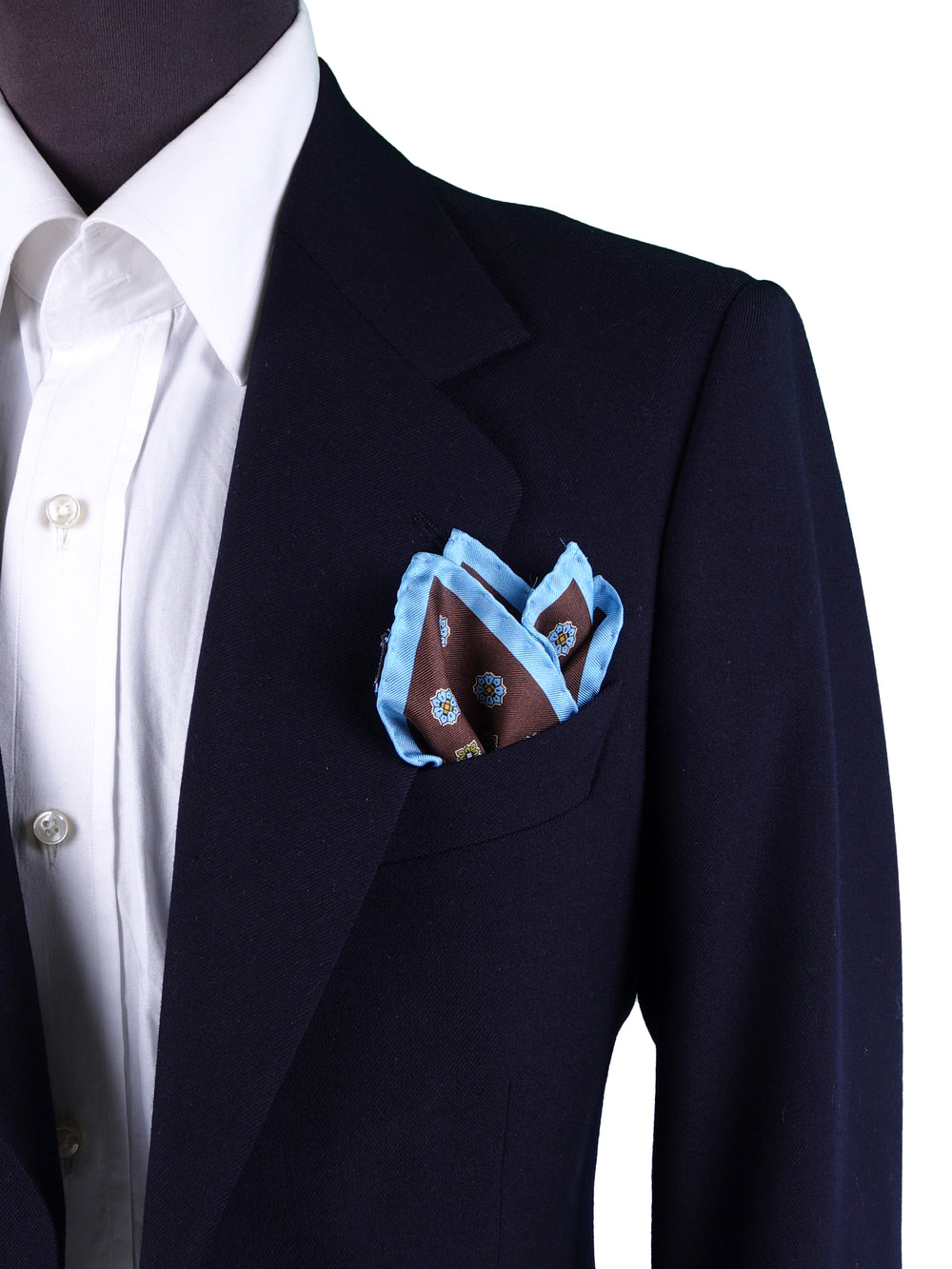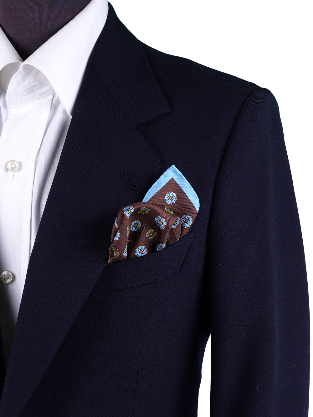 Un accessorio che è una pura dichiarazione di stile, per l'uomo che apprezza i classici intramontabili. Questo fazzoletto da taschino è realizzato in purissima seta stampata italiana, un tessuto dalla lucentezza ricca e dalla mano morbida e scivolosa. Il suo design è un capolavoro di equilibrio: un campo marrone caldo è impreziosito da un micro-motivo floreale con dettagli azzurri, il tutto incorniciato da un vibrante bordo azzurro a contrasto. Questa doppia anima lo rende incredibilmente versatile, permettendo di creare effetti sempre nuovi a seconda di come viene piegato nel taschino.