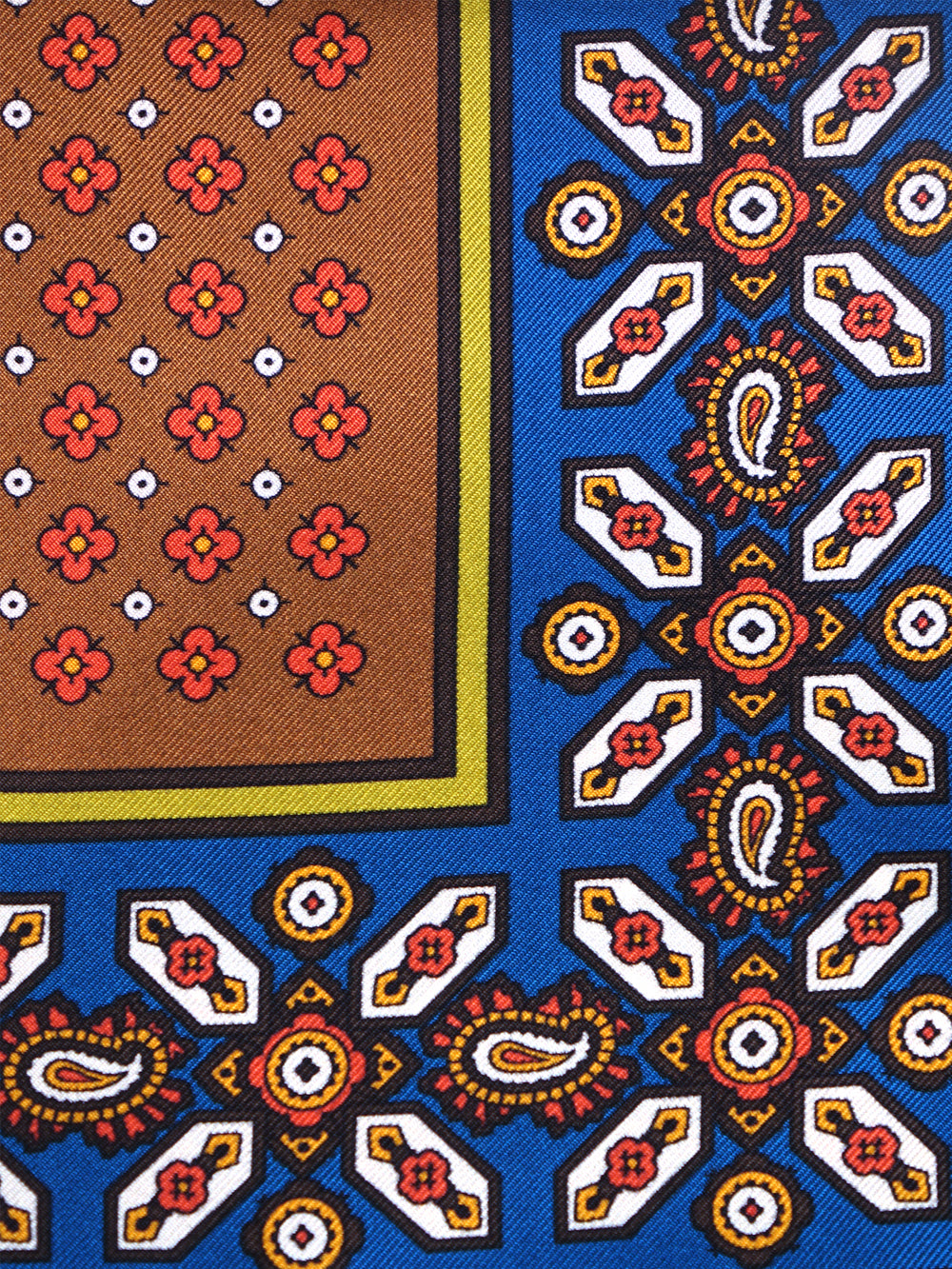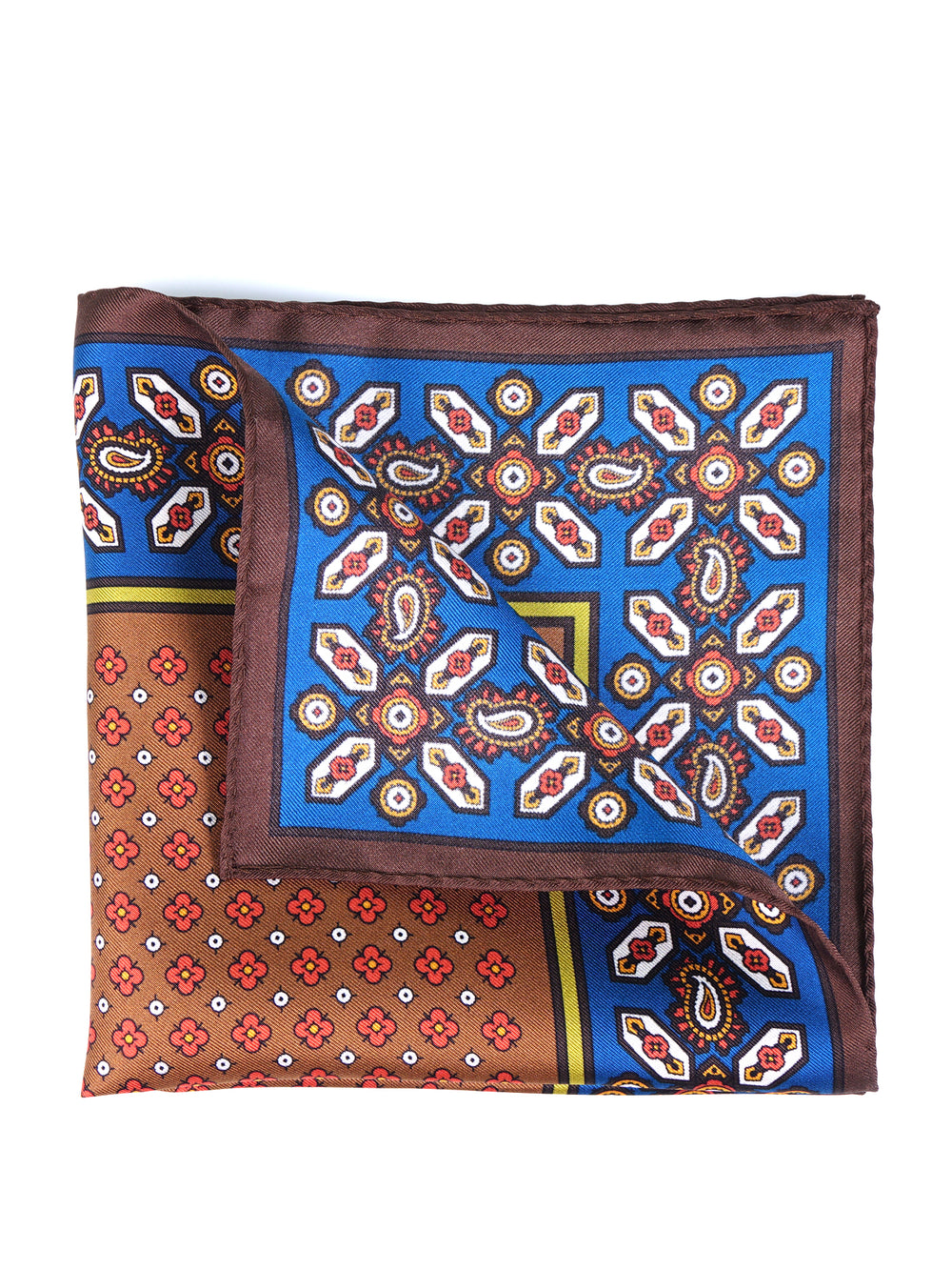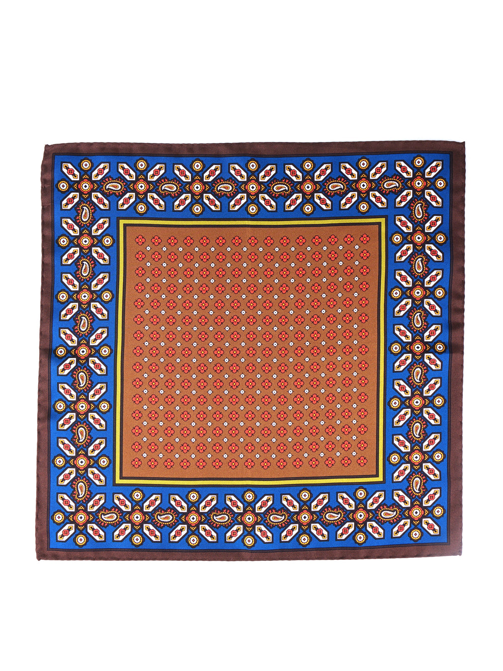 Un accessorio che è un'esplosione di colore e di stile, il pezzo forte della collezione Autunno/Inverno ZAZÀ per l'uomo che ama i dettagli che fanno la differenza. Questo fazzoletto da taschino è realizzato in purissima seta stampata italiana, un tessuto dalla lucentezza ricca e dalla mano morbida e scivolosa. Il suo design è un capolavoro di equilibrio: un campo marrone con un micro-motivo floreale arancio è incorniciato da una sontuosa bordatura blu con dettagli cachemire e geometrici, il tutto racchiuso da un bordo finale marrone scuro. Questa complessità lo rende incredibilmente versatile, permettendo di creare effetti sempre nuovi a seconda di come viene piegato nel taschino.