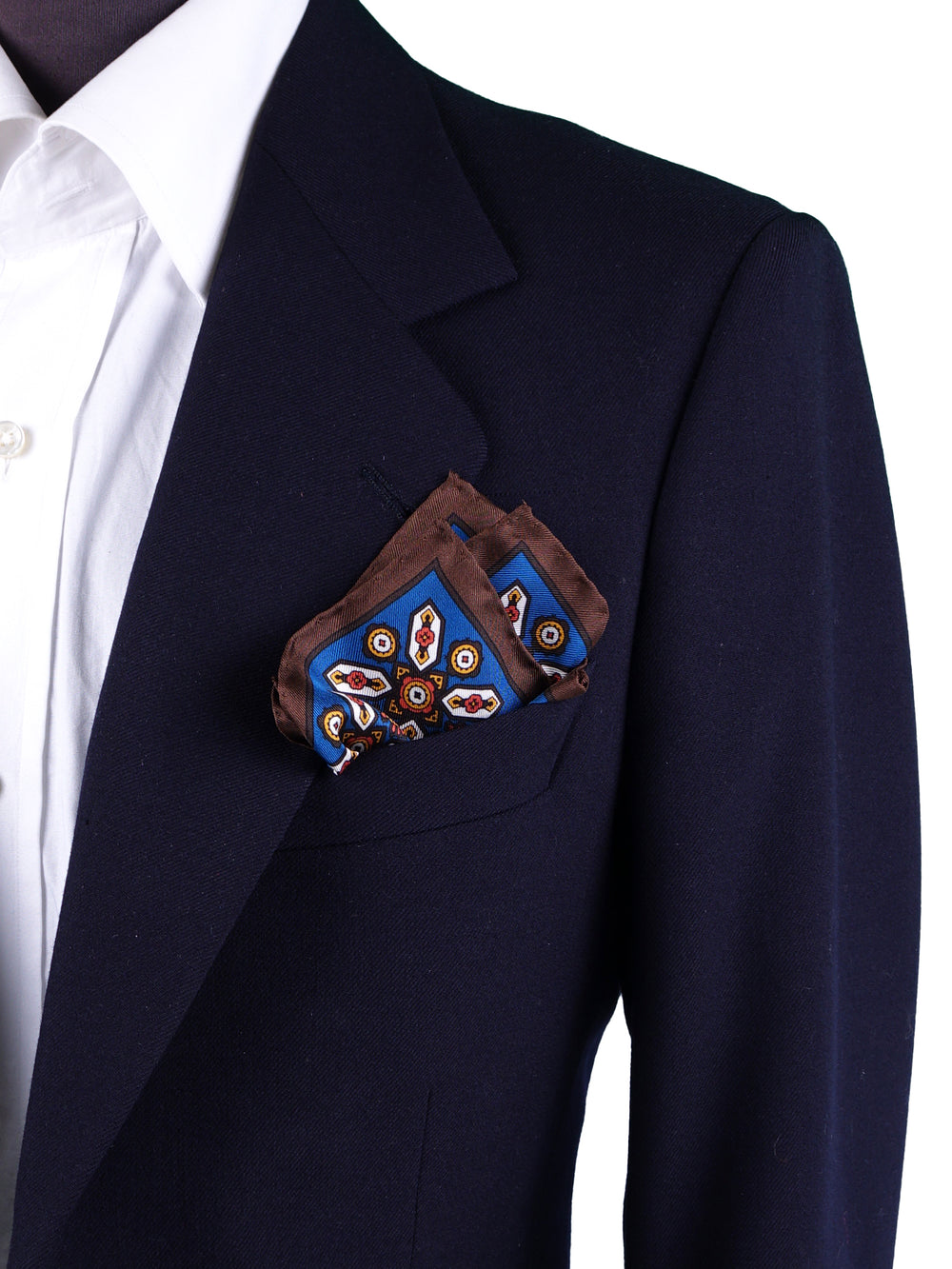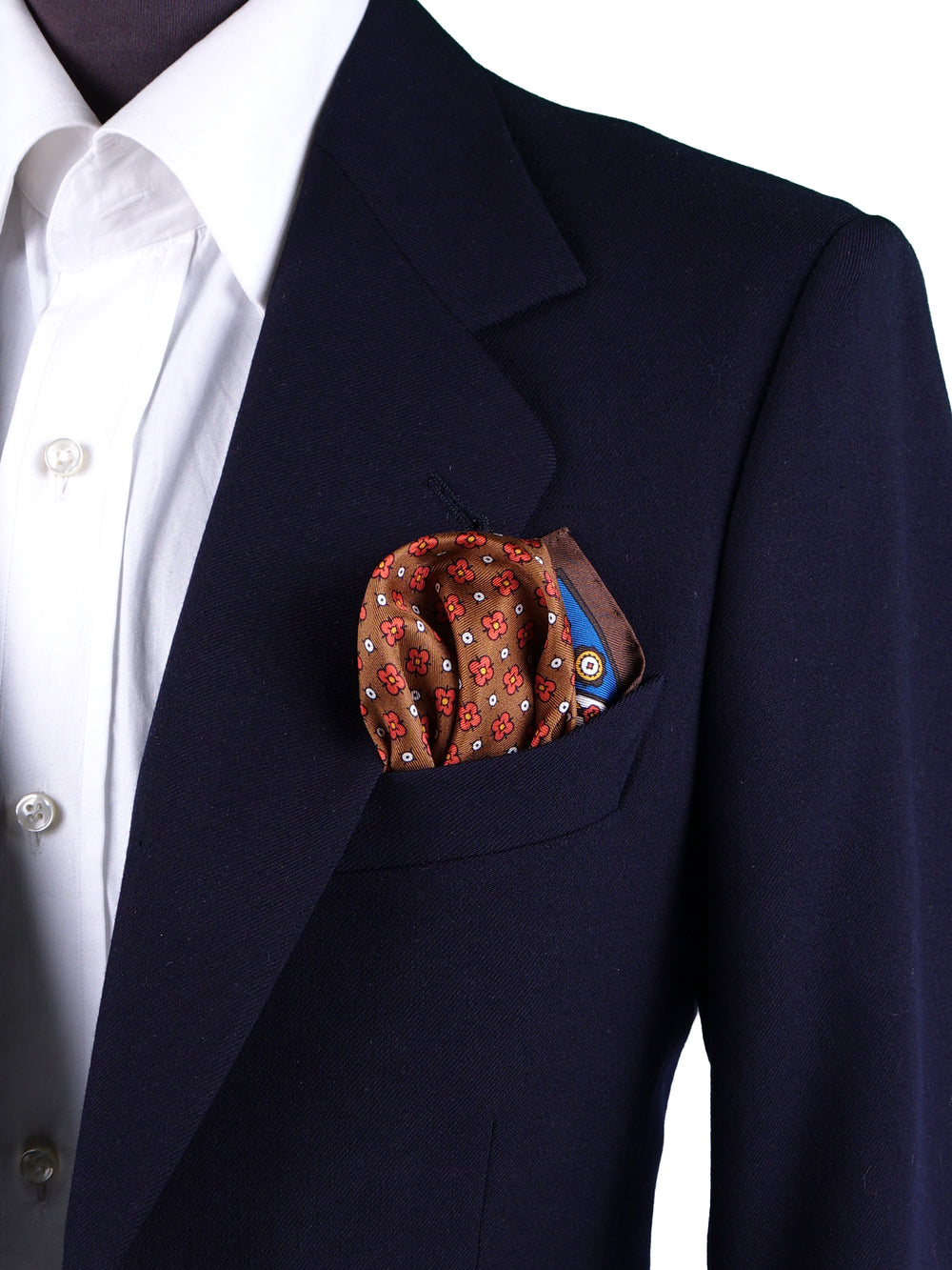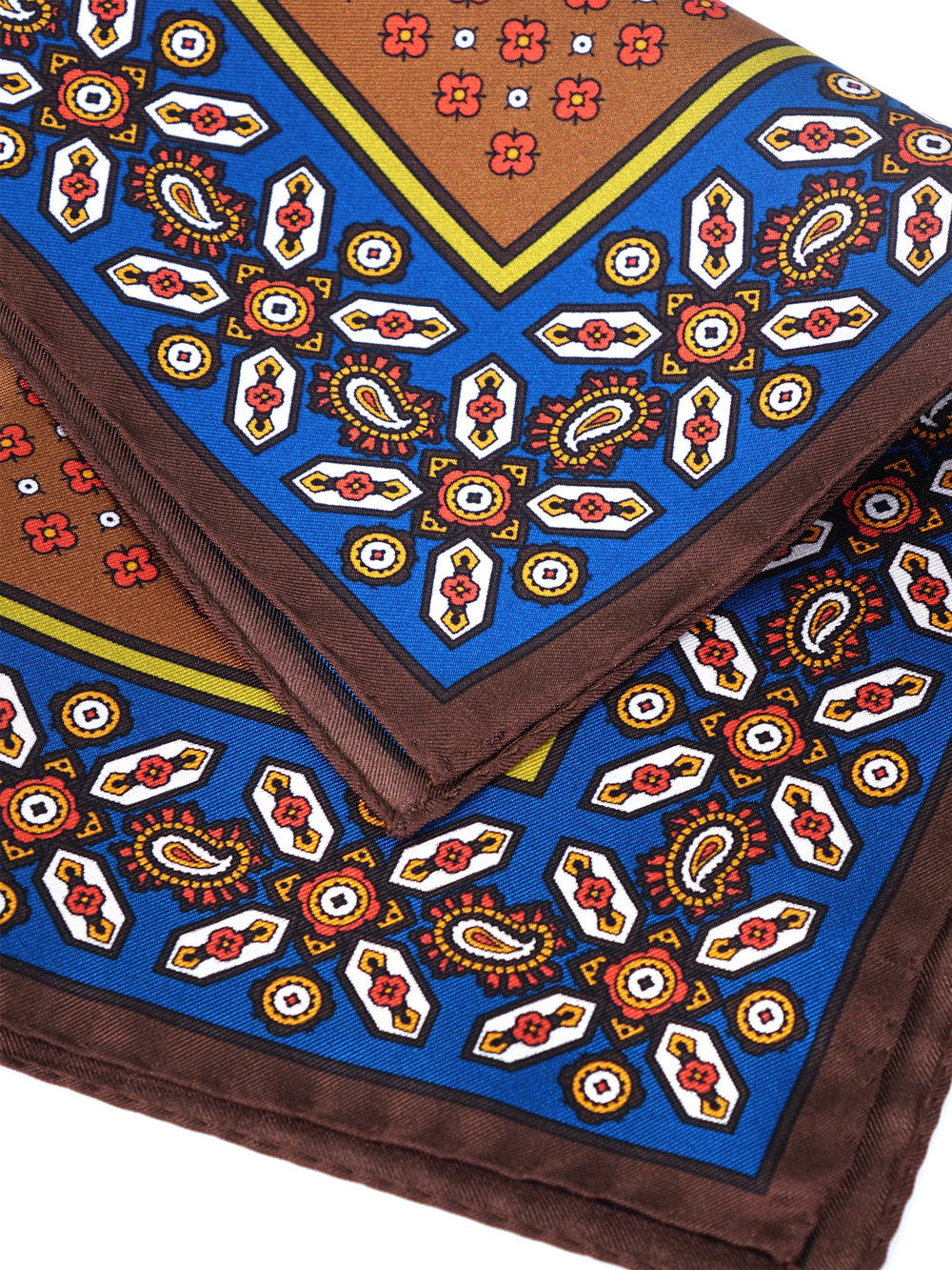 Un accessorio che è un'esplosione di colore e di stile, il pezzo forte della collezione Autunno/Inverno ZAZÀ per l'uomo che ama i dettagli che fanno la differenza. Questo fazzoletto da taschino è realizzato in purissima seta stampata italiana, un tessuto dalla lucentezza ricca e dalla mano morbida e scivolosa. Il suo design è un capolavoro di equilibrio: un campo marrone con un micro-motivo floreale arancio è incorniciato da una sontuosa bordatura blu con dettagli cachemire e geometrici, il tutto racchiuso da un bordo finale marrone scuro. Questa complessità lo rende incredibilmente versatile, permettendo di creare effetti sempre nuovi a seconda di come viene piegato nel taschino.
