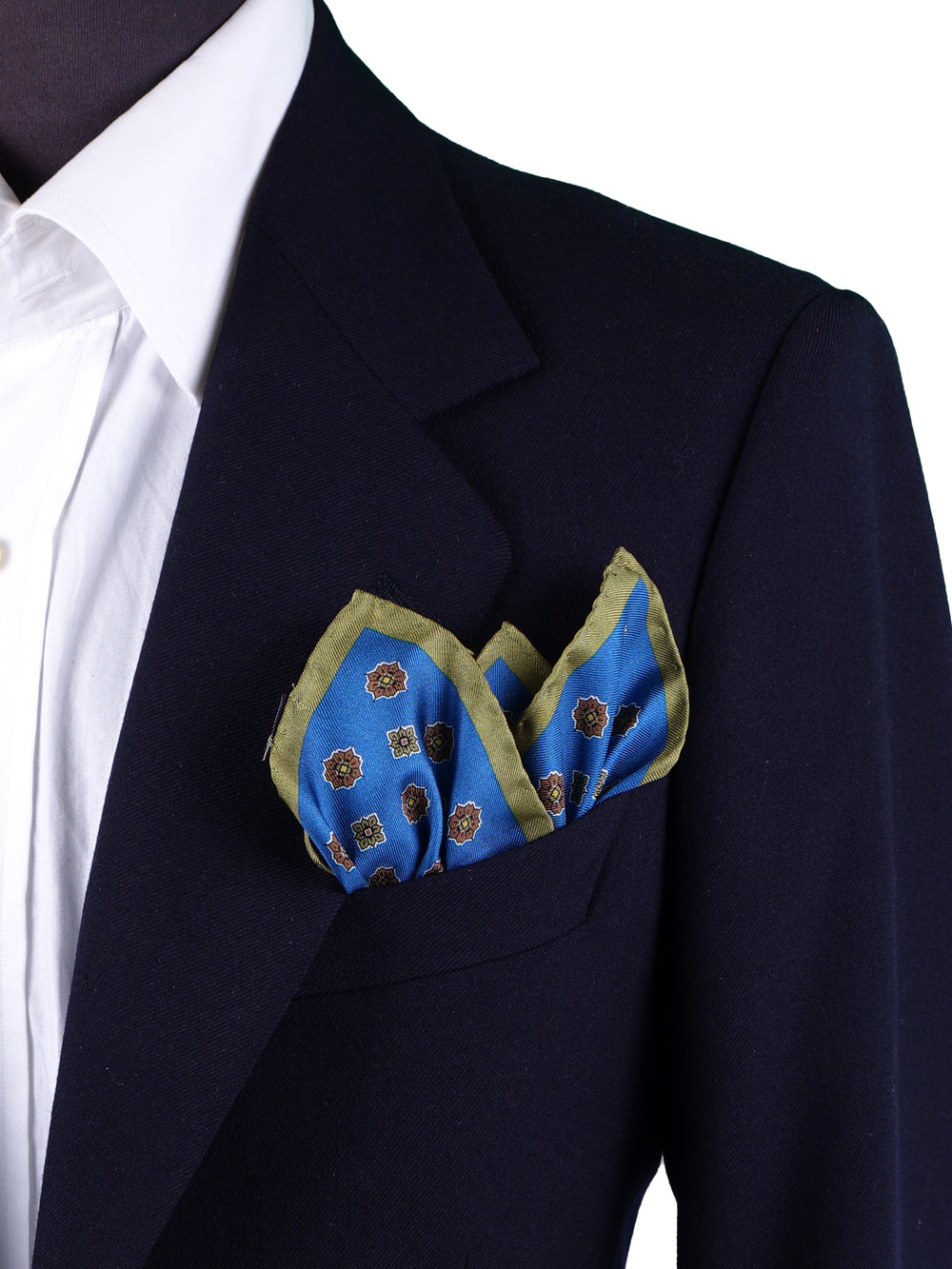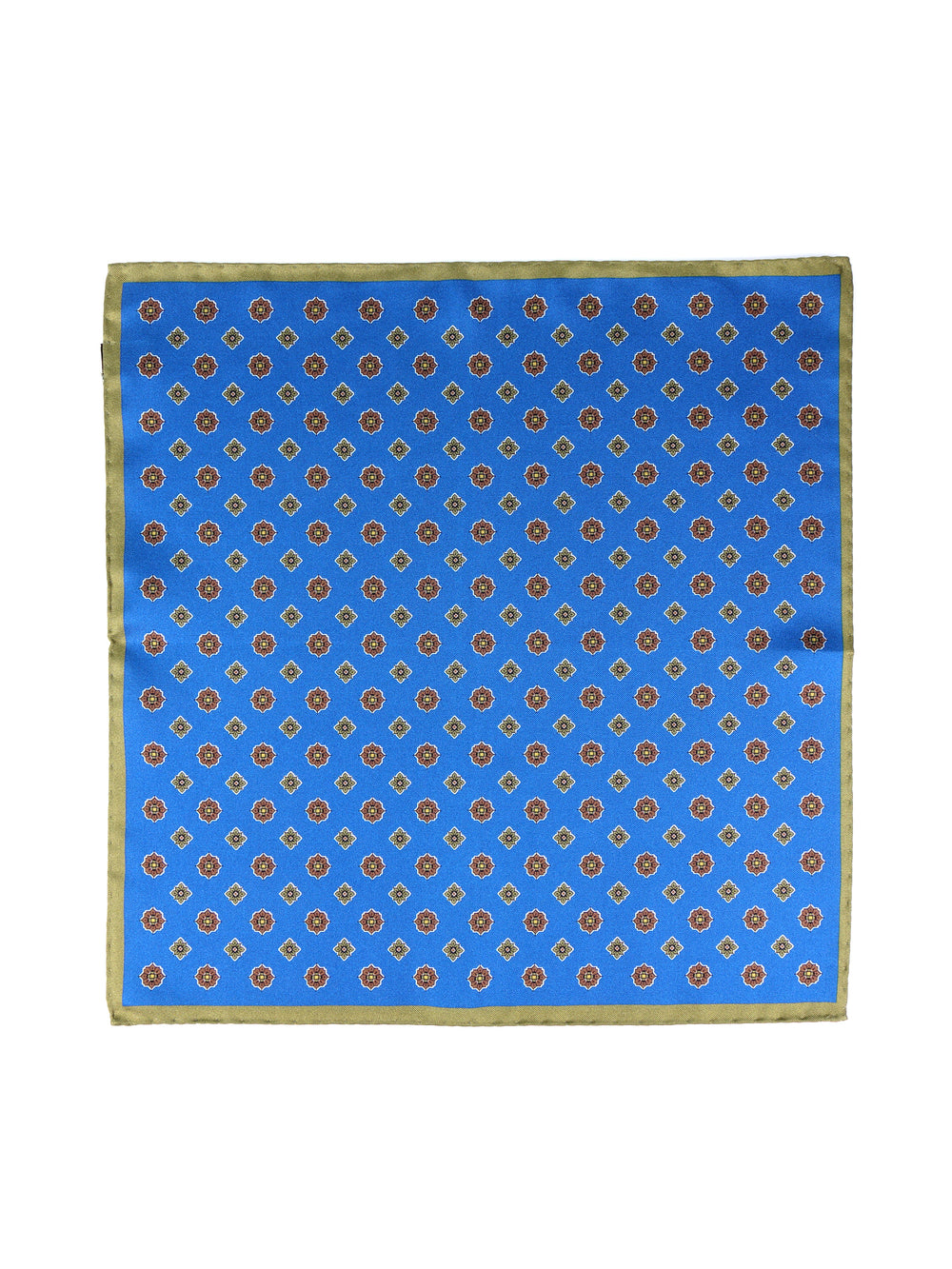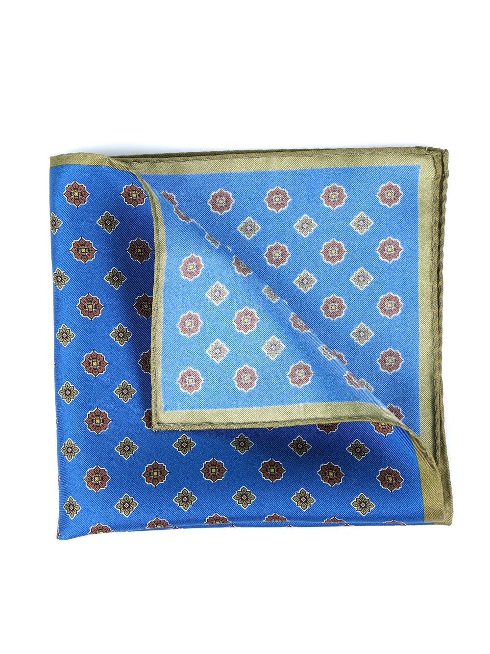 Un accessorio che è una pura dichiarazione di stile, per l'uomo che apprezza i classici intramontabili. Questo fazzoletto da taschino è realizzato in purissima seta stampata italiana, un tessuto dalla lucentezza ricca e dalla mano morbida e scivolosa. Il suo design è un capolavoro di equilibrio: un campo azzurro vibrante è impreziosito da un micro-motivo floreale con dettagli bordeaux e verdi, il tutto incorniciato da un sofisticato bordo verde oliva a contrasto. Questa doppia anima lo rende incredibilmente versatile, permettendo di creare effetti sempre nuovi a seconda di come viene piegato nel taschino.
