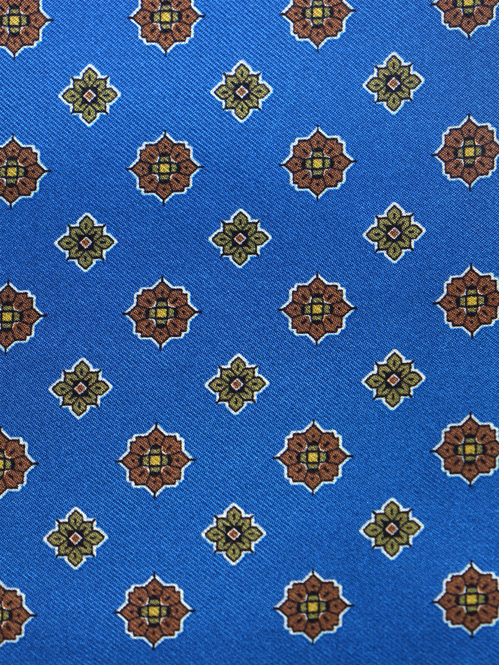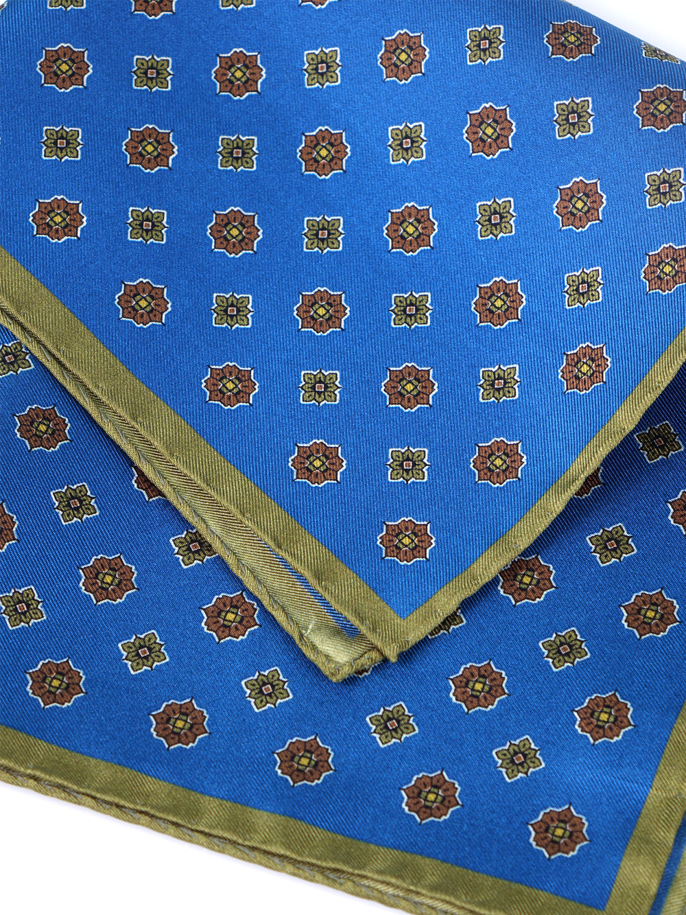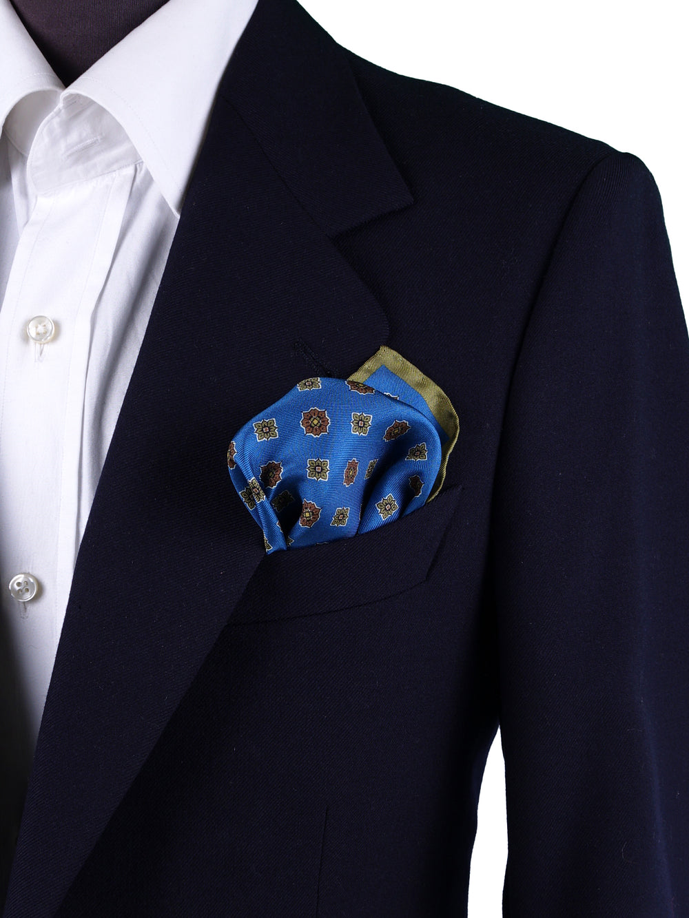 Un accessorio che è una pura dichiarazione di stile, per l'uomo che apprezza i classici intramontabili. Questo fazzoletto da taschino è realizzato in purissima seta stampata italiana, un tessuto dalla lucentezza ricca e dalla mano morbida e scivolosa. Il suo design è un capolavoro di equilibrio: un campo azzurro vibrante è impreziosito da un micro-motivo floreale con dettagli bordeaux e verdi, il tutto incorniciato da un sofisticato bordo verde oliva a contrasto. Questa doppia anima lo rende incredibilmente versatile, permettendo di creare effetti sempre nuovi a seconda di come viene piegato nel taschino.