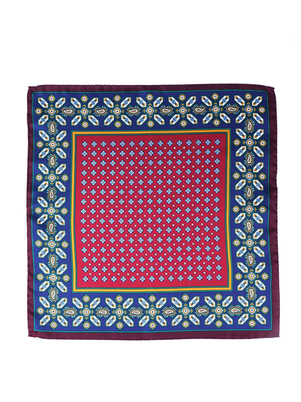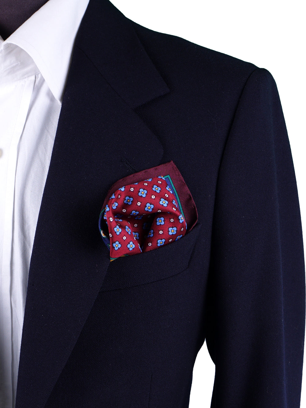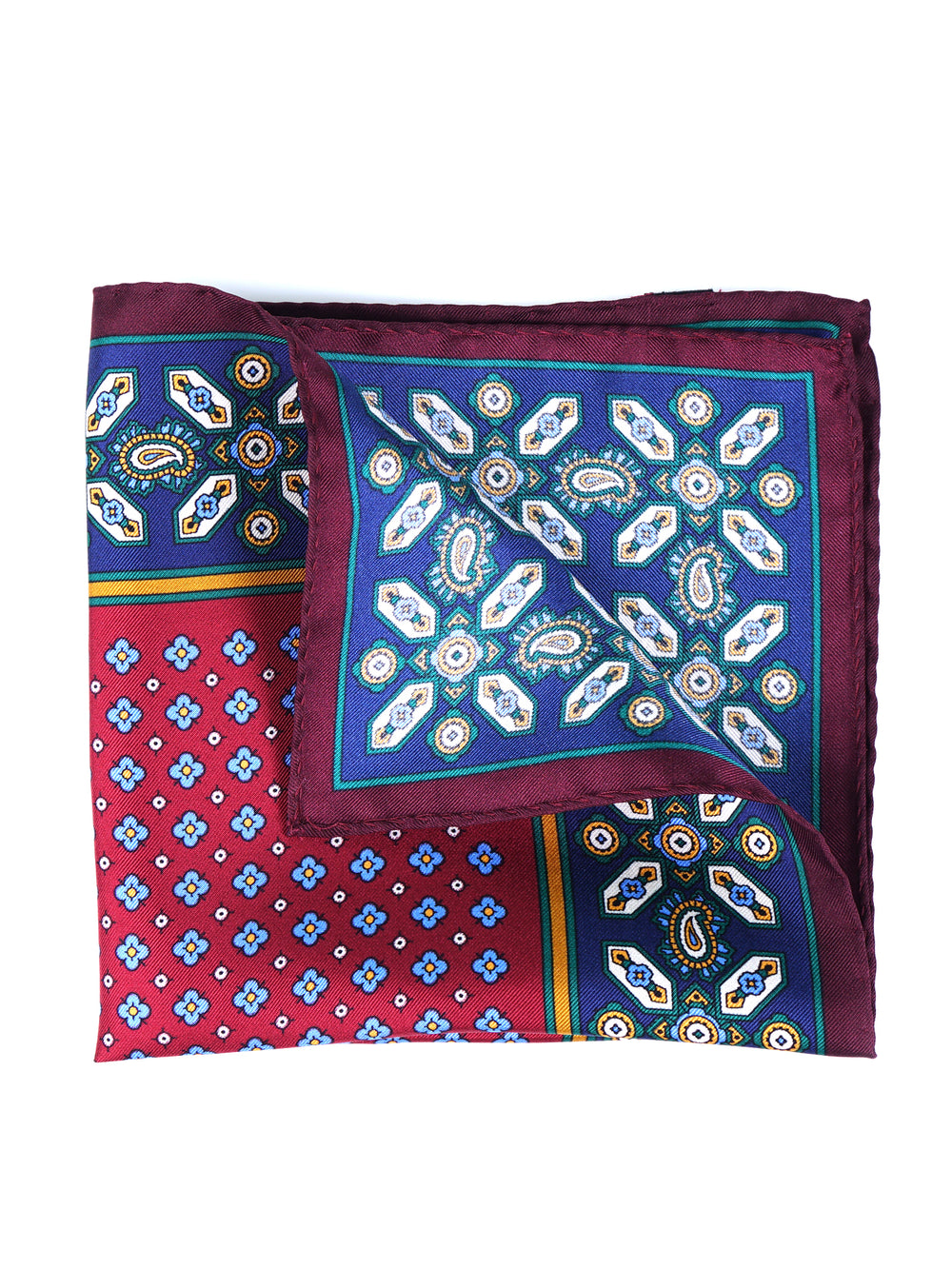 Un accessorio che è un'esplosione di colore e di stile, il pezzo forte per l'uomo che ama i dettagli che fanno la differenza. Questo fazzoletto da taschino è realizzato in purissima seta stampata italiana, un tessuto dalla lucentezza ricca e dalla mano morbida e scivolosa. Il suo design è un capolavoro di equilibrio: un campo rosso con un micro-motivo floreale azzurro è incorniciato da una sontuosa bordatura blu con dettagli cachemire e geometrici, il tutto racchiuso da un bordo finale bordeaux. Questa complessità lo rende incredibilmente versatile, permettendo di creare effetti sempre nuovi a seconda di come viene piegato nel taschino.