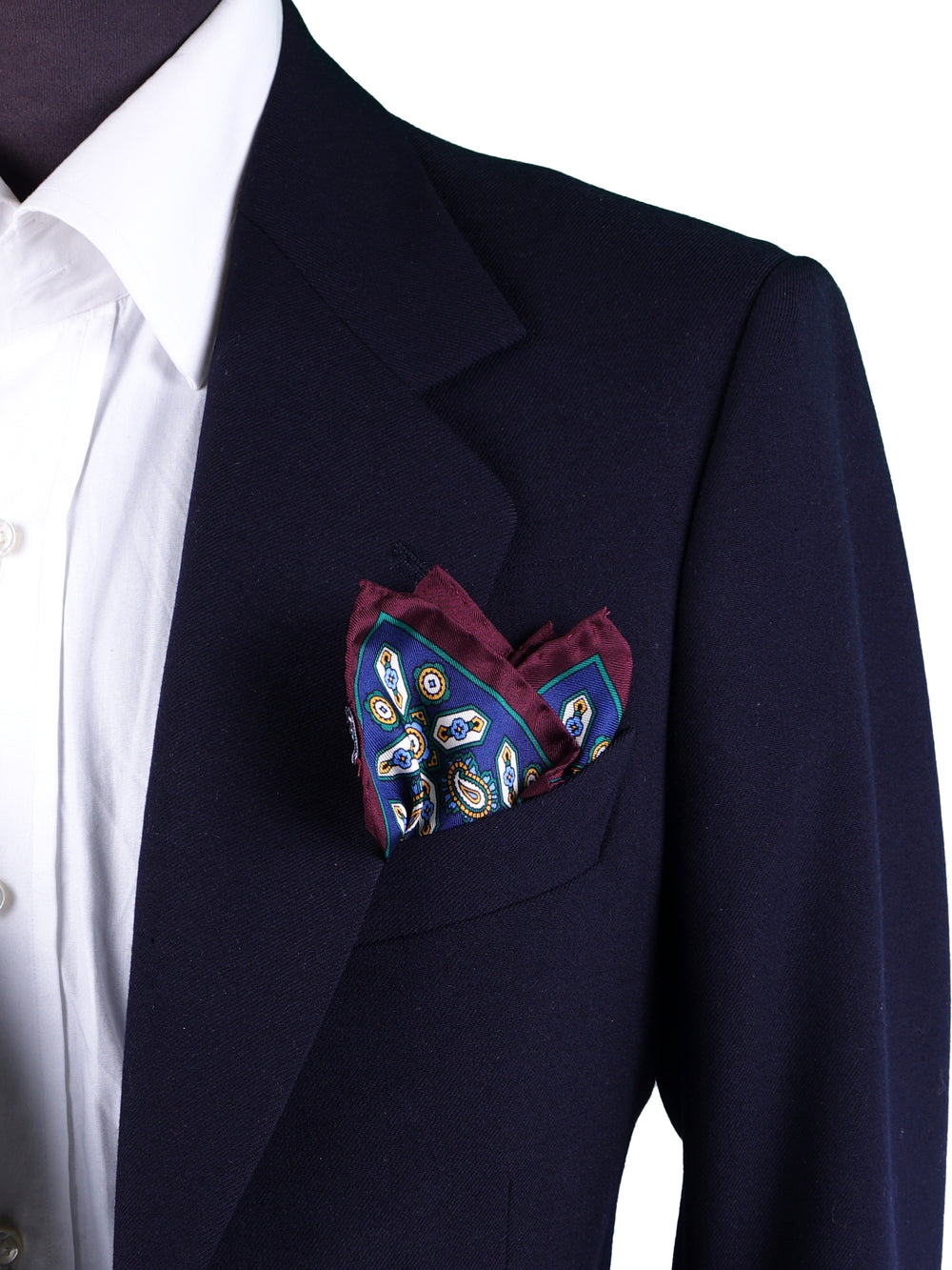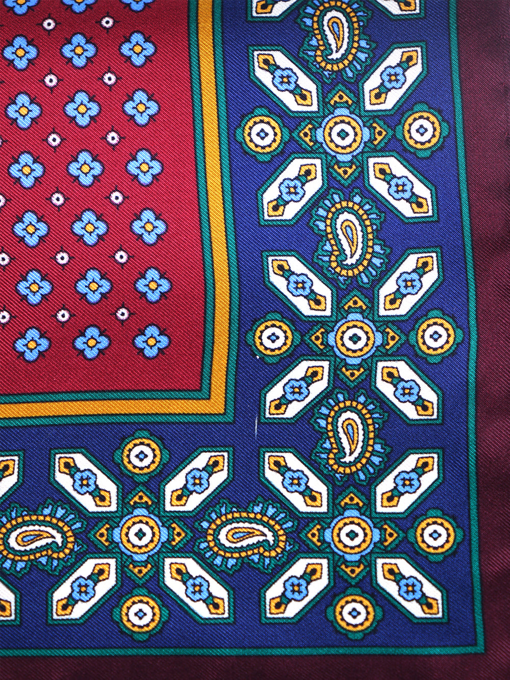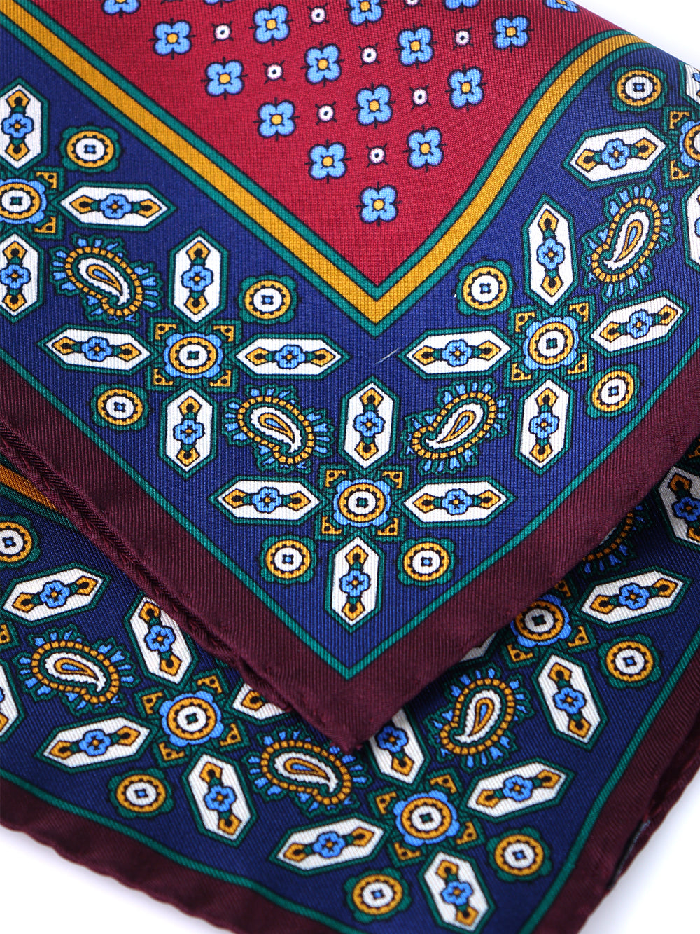Un accessorio che è un'esplosione di colore e di stile, il pezzo forte per l'uomo che ama i dettagli che fanno la differenza. Questo fazzoletto da taschino è realizzato in purissima seta stampata italiana, un tessuto dalla lucentezza ricca e dalla mano morbida e scivolosa. Il suo design è un capolavoro di equilibrio: un campo rosso con un micro-motivo floreale azzurro è incorniciato da una sontuosa bordatura blu con dettagli cachemire e geometrici, il tutto racchiuso da un bordo finale bordeaux. Questa complessità lo rende incredibilmente versatile, permettendo di creare effetti sempre nuovi a seconda di come viene piegato nel taschino.