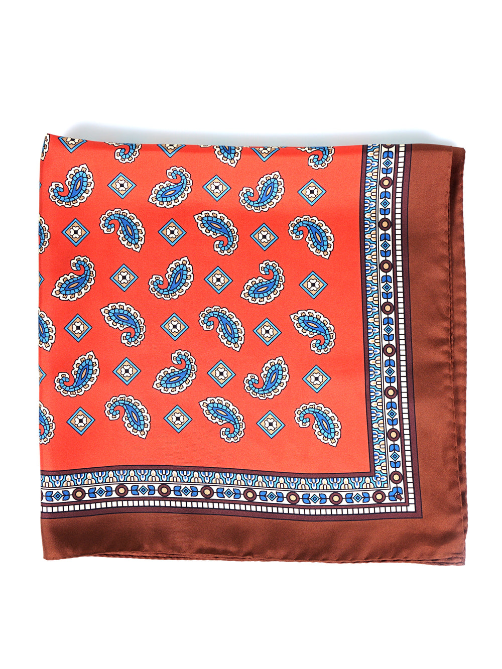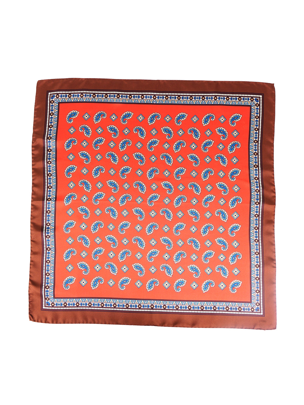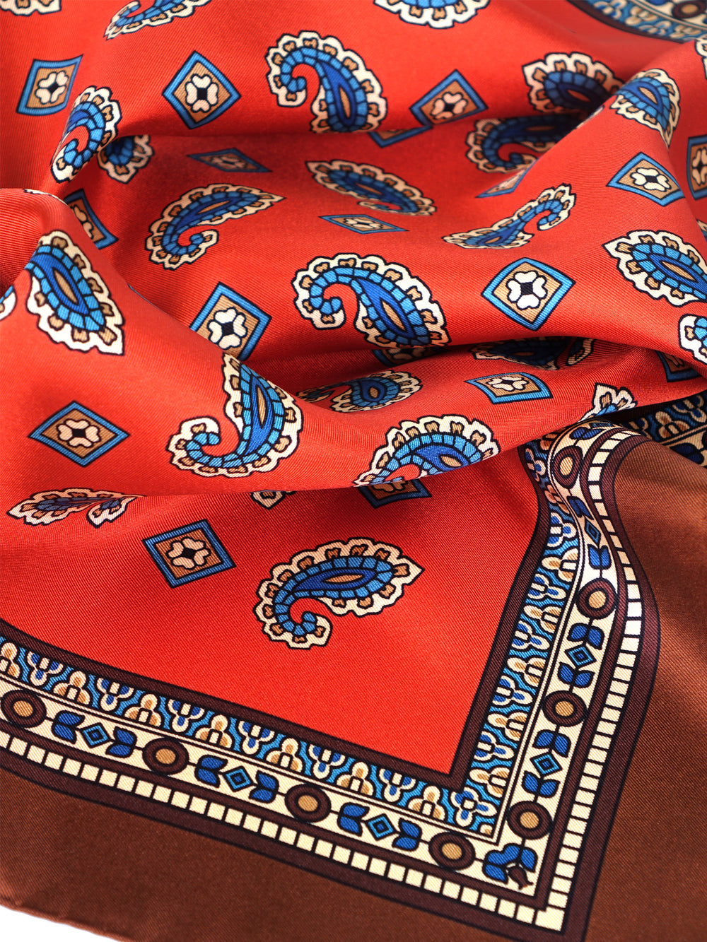 Audace, solare, carismatico. Questo foulard Zazà è una scarica di energia pura per il guardaroba maschile. Il fondo arancio bruciato cattura lo sguardo e scalda l'incarnato, mentre il bordo marrone cioccolato e il motivo paisley nei toni del blu e dell'azzurro aggiungono quella profondità necessaria per mantenere l'eleganza. È l'accessorio definitivo per l'uomo che non teme il colore e che vuole trasformare un outfit semplice in una dichiarazione di stile personale e ricercata.