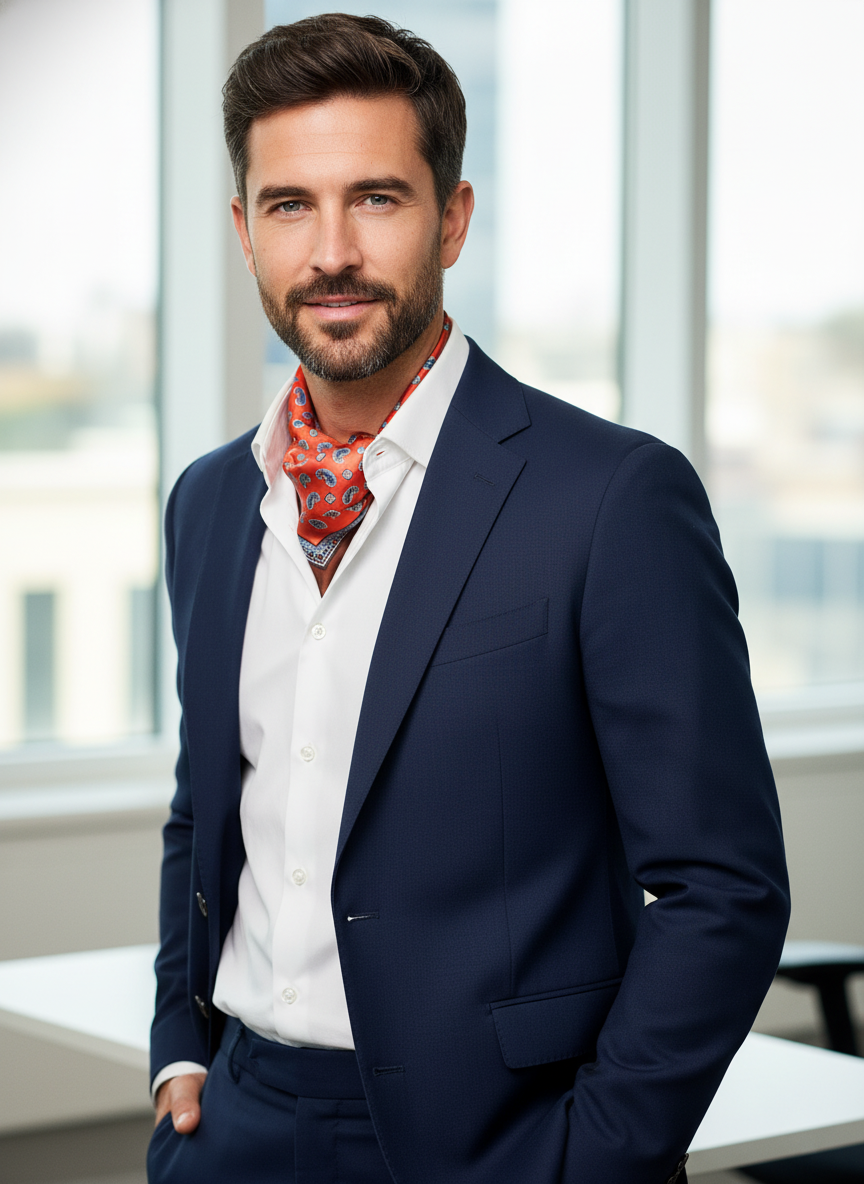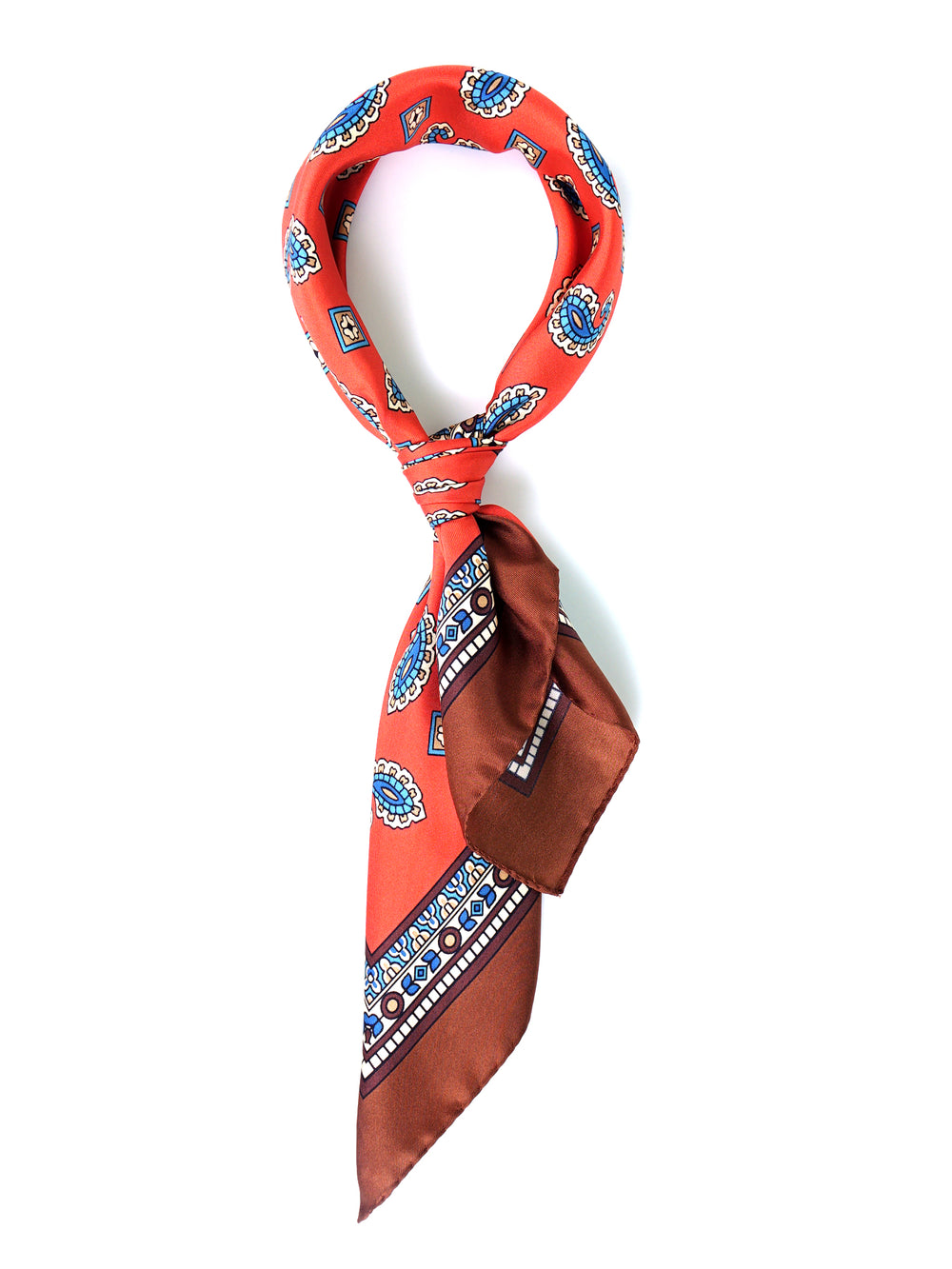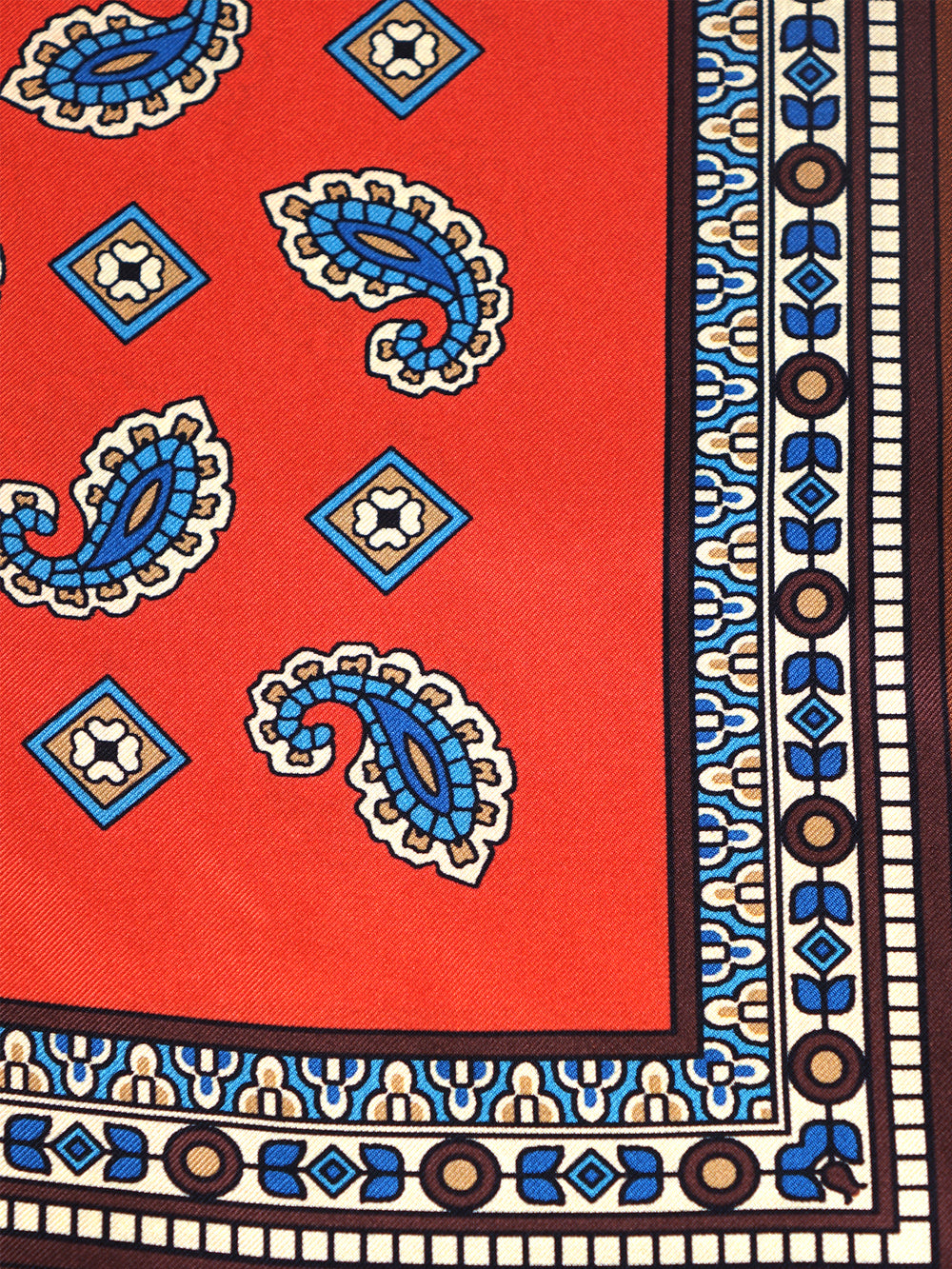 Audace, solare, carismatico. Questo foulard Zazà è una scarica di energia pura per il guardaroba maschile. Il fondo arancio bruciato cattura lo sguardo e scalda l'incarnato, mentre il bordo marrone cioccolato e il motivo paisley nei toni del blu e dell'azzurro aggiungono quella profondità necessaria per mantenere l'eleganza. È l'accessorio definitivo per l'uomo che non teme il colore e che vuole trasformare un outfit semplice in una dichiarazione di stile personale e ricercata.