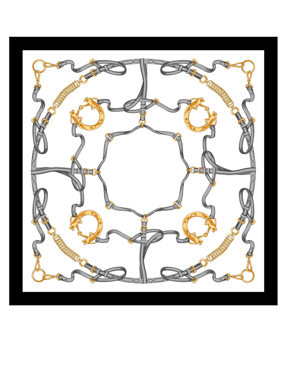 Fondo bianco con ferri da cavallo gialli, briglie grigie e cornice nera