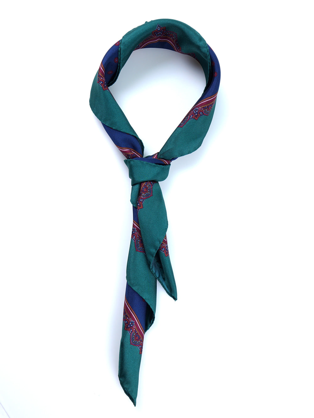 Un accessorio che è un'esplosione di colore e di stile, perfetto per chi ama i dettagli che fanno la differenza. Questo foulard è realizzato in purissima seta italiana, un tessuto dal drappeggio impeccabile e dalla mano lussuosa. Il suo design è un capolavoro di equilibrio: un campo blu, punteggiato da micro-disegni rossi, è impreziosito da un sontuoso medaglione centrale che ricorda un mandala, ricco di dettagli ocra e bordeaux. Il tutto è incorniciato da un audace bordo color verde ottanio, che rende questo pezzo unico e di grande personalità. La sua generosa misura di 70x70 cm lo rende estremamente versatile.
