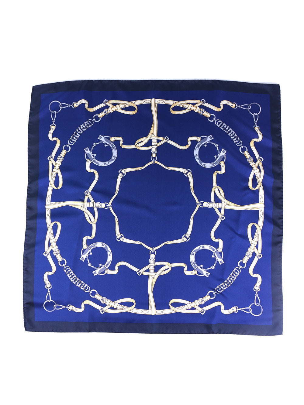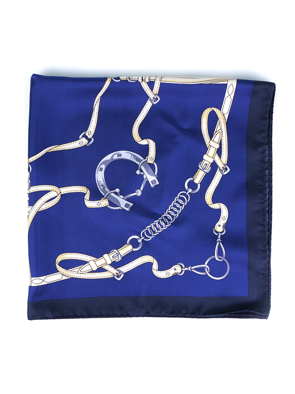 Un accessorio che è una dichiarazione di stile, che evoca un mondo di eleganza aristocratica e di amore per la tradizione. Realizzato in purissima seta italiana, offre un drappeggio fluido e una mano incredibilmente morbida. La stampa, un omaggio all'arte della selleria, intreccia finimenti, morsi e fibbie su un vibrante fondo blu royal, incorniciato da un profondo bordo blu navy. È un pezzo iconico che trascende il genere e le stagioni. La sua misura di 70x70 cm lo rende estremamente versatile, un vero e proprio jolly del guardaroba.