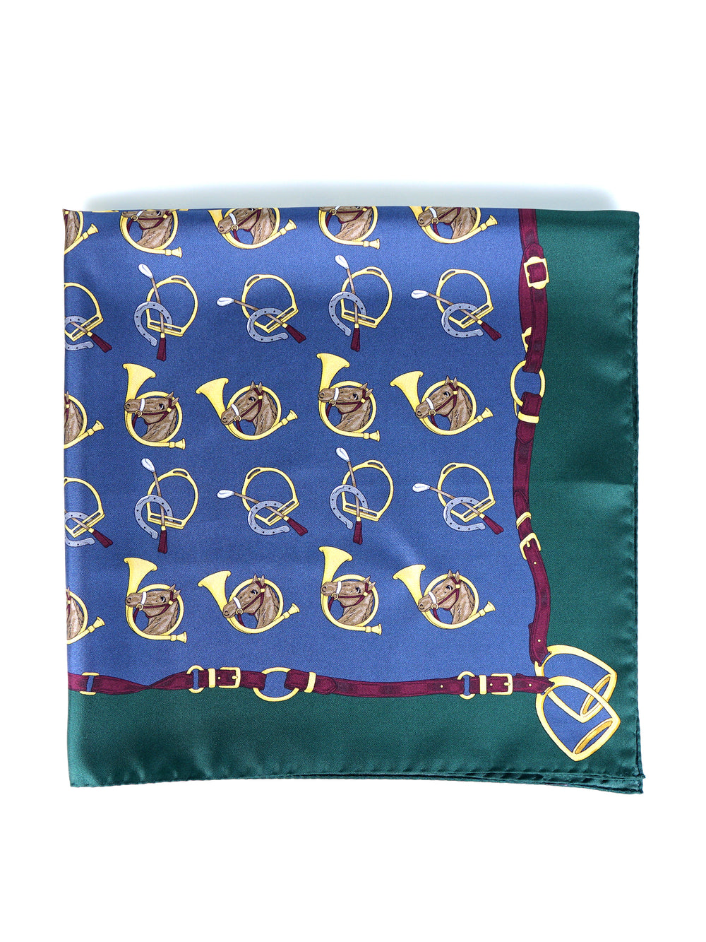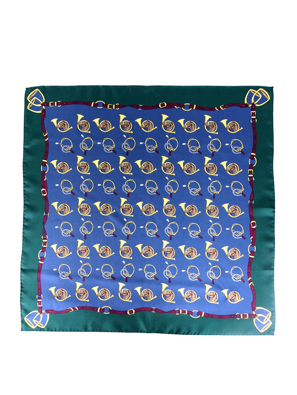 Un accessorio che è un racconto, un pezzo da intenditore che evoca l'eleganza aristocratica e la tradizione della caccia a cavallo. Questo foulard è realizzato in purissima seta italiana, un tessuto dal drappeggio impeccabile e dalla mano lussuosa. Il suo design è un capolavoro di equilibrio: un campo blu vibrante è impreziosito da un motivo ripetuto di corni da caccia, teste di cavallo e staffe, il tutto incorniciato da un ricco bordo verde bosco. È un pezzo iconico, perfetto per l'uomo che ama uno stile che parla di cultura, di passione per la vita all'aria aperta e di un'eleganza non convenzionale.
