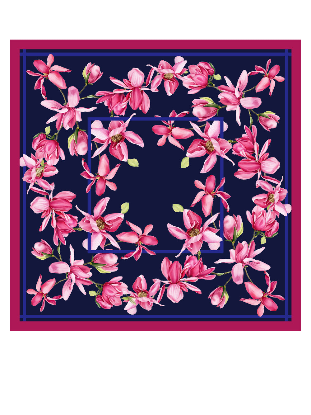 Fondo blu con fiori fucsia, foglie verdi e cornice fucsia