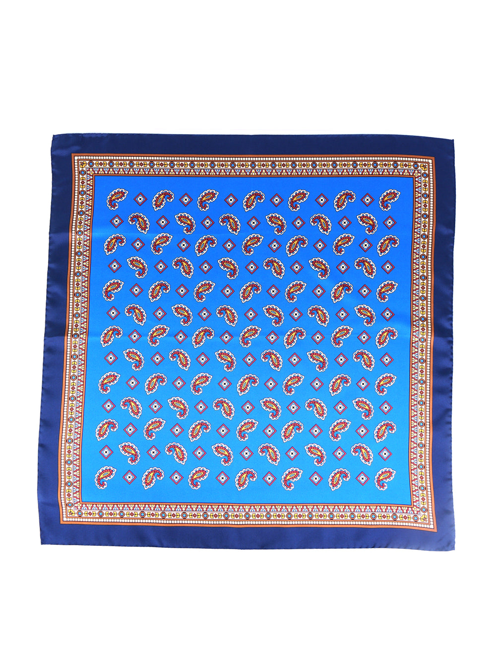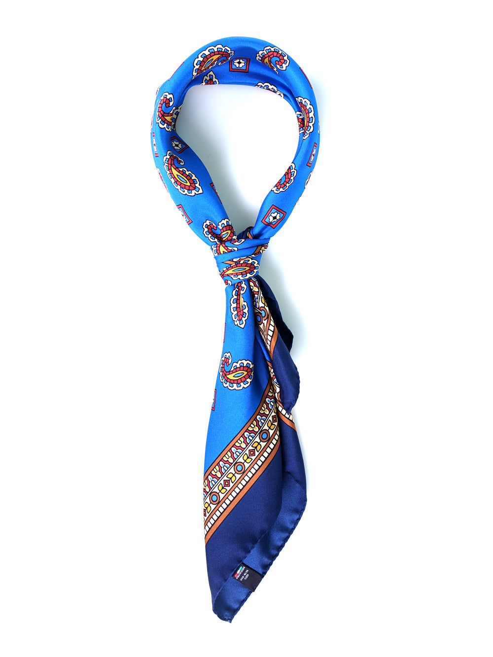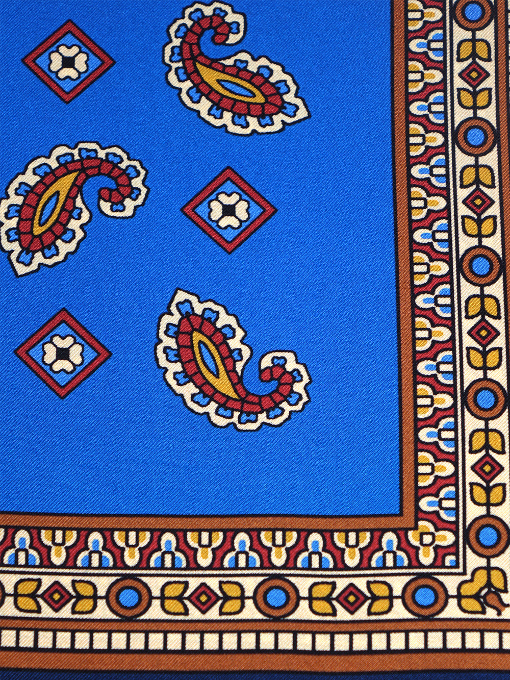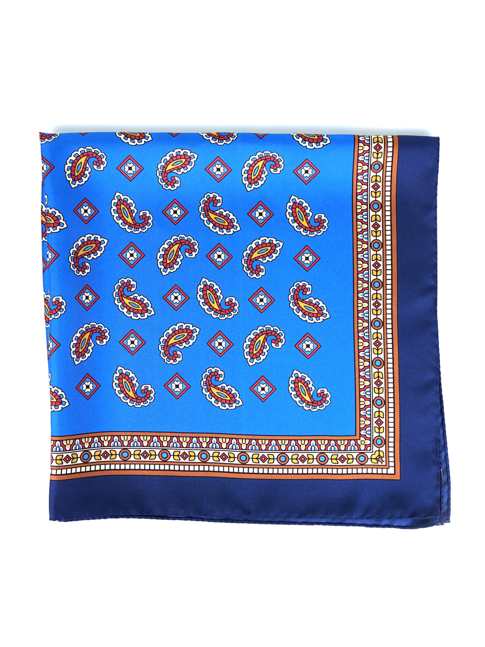 Un accessorio che segna il passaggio da un'eleganza ordinaria a uno stile da vero conoscitore. Questo foulard da uomo è realizzato in purissima seta stampata italiana, un tessuto dal drappeggio impeccabile e dalla mano lussuosa. L'iconico motivo cachemire (paisley) si alterna a piccoli disegni geometrici su un vibrante fondo blu royal. La ricca cornice, con i suoi toni caldi del marrone e del giallo, crea un contrasto sofisticato. La sua dimensione generosa lo rende perfetto per essere indossato al collo, sostituendo la cravatta con un tocco di classe e personalità unici.
