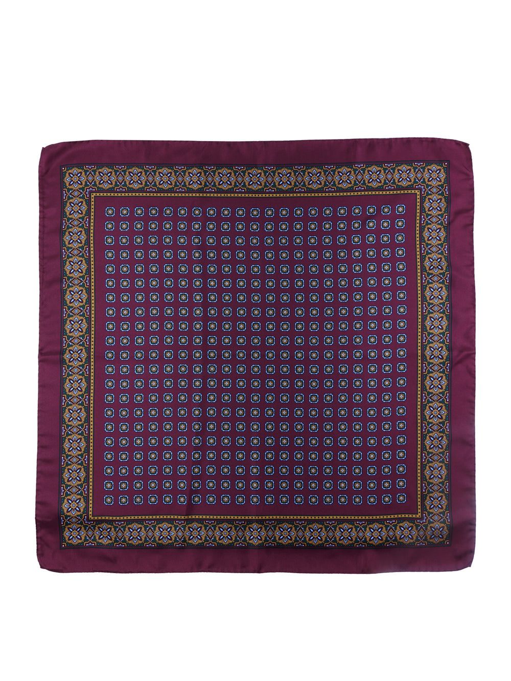 Un accessorio che evoca un'eleganza classica e opulenta, perfetto per chi ama i dettagli che raccontano una storia. Questo foulard è realizzato in purissima seta italiana, un tessuto dal drappeggio impeccabile e dalla mano lussuosa. Il suo design è un capolavoro di equilibrio: un raffinato micro-motivo geometrico centrale su un fondo bordeaux profondo è incorniciato da una ricca bordatura a contrasto, che gioca sui toni dell'ocra, del blu e del verde. Un pezzo iconico che trascende il genere, perfetto per definire il proprio stile con un tocco di classe.