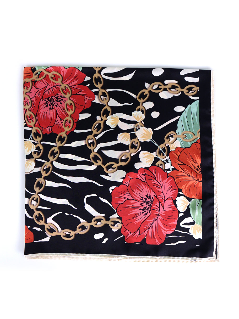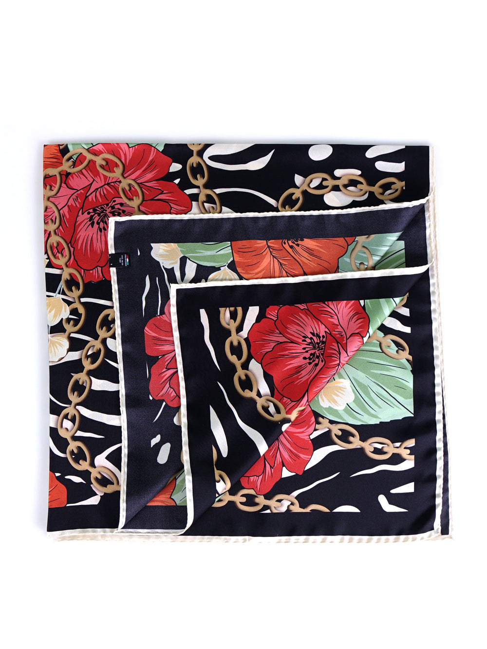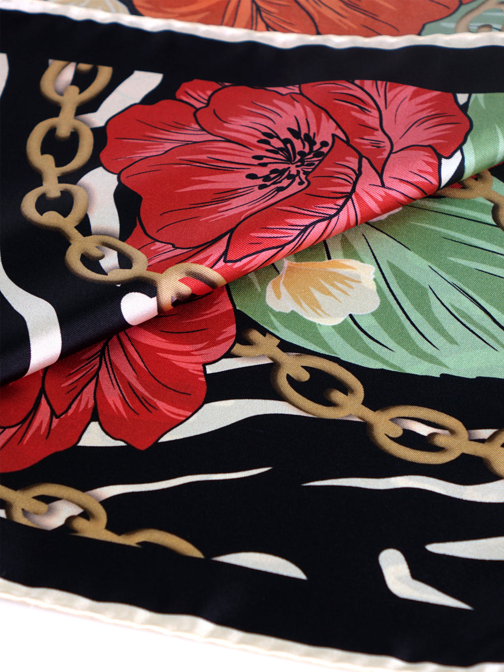 Questo foulard è un pezzo d'arte da indossare, un classico intramontabile che non può mancare nel guardaroba di una donna. Il suo formato quadrato 90x90 cm è la tela perfetta per una stampa ricca di storia, che fonde la delicatezza dei fiori con il carattere deciso delle catene. Realizzato in un prezioso twill di seta e rifinito con un orlo arrotolato a mano, è un simbolo di un'eleganza che non ha tempo, un vero e proprio investimento nel proprio stile.