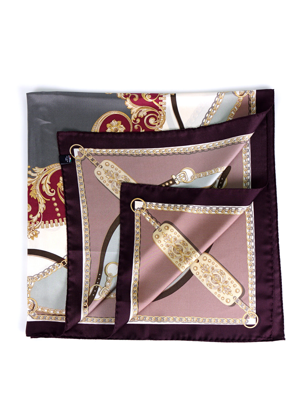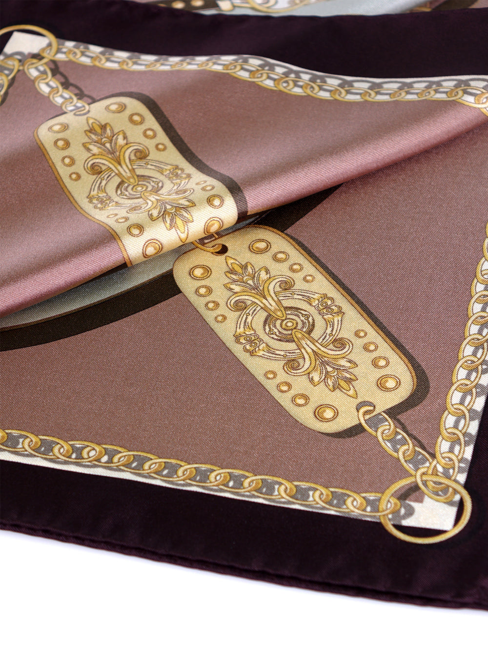 Questo foulard è un pezzo d'arte da indossare, un classico intramontabile che non può mancare nel guardaroba di una donna. Il suo formato quadrato 90x90 cm è la tela perfetta per una stampa ricca di storia, che celebra la ricchezza dello stile Barocco con un intreccio di catene e riccioli dorati. Realizzato in un prezioso twill di seta e rifinito con un orlo arrotolato a mano, è un simbolo di un'eleganza che non ha tempo, un vero e proprio investimento nel proprio stile.
