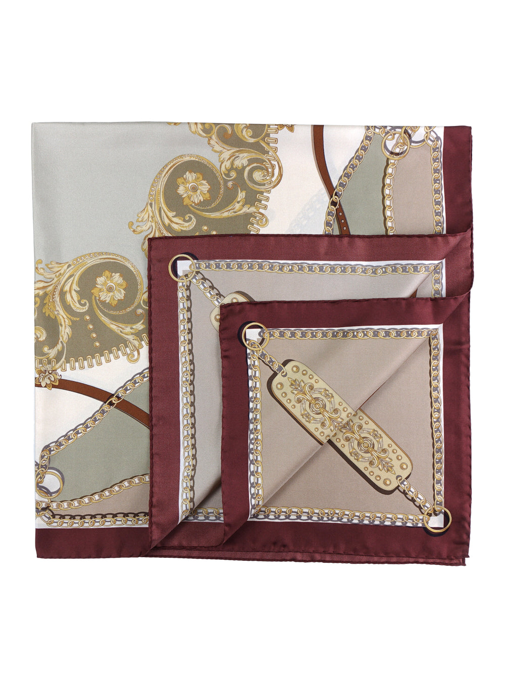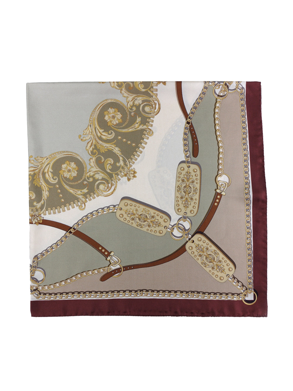 Questo foulard è un pezzo d'arte da indossare, un classico intramontabile che non può mancare nel guardaroba di una donna. Il suo formato quadrato 90x90 cm è la tela perfetta per una stampa ricca di storia, che celebra la ricchezza dello stile Barocco con un intreccio di catene e riccioli dorati. Realizzato in un prezioso twill di seta e rifinito con un orlo arrotolato a mano, è un simbolo di un'eleganza che non ha tempo, un vero e proprio investimento nel proprio stile.