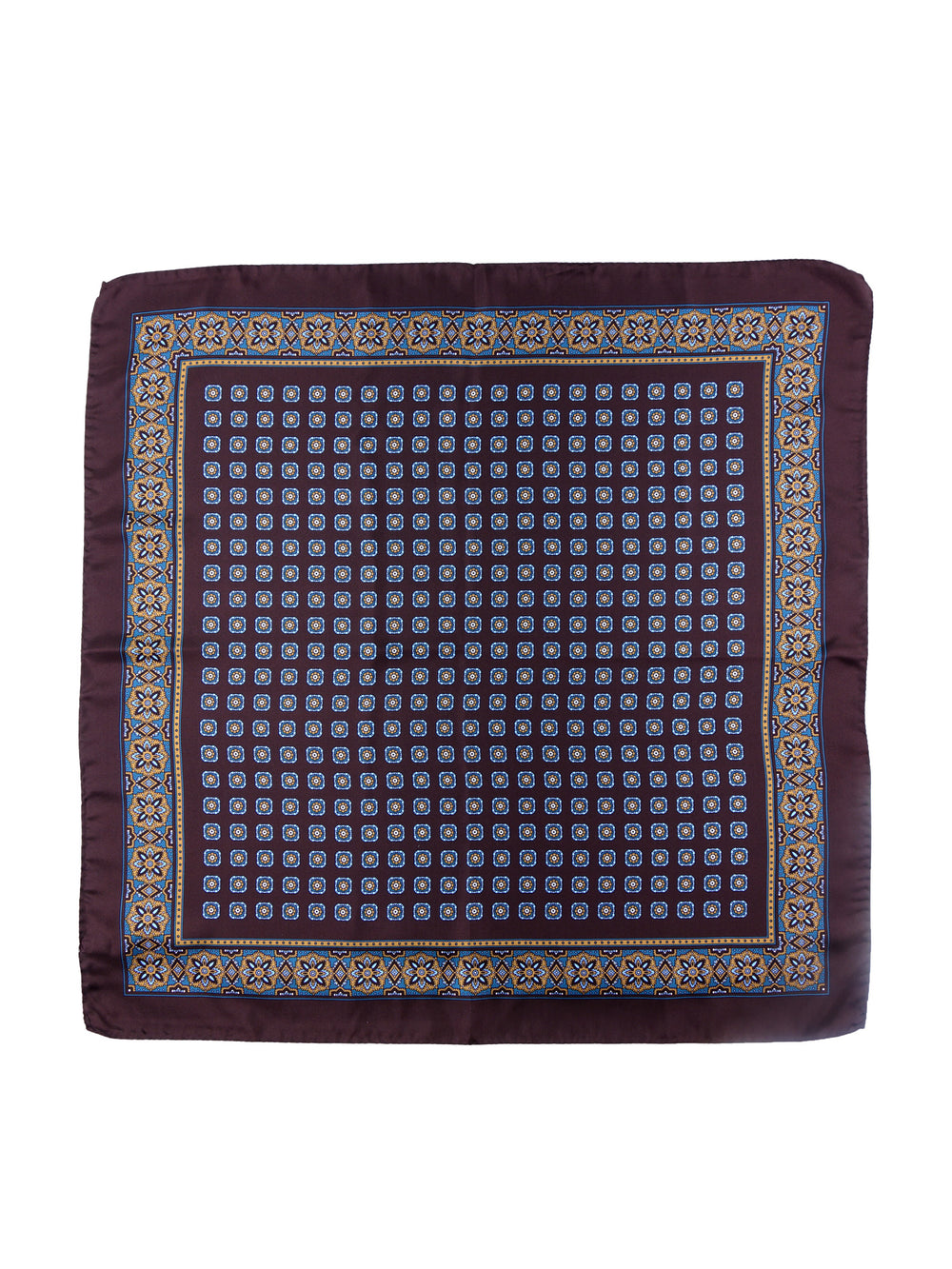 Un accessorio che segna il passaggio da un'eleganza ordinaria a uno stile da vero conoscitore. Questo foulard da uomo è realizzato in purissima seta stampata italiana, un tessuto dal drappeggio impeccabile e dalla mano lussuosa. Il suo design è un capolavoro di equilibrio: un raffinato micro-motivo geometrico centrale è incorniciato da una ricca bordatura a contrasto, che gioca sulla freschezza dell'azzurro e sul calore dell'ocra. La sua dimensione generosa lo rende perfetto per essere indossato al collo, sostituendo la cravatta con un tocco di classe e personalità unici.