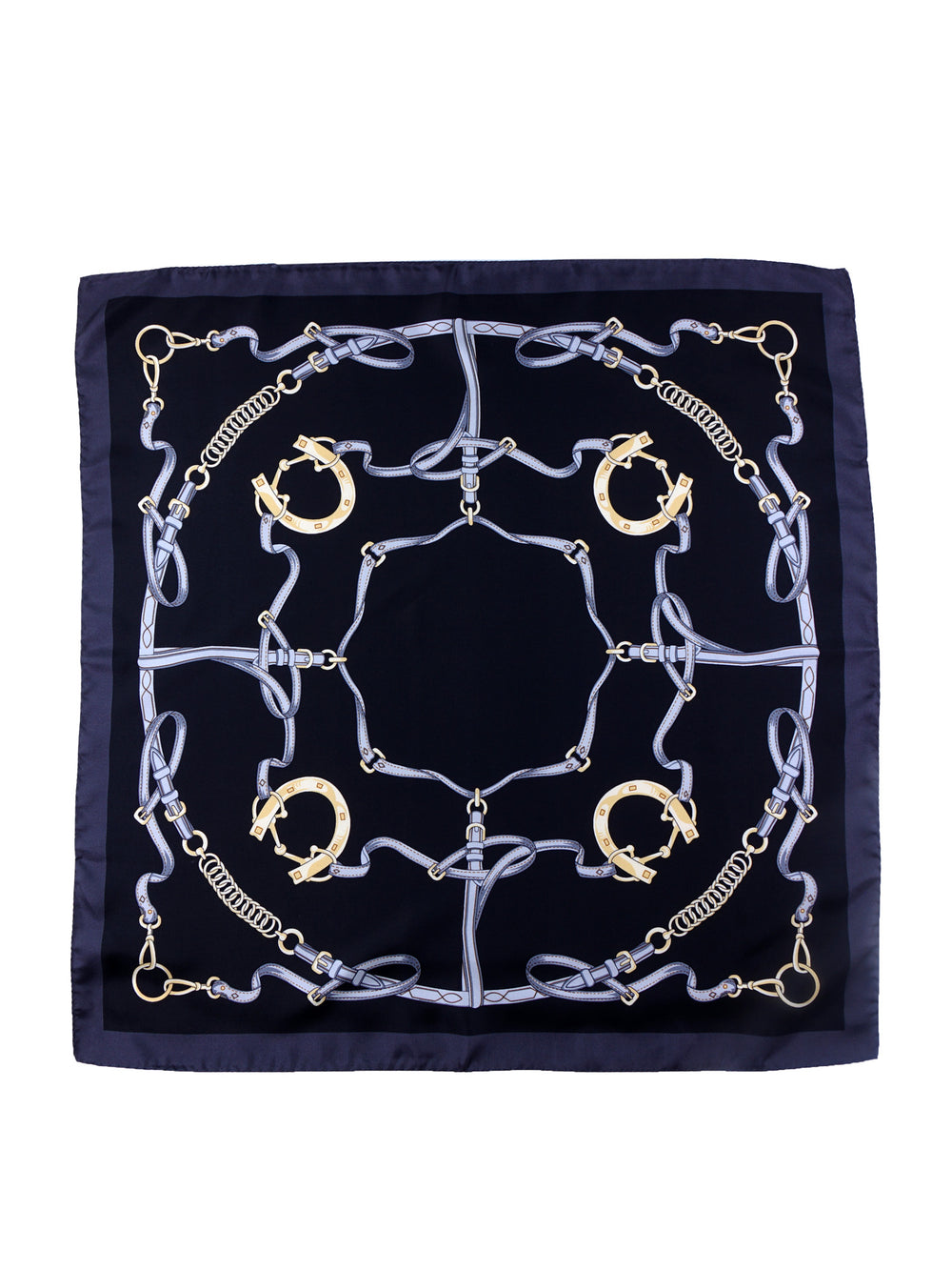 Questo foulard è più di un accessorio: è una dichiarazione di stile che evoca un mondo di eleganza aristocratica e di amore per la tradizione. Realizzato in purissima seta italiana, offre un drappeggio fluido e una mano incredibilmente morbida. La stampa, un omaggio all'arte della selleria, intreccia finimenti, morsi e fibbie dorate su un fondo nero profondo e assoluto, creando un pezzo iconico che trascende il genere e le stagioni. La sua misura di 70x70 cm lo rende estremamente versatile, un vero e proprio jolly del guardaroba.