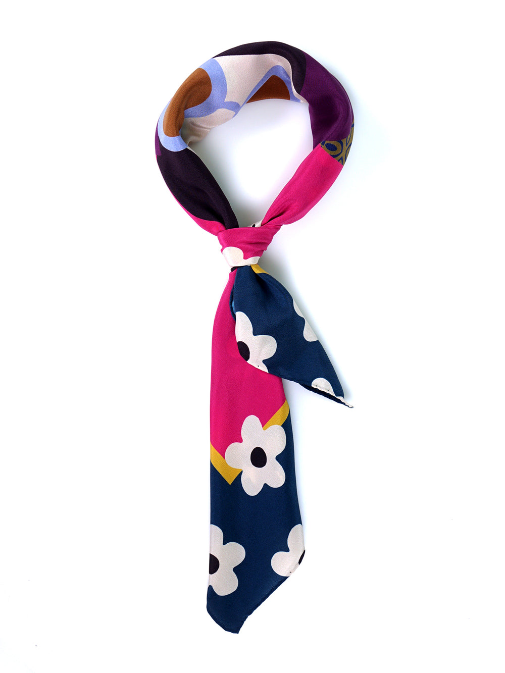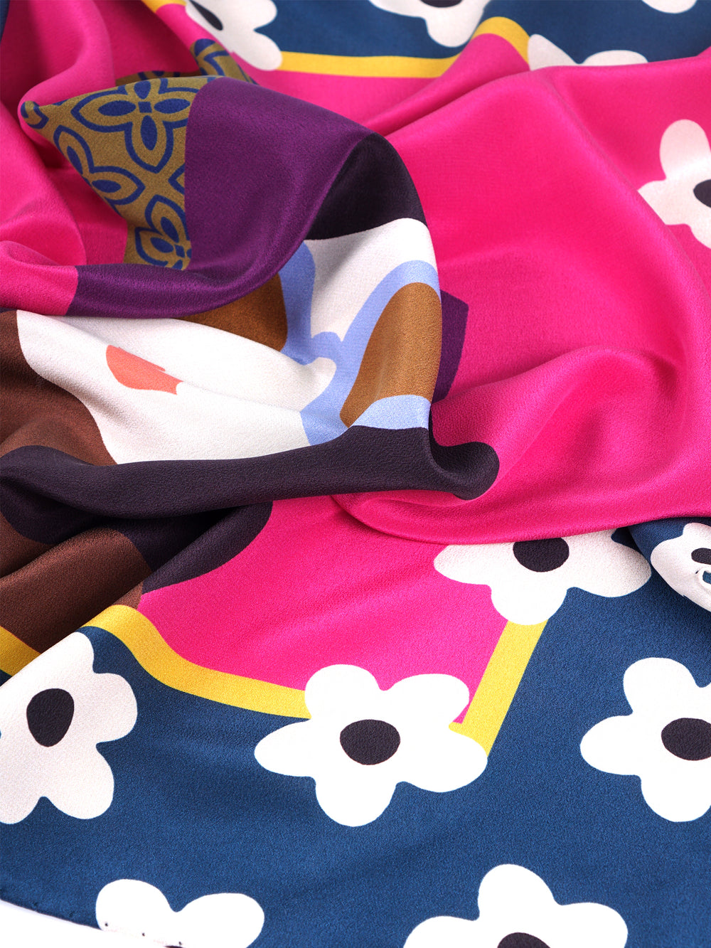 Un accessorio che è una vera e propria opera d'arte da indossare, un pezzo di design che cattura lo sguardo con la sua audacia cromatica e il suo spirito pop. Questo foulard è realizzato in pregiato crespo di seta, un tessuto dalla mano leggermente granulosa e dall'aspetto opaco che esalta la profondità dei colori. Al centro, il ritratto stilizzato di una donna misteriosa e chic, con grandi occhiali da sole e un cappello alla moda, su un vibrante sfondo fucsia. La scena è incorniciata da un motivo floreale di ispirazione anni '60, in una palette grafica di blu, bianco e giallo. È il foulard perfetto per la donna che non teme di essere protagonista e ama gli accessori che raccontano una storia.