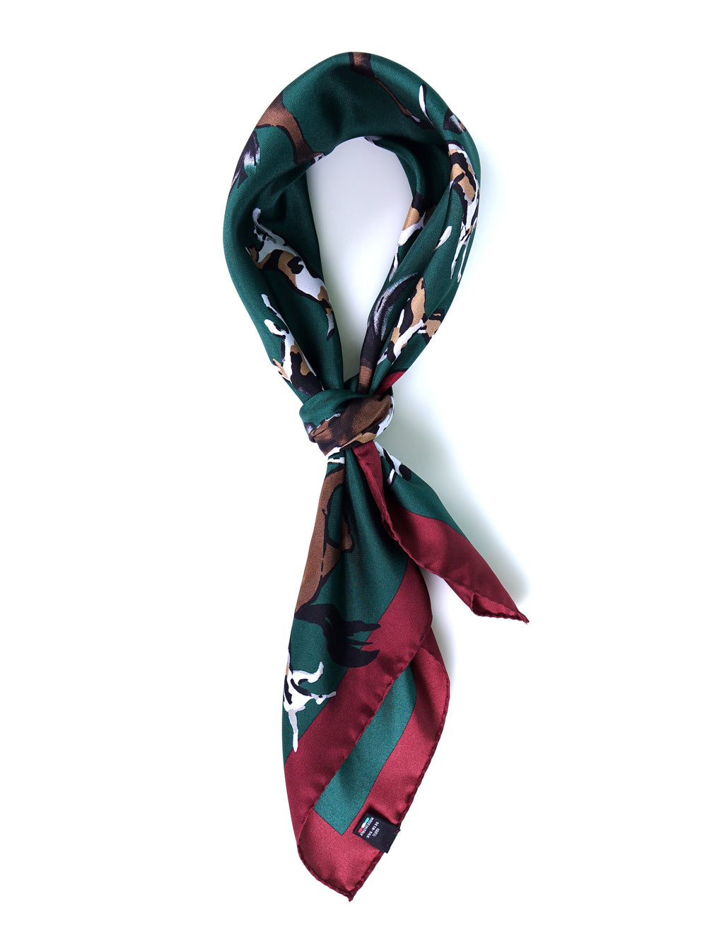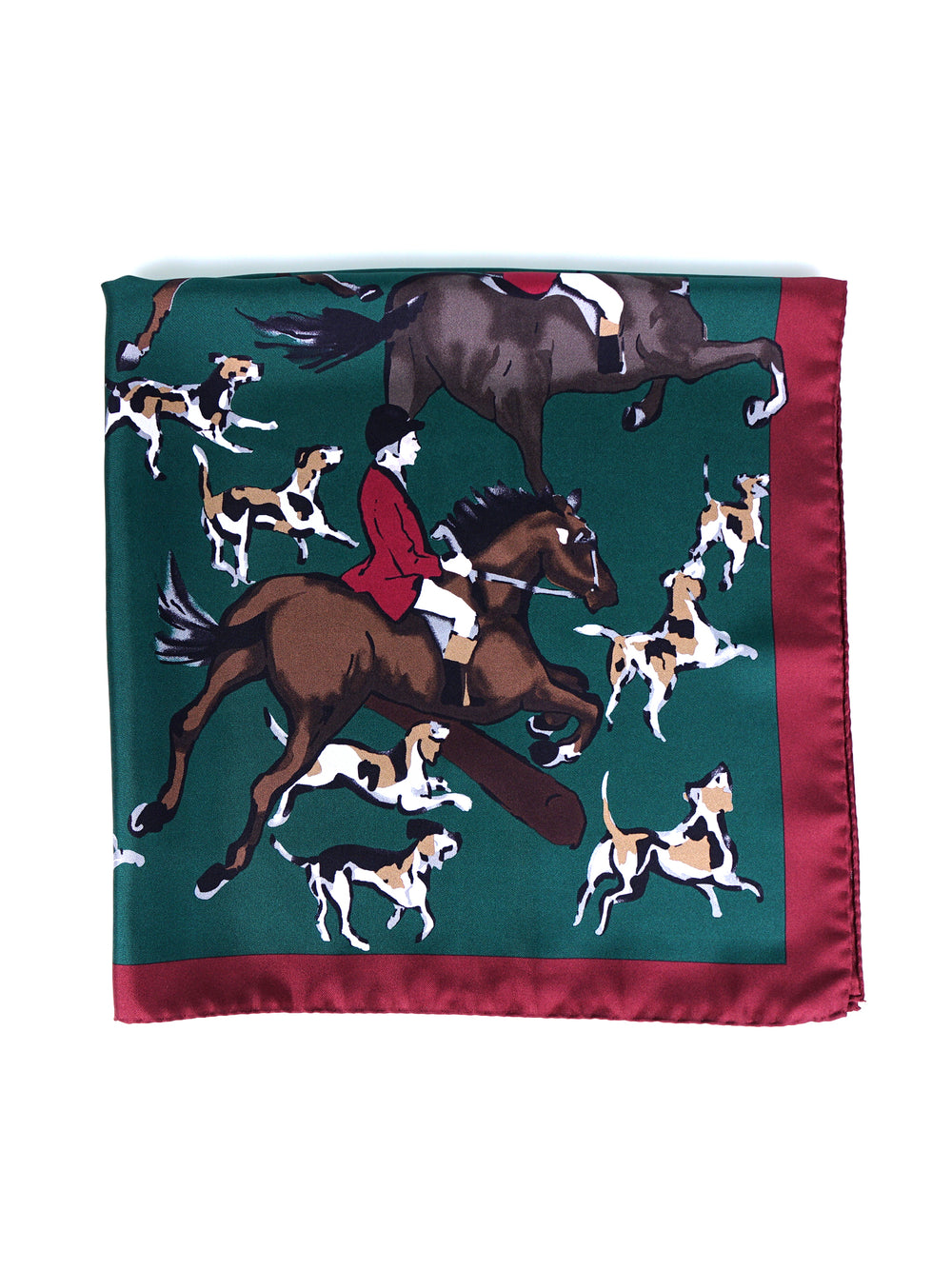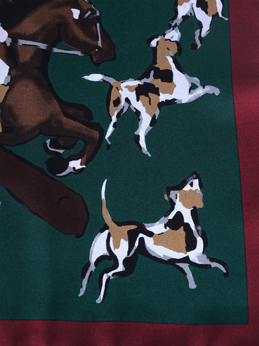 Un accessorio che è un racconto, un pezzo da intenditore che evoca l'eleganza aristocratica e la tradizione delle tenute di campagna inglesi. Questo foulard è realizzato in purissima seta italiana, un tessuto dal drappeggio impeccabile e dalla mano lussuosa. La stampa, una classica scena di "caccia alla volpe", è ricca di dettagli dinamici: cavalieri in giubba rossa, cavalli in movimento e una muta di cani da caccia, il tutto su un profondo fondo verde bosco incorniciato da un ricco bordo bordeaux. È un pezzo iconico, perfetto per l'uomo che ama uno stile che parla di cultura, di passione per la vita all'aria aperta e di un'eleganza non convenzionale.