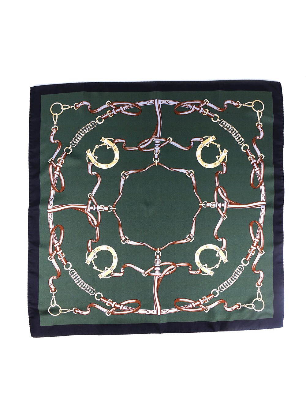 Un accessorio che è una dichiarazione di stile, che evoca un mondo di eleganza aristocratica e di amore per la tradizione. Realizzato in purissima seta italiana, offre un drappeggio fluido e una mano incredibilmente morbida. La stampa, un omaggio all'arte della selleria, intreccia finimenti, morsi e fibbie su un profondo fondo verde bosco, incorniciato da un rigoroso bordo nero. È un pezzo iconico che trascende il genere e le stagioni. La sua misura di 70x70 cm lo rende estremamente versatile, un vero e proprio jolly del guardaroba.