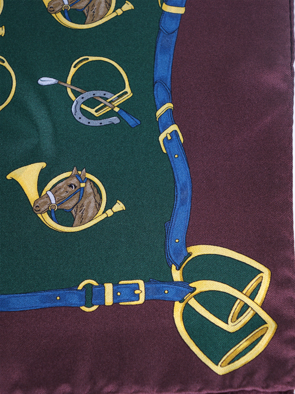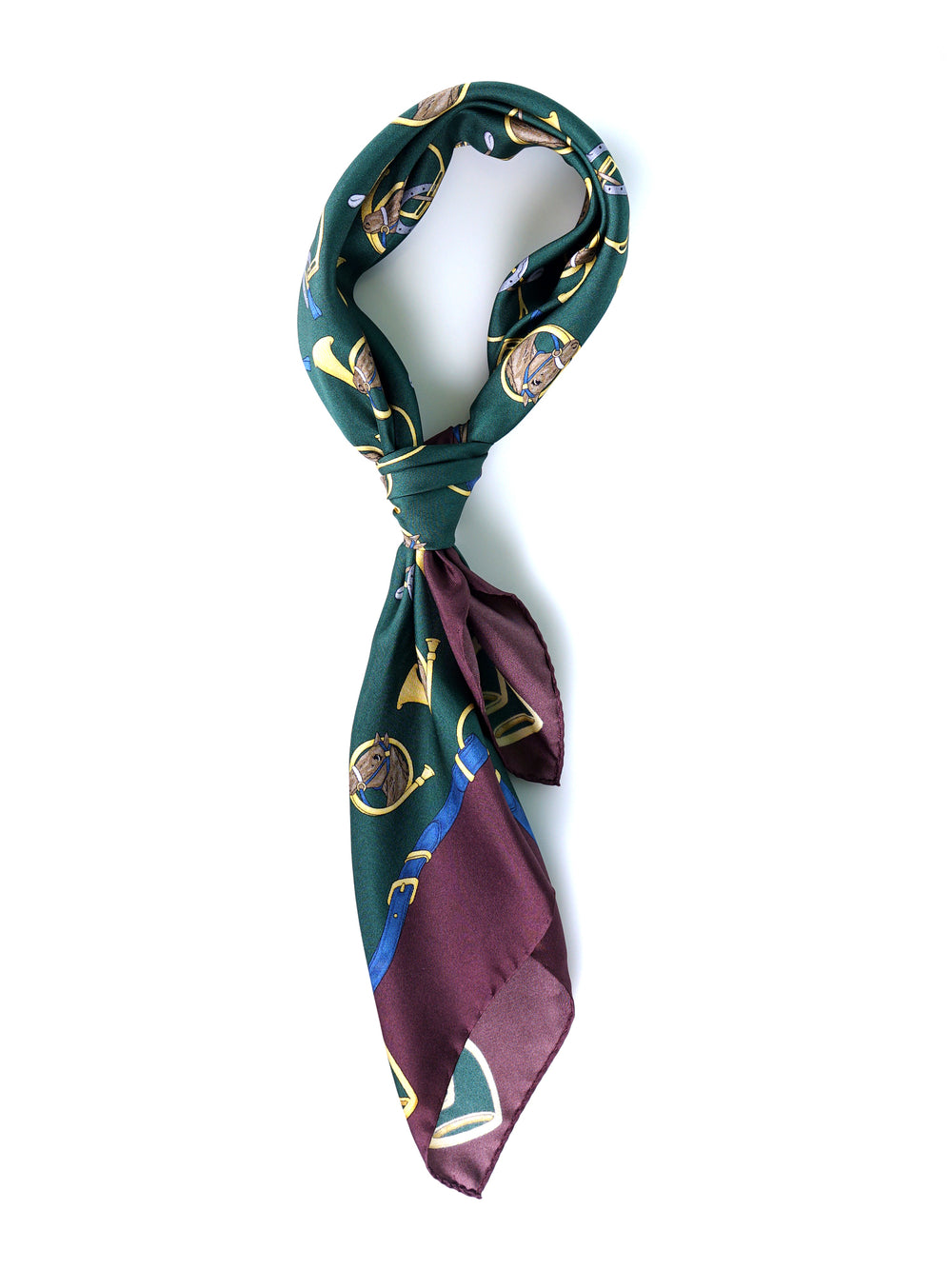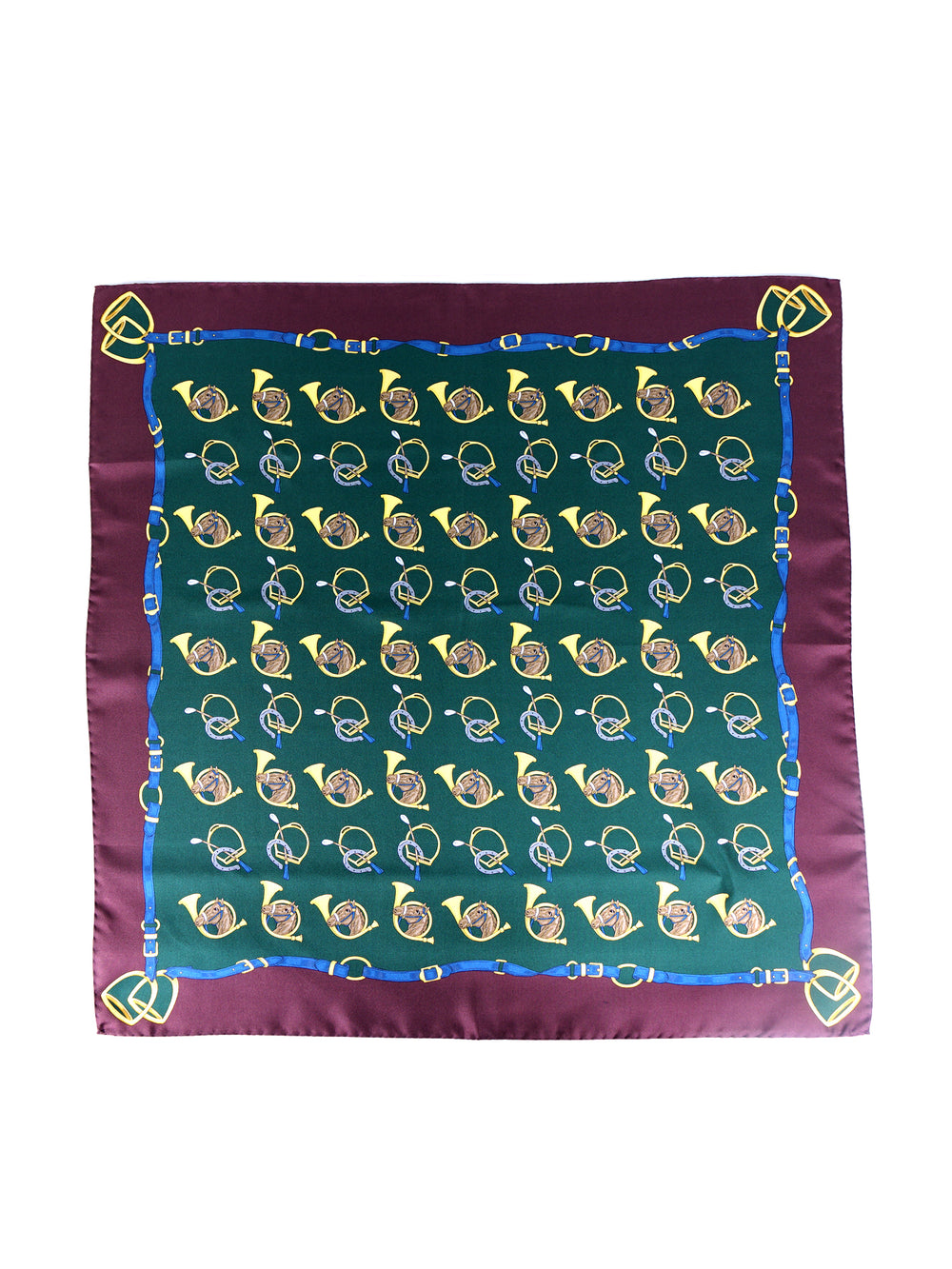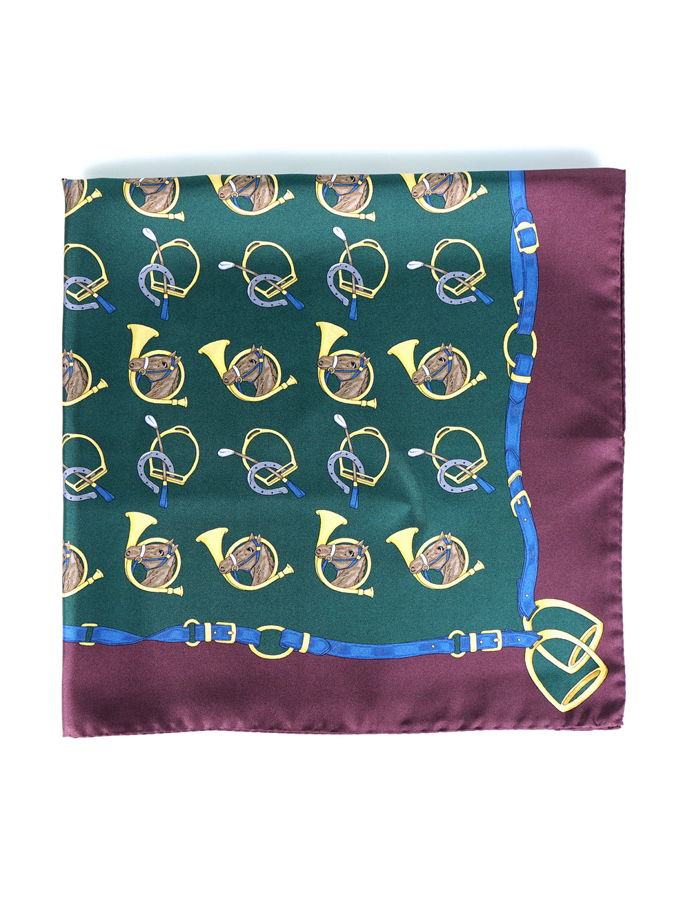 Un accessorio che è un racconto, un pezzo da intenditore che evoca l'eleganza aristocratica e la tradizione della caccia a cavallo. Questo foulard è realizzato in purissima seta italiana, un tessuto dal drappeggio impeccabile e dalla mano lussuosa. Il suo design è un capolavoro di equilibrio: un campo verde bosco profondo è impreziosito da un motivo ripetuto di corni da caccia, teste di cavallo e staffe, il tutto incorniciato da un ricco bordo bordeaux. È un pezzo iconico, perfetto per l'uomo che ama uno stile che parla di cultura, di passione per la vita all'aria aperta e di un'eleganza non convenzionale.