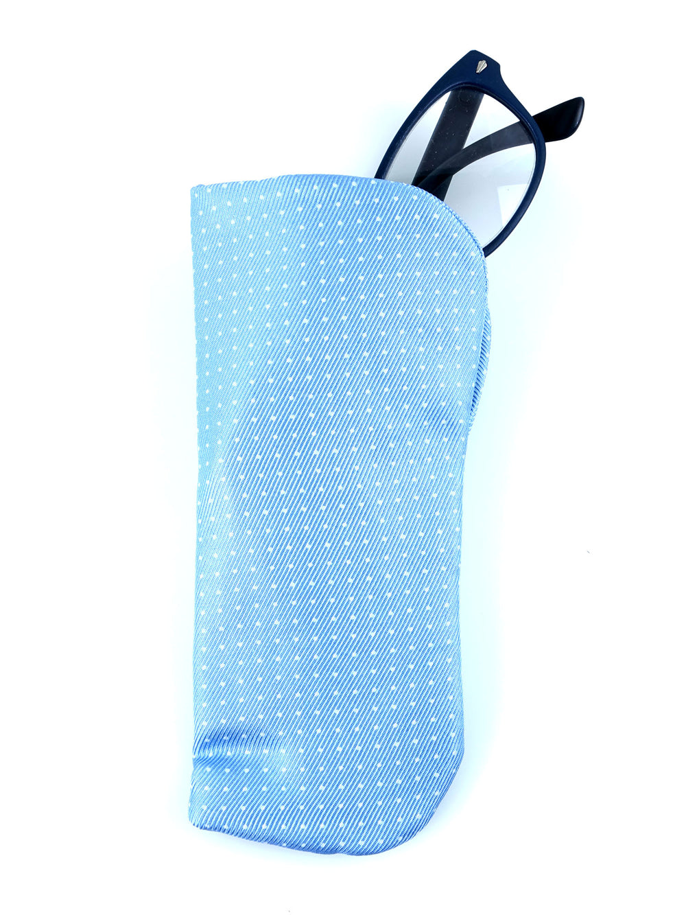 Il portaocchiali Don Mimì in seta azzurra con motivo a puntini rappresenta un connubio di discrezione e raffinatezza, in pieno stile italiano.