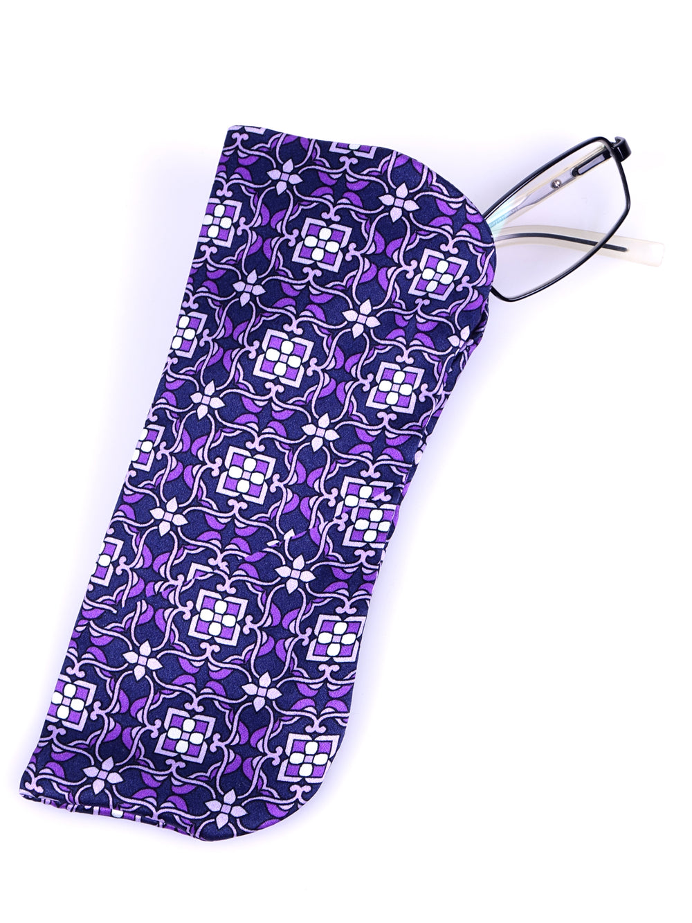 Questo portaocchiali in seta stampata con fondo blu e fantasia floreale lilla e viola è l’accessorio ideale per chi desidera distinguersi con eleganza e personalità.