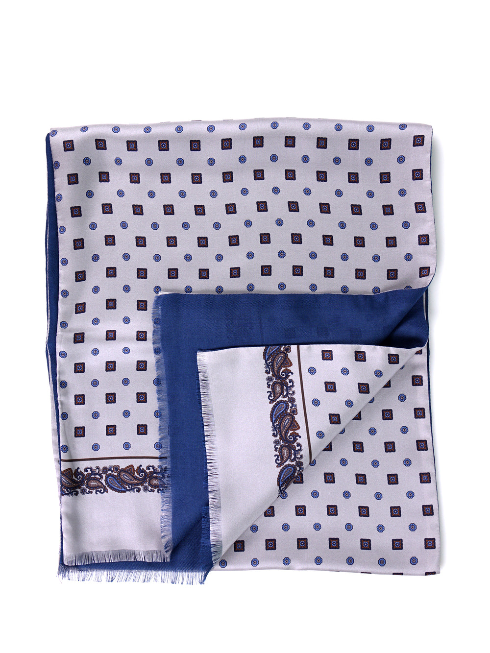 Un investimento in intramontabile eleganza. Questa sciarpa doppiata firmata Don Mimì rappresenta l'assoluta eccellenza della sartoria italiana, unendo sapientemente la lucentezza raffinata della pura seta stampata all'esterno con il calore avvolgente della lana all'interno. Il fondo grigio, impreziosito da un sofisticato e rigoroso motivo geometrico nei toni del blu e del marrone, le conferisce un'allure di prestigio e classe. Un accessorio di altissimo status, pensato per l'uomo che apprezza il rigore formale e non scende a compromessi sulla qualità dei materiali durante i mesi più freddi.
